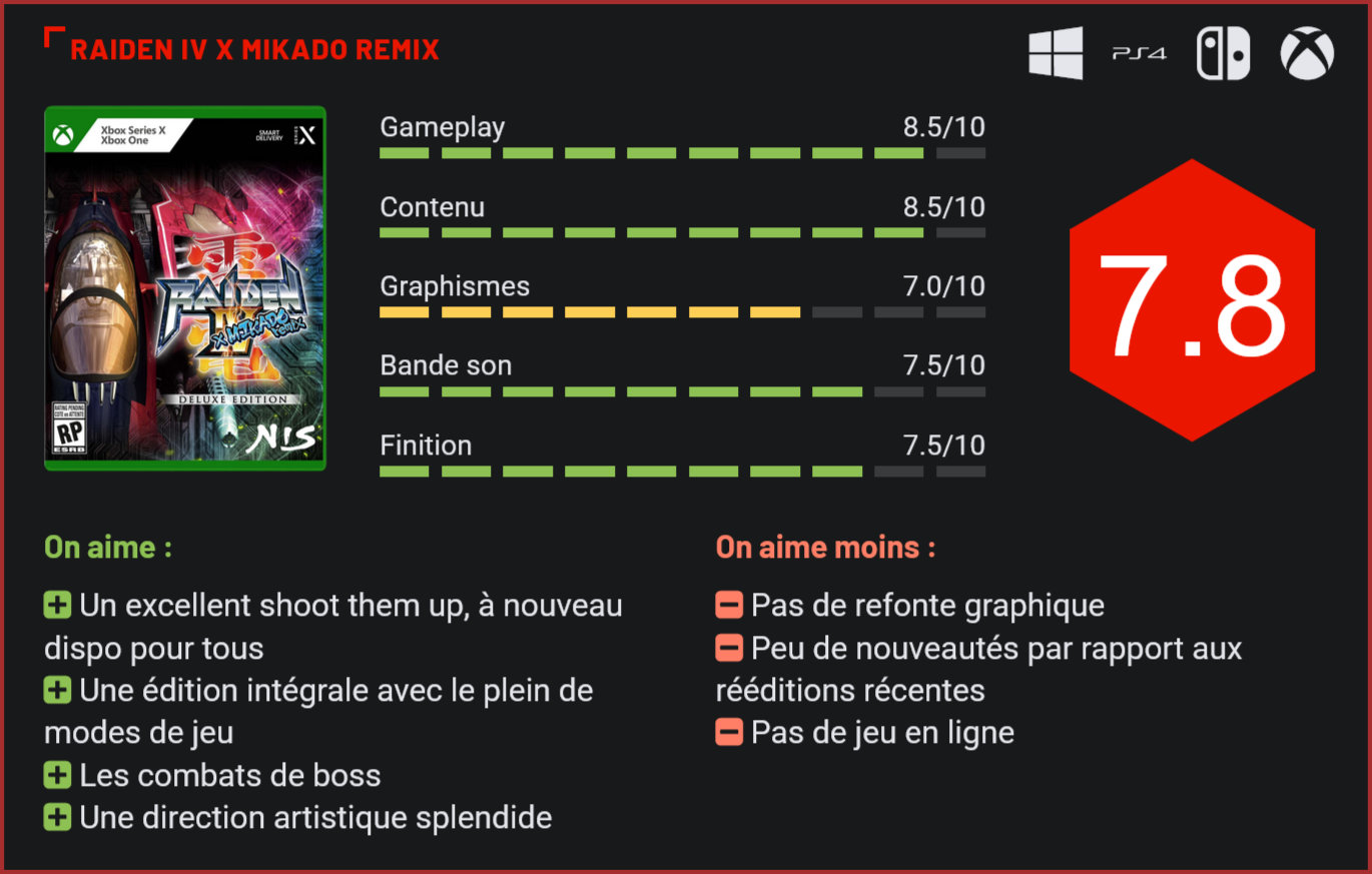 Sortie il y a un moment sur Switch, la compilation Raiden IV x MIKADO remix était passée relativement inaperçue. Sa sortie sur consoles Xbox et PlayStation est l’occasion pour nous de revenir sur ce classique du shoot them up. Parmi les séries les plus légendaires du shoot them up, on citera sans l’ombre d’un doute les DoDonPachi de Cave, les 1942 de Capcom ou encore les Space Invaders de Taito. Moins connue du grand public, la série des Raiden du petit studio Moss est toutefois parvenue à s’imposer comme un must auprès des mordus du genre. Le dernier épisode en date, Raiden V, est sorti en 2016 sur consoles. Si la série ne devrait pas connaitre de nouveau volet avant des années, ses créateurs ont décidé de livrer des rééditions des précédents volets sur tous les supports. Une initiative honorable, d’autant plus que cette version Remix comprend la totalité des modes de jeu supplémentaires et bonus introduits par les différentes versions du jeu. Visuellement, le jeu n’a pas beaucoup changé depuis. Pour ceux qui ne seraient pas familiers avec la série, Raiden IV est un shoot them up futuriste dans lequel le joueur dirige un vaisseau en canardant les vagues d’ennemis qui apparaissent à l’écran. S’il est sorti il y a plus d’une dizaine d’années, et a forcément subi une “dépréciation graphique”, son esthétique en 3D lui confère une apparence unique face aux nombreux shmups en 2D. Plus accessible qu’un “bullet hell shooter” de Cave, Raiden IV n’en reste pas moins exigeant : le rythme de jeu est extrêmement rapide, les boss sont coriaces et certains mécanismes de jeu diffèrent radicalement des autres shmups. D’autant plus qu’on parle ici de la version Remix, sortie en 2014 sur PS3. Si vous y aviez joué sur une autre plate-forme que la Switch et la PS3, vous risquez donc d’être surpris car cette réédition intègre un mode “Overkill” qui réinvente complètement le gameplay du jeu. En l’occurrence, il ne faudra plus se contenter de tuer ses ennemis. Pour décrocher un maximum de points, le jeu vous incite à continuer à canarder les ennemis plus coriaces quand ils sont détruits, pour faire grimper une jauge qui vous attribuera plus de points. Il s’agit d’un mécanisme de scoring nouveau, mais très intéressant puisqu’il fait exploser le facteur risque. Ca peut paraître minimaliste dit comme ça, mais mine de rien, il y a tellement de modes de jeu dans cette réédition qu’on a forcément l’envie de l’explorer et de la réexplorer. Certains ennemis sont titanesques. On retrouve de facto le mode Arcade original, mais aussi le mode Overkill, nouveauté à l’époque de la version PS3, un mode Score Attack, un mode Boss Rush, une Galerie, un système d’enregistrement des parties et un paquet de customisations au niveau de la difficulté et des options de jeu. Ultra-complet, Raiden IV Mikado est une réédition savoureuse et généreuse. Assez étonnamment, Moss n’a toutefois pas retouché à l’esthétique du jeu, qui a un peu vieilli il est vrai. On aurait aimé des graphismes un peu retravaillés. Inversément, le studio propose une nouvelle bande son créé en collaboration avec la salle d’arcade Mikado, et intégrant des morceaux d’artistes renommés. On peut utiliser différentes armes, en plus du blaster de base et de la bombe. Alors oui, les joueurs les plus élitistes y verront toujours un shoot them up trop accessible pour eux, avec un gameplay qui reste très classique (bouton de tir, bombe et direction du vaisseau), oui le jeu intègre un paquet d’options d’accessibilité, mais en mode difficile, avec le mode Overkill, Raiden IV montre un réel potentiel pour les amateurs de scoring. Et puis, il faut l’avouer, son dynamisme reste inégalé. Les combats nous paraissent constamment dantesques et en terme d’immersion, Raiden IV reste un formidable exemple à suivre pour toutes les productions du genre. Outre son système de scoring, le jeu se distingue aussi des autres titres par ses armes variées. La puissance augmente ici à chaque fois que vous récupérez des boites abandonnées par vos ennemis. La couleur de la boite varie, et il faut donc faire attention à ce que l’on choisit, car selon la couleur, l’arme qui vous sera attribuée sera différente. Vous pourrez utiliser des blasters, lasers, ou – et c’est sans doute l’arme la plus originale du jeu -, un rayon destructeur qui adoptera parfois des directions surprenantes. Résolument fun, intense et très stylé, Raiden IV est potentiellement l’une des meilleures portes d’entrée dans le genre pour les néophytes. Conclusion Avec cette réédition de Raiden IV, NiS nous livre la version la plus complète de son shoot them up. Celle-ci intègre un paquet de modes de jeu, dont le mode Overkill, qui n’était disponible précédemment que sur PS4 et repense complètement le système de scoring. S’il est moins élitiste que d’autres shoot them up, Raiden IV reste un shoot them up extrêmement plaisant à parcourir, avec ses combats intenses, ses armes destructrices et son esthétique soignée. Il s’agit d’ailleurs sans doute de l’une des meilleures portes d’entrée dans le genre pour les néophytes. Ultra-complète, cette réédition aura donc le potentiel de réduire deux publics très différents : les néophytes et les passionnés, qui auront l’occasion de redécouvrir le jeu sous un nouveau genre avec le mode Overkill. On regrette toutefois que les quelques ajouts restent mineurs par rapport aux précédentes versions du jeu. Quelques retouches sur le plan esthétique ne lui auraient pas fait de mal. La nouvelle bande son du jeu a toutefois de quoi séduire.