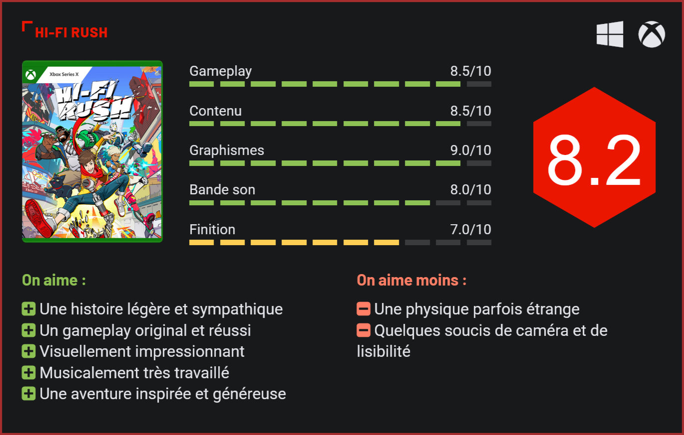 Sorti de nulle part il y a quelques jours, Hi-Fi Rush est le dernier jeu de Tango Gameworks. Une jolie surprise qui change des habitudes du studio plutôt accoutumé aux jeux d’horreurs. Cette nouvelle aventure musicale et colorée n’en reste pas moins une franche réussite. Ce 25 janvier dernier, Xbox ouvrait le bal des annonces pour cette année avec un petit “Developer Direct” qui venait apporter quelques informations sur les futurs jeux de la firme. Parmi ces annonces, on peut compter la présence de Tango Gameworks, le studio fondé par Shinji Mikami (Resident Evil, Devil May Cry…). Les développeurs de The Evil Within et Ghostwire Tokyo ont annoncé, et sorti dans la foulée, un titre à l’ambiance totalement différente : Hi-Fi Rush. Disponible sur PC, consoles Xbox Series et via le Game Pass, il s’agit d’un beat them all qui se démarque en proposant une grosse touche musicale. La direction artistique est une franche réussite. Nous incarnons Chai, un jeune homme qui rêve de devenir une rockstar, mais dont le bras droit est cassé. Il souscrit alors au projet Armstrong, un projet organisé par une entreprise nommée Vandelay qui a pour but d’apporter des améliorations robotiques aux humains. Par un concours de circonstances, son lecteur audio lui tombe dessus durant l’opération. Il se retrouve alors greffé d’un nouveau bras mécanique, mais aussi de son baladeur dans la poitrine. Considéré comme un sujet défectueux, il est pris pour cible par les robots de sécurité, mais également par les membres importants de Vandelay. En rencontrant une jeune femme nommée Peppermint, Chai va se rendre compte que les enjeux sont plus importants qu’il ne l’imaginait. Le jeu garde généralement un ton très léger et utilise beaucoup d’humour, en particulier grâce à l’attitude arrogante de son protagoniste. Si cet aspect peut rebuter, l’intrigue réserve quelques surprises et est tout de même très sympathique à suivre à travers les différents niveaux. En effet, Hi-Fi Rush est divisé en plusieurs stages à la manière d’autres jeux du genre. Ces niveaux sont souvent longs et consistent en des parcours linéaires enchaînant les phases de combat, avec un peu d’exploration et de plate-forme. Si la physique des sauts est un peu capricieuse, le reste de la maniabilité est beaucoup plus réussi. Ces stages proposent parfois de nouvelles phases de jeux qui font varier la formule et qui viennent casser la redondance que l’on pourrait ressentir. Attaquer en rythme permet de réaliser des attaques impressionnantes. L’originalité de Hi-Fi Rush se situe surtout dans son gameplay et dans son principe de combats en rythme. Si les contrôles paraissent basiques de prime abord (avec un bouton d’attaque simple et un bouton d’attaque forte que l’on doit alterner pour réaliser différents combos), le gameplay prend une tout autre dimension si l’on attaque en rythme avec la musique. Appuyer sur les boutons en respectant le tempo permet de réaliser des attaques plus puissantes et de faire grimper le score. Expliquée ainsi, la tâche peut sembler ardue, mais c’est plutôt simple en pratique. Si vous avez du mal à percevoir le rythme de la musique, le titre propose quelques aides visuelles. Il est possible d’activer à tout moment un indicateur en bas de l’écran qui donne précisément le bon timing. Plus subtil, les décors et quelques éléments de l’interface du jeu bougent généralement au rythme de la musique. Un mode facile permet également de simplifier l’aspect “jeu de rythme” du gameplay. Tout un tas d’autres mécaniques viennent s’ajouter au système de combat, tel que la possibilité d’invoquer nos alliés durant quelques secondes. Le système est simple et dynamique, mais cache tout de même une certaine profondeur si l’on utilise tous les outils à notre disposition. Il faut tout de même souligner les quelques soucis de caméra et de lisibilité, même si ceux-ci impactent rarement les combats. Entre les niveaux, nous passons du temps dans notre planque. L’occasion de nous entretenir avec les autres personnages, mais aussi de dépenser notre précieuse monnaie dans de nouvelles attaques ou dans des améliorations diverses pour Chai. Nous avons également accès à un mur qui se remplira d’illustrations en réalisant de petits objectifs sur le long terme. La formule est classique pour un jeu du genre, mais diablement efficace grâce à ses idées neuves. Les combats de boss sont des moments très intenses. Si ce n’était pas suffisant, Hi-Fi Rush propose aussi une direction artistique très réussie. Évidemment, beaucoup d’efforts ont été fournis sur le sound design, la bande-son et les multiples chansons proposées. C’est principalement du rock et ses nombreux sous-genres qui viennent rythmer les différents niveaux du jeu. Certaines des chansons sont des morceaux sous licence, mais le titre propose aussi un “mode streamer” avec des chansons originales. Enfin, Hi-Fi Rush propose plusieurs doublages, dont un en français de très bonne facture. Visuellement aussi, le jeu se montre particulièrement efficace. Un rendu que l’on croirait tout droit sorti d’un dessin animé. Le tout bouge bien et est très coloré, les personnages sont très expressifs et la mise en scène ne manque pas de créativité. Hi-Fi Rush est un titre qui se termine peut-être un peu vite. Une grosse dizaine d’heures sont nécessaires à la complétion de l’aventure, et si cela est bien suffisant pour exploiter tout ce que le jeu offre, nous n’aurions pas craché sur un peu plus de contenu. Malgré tout, sa personnalité et ses idées ingénieuses en font un jeu généreux et une très belle surprise. Conclusion Arrivé du jour au lendemain, Hi-Fi Rush est le nouveau jeu de Tango Gameworks et de Bethesda, disponible dès à présent sur PC, Xbox Series et sur le Game Pass. Bien loin des habitudes du studio, ce n