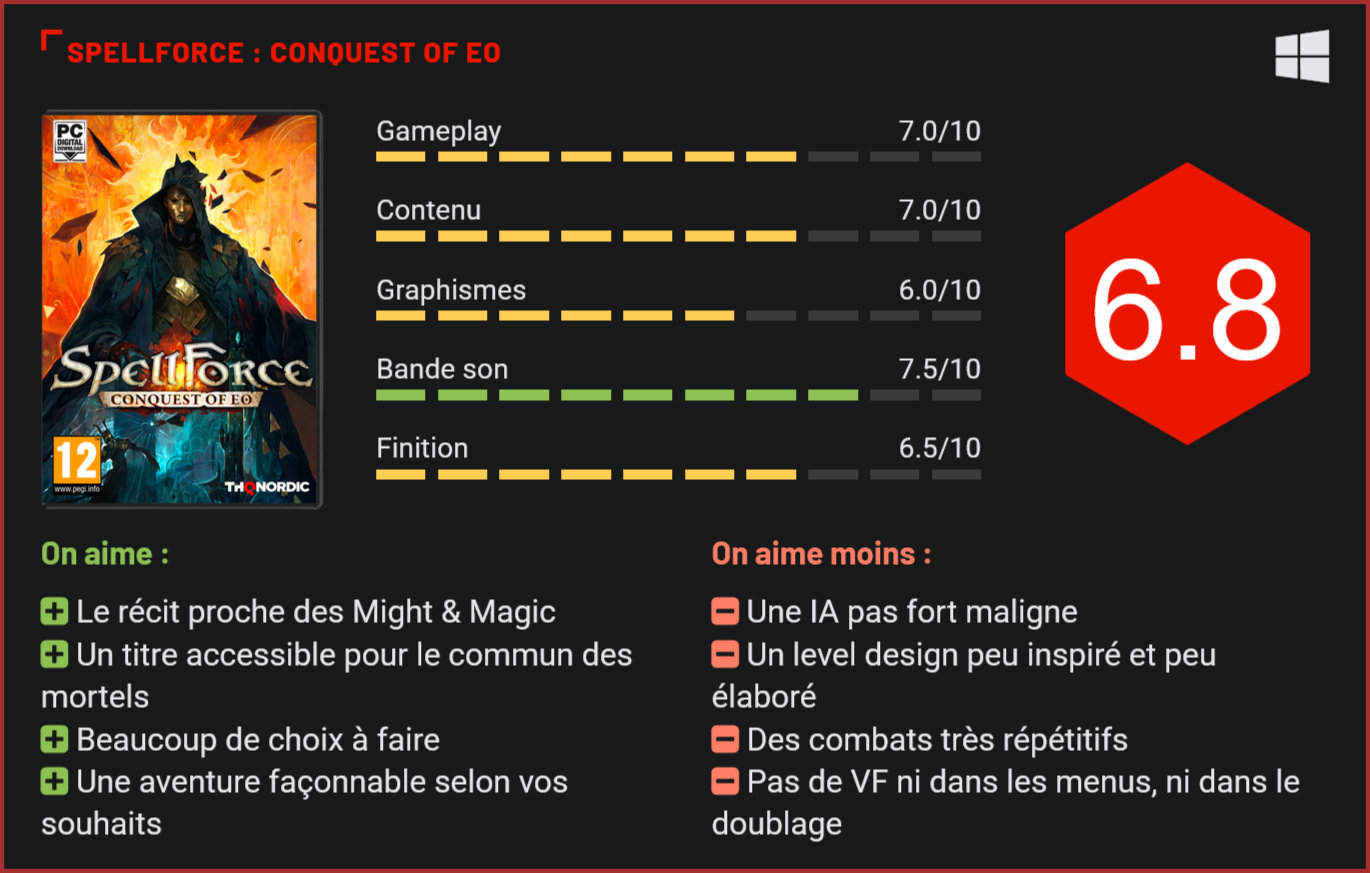 Six mois après la sortie remarquée de SpellForce III, THQ Nordic nous gratifie d’un nouvel ajout à la franchise avec Conquest of Eo. Un pari réussi, mais qui aurait mérité un bien meilleur traitement. Voilà déjà 20 ans que la franchise SpellForce existe. Beaucoup moins connue et populaire que les Civilization et autres 4X, la saga créée par Phénomic Game Development et Encore, Inc en 2003 est parvenue à se forger une solide base de fans qui, après deux décennies, sont restés fidèles à cet univers enchanteur. Ayant toujours privilégié le côté RPG et RTS de la chose, la franchise s’éloigne quelque peu de ce qui faisait son essence avec Conquest of Eo, en privilégiant la stratégie au détriment du rôle-playing. Explications. Avec Conquest of Eo, la franchise SpellForce vous donne la possibilité d’incarner un héros qui aura choisi entre l’une des trois classes proposées, à savoir Nécromancien, Artificier et Alchimiste. Le premier privilégie la magie et une armée de morts-vivants, l’alchimiste conçoit fioles explosives et potions tandis que le dernier crée des objets magiques pour équiper ses unités. Trois classes différentes donc, mais un seul et même objectif : poursuivre la quête de votre maître qui consiste en la recherche de la source de magie ultime, le Feu éternel. Proche d’un 4X, Conquest of Eo se laisse très facilement prendre en main. L’avantage avec Conquest of Eo est que vous allez, en quelque sorte, pouvoir façonner votre propre expérience de jeu. C’est-à-dire que plusieurs cartes du monde différentes s’offrent à vous en début de partie, chacune représentant un niveau de difficulté. Libre à vous également de combiner plusieurs conditions de victoires pour façonner la meilleure expérience personnelle possible. Autant de possibilités qui font que chaque nouvelle partie que vous ferez sera légèrement différente des précédentes. Mais ne vous leurrez pas. L’histoire restera la même quelle que soit l’orientation que vous donnerez à votre aventure. Un peu à la manière d’un Civilization, les ressources jouent un rôle-clé dans SpellForce. Depuis la tour de votre maître (qui vous sert de QG), vous pourrez récupérer de l’or, amasser des points de recherche ou encore créer de nouvelles unités ou objets. Tout cela dans le but d’améliorer vos forces de morts-vivants, de confectionner des potions toujours plus puissantes ou créer des glyphes pour permettre à vos unités de gagner en force. Vous l’aurez compris : votre but est de gérer la tour et les ressources qui y sont puisées, tandis que vos unités défendent vos intérêts sur le champ de bataille ou récupèrent elles-mêmes des ressources. Un scénario agréable, un univers payant, mais une répétitivité lassante. Les combats se jouent au tour-par-tour, comme dans tout bon 4X qui se respecte. Les affrontements fonctionnent selon le principe des points d’action, mais rassurez-vous : le jeu reste assez facile à prendre en main pour n’importe quel néophyte qui s’y frotte. Certes, les affrontements peuvent vite s’envenimer si vous ne prenez pas les bonnes décisions. Mais (mal)heureusement, le peu d’intelligence de l’IA fait qu’il est rapidement possible de rattraper le coup et de l’emporter. Les combats sont plutôt dynamiques, mais pâtissent d’une certaine répétitivité. En effet, le nombre d’unités disponibles n’est, d’une part, pas très élevé, puisque entre quatre et huit unités sont déployées lors des batailles. Celles-ci sont rapidement expédiées, un peu trop à notre goût d’ailleurs, et s’enchaînent vraiment vite sans qu’on ait vraiment le temps de s’y attarder. Si le gameplay s’inspire énormément des 4X à la Civilization, le scénario, lui, s’apparente réellement à un Heroes of Might & Magic. Très réussi, il nous embarque dans une aventure très heroic fantasy, et le monde du Royaume d’Eo est bien imprégné de cette patte fantastique. En revanche, si les décors sont plutôt jolis, sans être époustouflants, force est d’admettre qu’ils ne fourmillent pas vraiment de détails ni d’éléments. Dommage, car l’univers de l’heroic fantasy a de quoi faire rêver. Les décors ne sont pas vraiment riches en éléments ou détails. La bande son est, quant à elle, plutôt agréable à l’oreille. Les mélodies s’accordent plutôt bien au jeu et à la situation en cours. On regrettera en revanche que le jeu ne dispose d’aucune traduction française, et notamment au niveau du doublage. Il faudra faire avec des voix originales et aucun sous-titres francophones. Difficile à aborder donc pour des non-initiés à la langue de Shakespeare. Les menus ne sont également pas traduits en français, un véritable coup dur pour les francophones. Conclusion Conquest of Eo ne fait assurément pas partie du top 3 des meilleures entrées de la franchise SpellForce. Néanmoins, il s’agit d’une bonne porte d’entrée dans la saga pour les néophytes qui n’en ont jamais entendu parler. L’univers est grisant et le scénario très agréable à suivre. L’aspect RPG mis de côté au détriment d’un gameplay à la Civilization, Conquest of Eo semble avant tout avoir été pensé pour les personnes qui n’ont jamais touché à un SpellForce de leur vie. Les affrontements sont très faciles à prendre en main, mais se concluent beaucoup trop vite. Il n’y a qu’entre 4 et 8 unités sur un champ de bataille, ce qui peut s’avérer très peu pour un jeu de stratégie. La difficulté est parfois de mise, mais la stupidité de l’IA permet heureusement à tout un chacun de s’essayer à Conquest of Eo. Nous évoquions l’excellent univers du soft, nous regrettons toutefois qu’il n’ait pas suffisamment été exploité dans la construction des niveaux, beaucoup trop fades à notre goût. Cependant, malgré une VF totalement absente qui pourrait en rebuter plus d’un