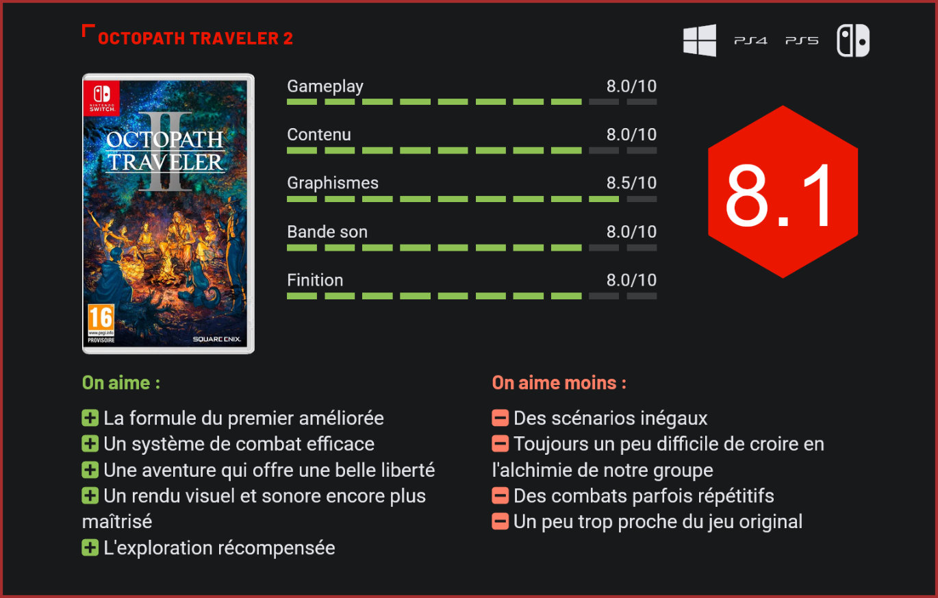 Sorti en 2018, Octopath Traveler était la nouvelle licence de Square Enix qui a introduit le fameux style “HD-2D” que l’éditeur apprécie tant aujourd’hui. Une suite sera proposée dans quelques jours seulement, l’occasion de voir si la formule a su se renouveler. Les consoles Playstation, Switch et les PC accueilleront très prochainement Octopath Traveler 2, la suite du JRPG à succès. En effet, le premier épisode s’est tout de même écoulé à plus de trois millions d’exemplaires, un chiffre plutôt respectable pour un jeu du genre, ce qui a sans doute convaincu Square Enix et le studio Acquire de faire durer le plaisir. La série a fait un passage sur mobile avant d’annoncer un nouvel épisode il y a quelques mois. Octopath Traveler 2 reprend le concept du premier jeu tout en améliorant la formule. Tout comme un Final Fantasy, il est inutile de connaître le premier épisode pour se lancer dans ce deuxième jeu puisque les personnages et l’univers sont totalement différents, mais le principe reste le même. L’intrigue se déroule dans le monde de Solistia, un endroit divisé en deux grands continents séparés par la mer. Le concept du premier Octopath Traveler est ici de retour, nous suivons les histoires de huit personnages différents provenant des quatre coins de ce monde. Au choix, nous pouvons incarner Hikari, le second prince du royaume de Koù ; Agnéa, la danseuse qui veut devenir une star ; Partitio, le marchand qui veut voir du pays ; Osvald, un érudit accusé à tort du meurtre de sa femme et de sa fille qui part en quête de vengeance ; Temenos, un prêtre qui se retrouve mêlé à une sombre affaire en rapport avec l’Église ; Throné, une voleuse membre d’un clan de criminels en quête de liberté ; Ochette, une chasseresse dont l’île natale est menacée par une calamité mystérieuse ; Castti, une apothicaire amnésique qui voyage pour retrouver ses souvenirs. Cette nouvelle aventure bénéficie d’un meilleur travail sur sa mise en scène. Le premier personnage choisi fait office de protagoniste, tandis que les autres peuvent être recrutés en allant les chercher dans leur village. Une fois le prologue du premier personnage terminé, le titre nous laisse aller dans la direction voulue, nous pouvons alors explorer le monde assez librement et recruter les différents personnages dans l’ordre souhaité. Octopath Traveler 2 va tout de même nous guider en nous donnant un niveau conseillé pour chaque zone, mais c’est souvent la seule limite à notre exploration. Une fois un personnage recruté, la carte nous indique où se trouve la suite de son histoire. Grâce à son concept, le titre offre une belle liberté puisqu’il est possible de réaliser les différents objectifs dans l’ordre voulu. Nous parcourons l’histoire de chacun des personnages, certaines plus intéressantes que d’autres. La proposition est originale et permet une autre approche pour le genre. Les intrigues sont cependant toujours très déconnectées les unes des autres et seul le personnage concerné est important durant ces moments. Un défaut déjà présent dans le premier jeu, qui est un peu atténué ici grâce à quelques interactions optionnelles qu’il est possible de déclencher ainsi qu’à des chapitres qui lient deux personnages du groupe. Si quelques efforts ont été faits à ce sujet, le résultat n’est pas entièrement convaincant, mais permet de donner un peu plus l’impression que les membres du groupe forment une véritable équipe. Le système de combat reste très similaire à celui du premier jeu. JRPG au tour par tour, les combats se déroulent classiquement. Tout comme le premier jeu, Octopath emprunte quelques idées au système de combat de Bravely Default. Nos personnages accumulent des Points d’Exaltations que l’on peut ensuite dépenser pour multiplier la puissance de notre action durant ce tour. Ce deuxième jeu reprend également le système de “faille” qui déstabilise les ennemis lorsqu’ils sont attaqués un certain nombre de fois grâce aux armes ou aux éléments auxquels ils sont faibles. Exploiter ce système permet de remplir notre réserve d’énergie qui, une fois complète, peut lancer une action dévastatrice. Si chacun des personnages possède son rôle en combat, la suite du jeu permet d’apporter un peu de flexibilité au système et d’avoir plus de liberté. Le système est complet et sympathique à jouer, même si les nombreux combats aléatoires ne sont pas toujours très intéressants. Il faut surtout attendre d’affronter les boss pour que les combats puissent montrer leur plein potentiel. En dehors des affrontements, nous évoluons dans différentes zones où l’exploration est bien récompensée par des objets ou des améliorations pour nos personnages. Il est possible de visiter de nombreuses villes et de s’entretenir avec leurs habitants. Chacun de nos personnages possède deux actions qu’ils peuvent réaliser avec les personnages non-joueurs. Partitio le marchand peut par exemple leur acheter des objets, tandis que Hikari peut croiser le fer et apprendre de nouvelles techniques. Certaines histoires sont plus dramatiques que d’autres. Bien entendu, le titre impressionne visuellement grâce à l’utilisation du style “HD-2D” qui a déjà fait ses preuves dans le premier jeu ainsi que dans Triangle Strategy et le remake de Live A Live. On peut cependant y voir quelques améliorations, notamment dans la mise en scène qui parvient à jouer un peu plus avec sa caméra, et le résultat est toujours aussi convaincant. Ce mélange de 2D pixel art et d’effets visuels en 3D donne un rendu rétro et moderne à la fois, et sublime certains lieux de Octopath Traveler 2. Cette présentation plus travaillée est aussi accompagnée d’un doublage, en anglais ou en japonais, qui continue d’apporter de la vie à l’ensemble. Du côté des musiques, ce deuxième épisode propose une