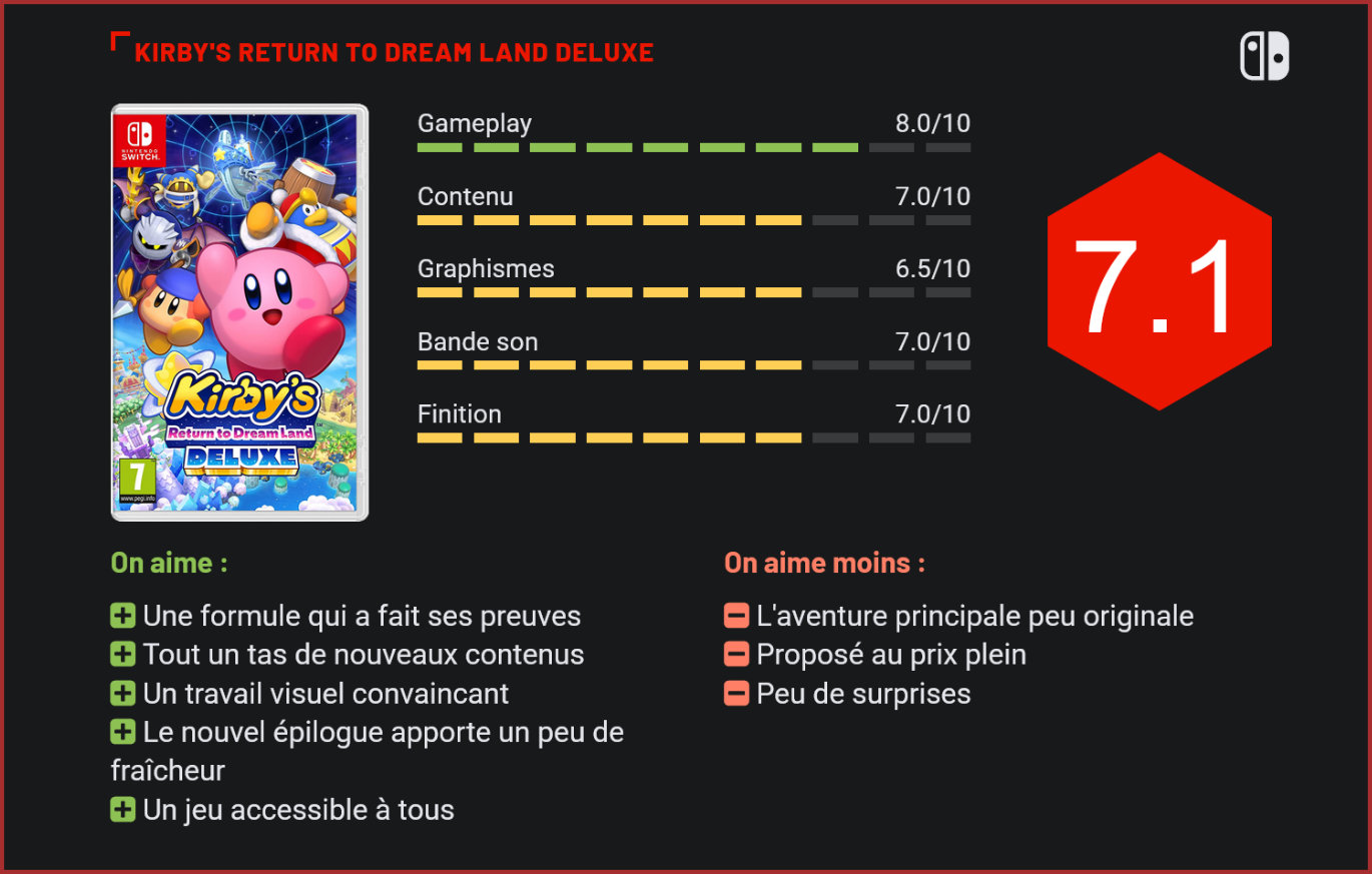 Dans quelques jours, Nintendo et HAL Laboratory nous proposeront de nous replonger dans Return to Dream Land, l’épisode de Kirby sorti sur Wii en 2011. Cette nouvelle version Deluxe amène également tout un tas de nouveaux contenus, dont quelques idées intéressantes. Plutôt connu chez nous sous le nom de “Kirby’s Adventure Wii”, Return to Dream Land marquait le retour des jeux de la licence de Nintendo sur console de salon. À l’époque, Kirby était surtout présent sur Game Boy Advance et Nintendo DS. La boule rose a presque fait faux bond à la Gamecube puisque seul un spin-off (Air Ride) s’était illustré sur la console. Cette aventure sur Wii est venue corriger le tir et a installé durablement la formule qui allait être suivie pour les jeux suivants. Cette nouvelle version Deluxe propose de revivre cette épopée avec une nouvelle présentation et un peu plus de contenu. Return to Dream Land Deluxe propose une aventure Kirby plutôt classique. Alors que tout est normal sur Popstar, un vaisseau volant apparaît subitement d’un portail mystérieux. L’engin vient s’écraser sur la planète, ce qui attire l’attention de Kibry, Meta Knight, Bandana Waddle Dee et du Roi Dadidou. À l’intérieur, ceux-ci découvrent la présence de Magolor, un alien qui pilotait le navire. Le rescapé demande alors aux héros de l’aider à retrouver les cinq parties du vaisseau qui se sont décrochées durant la chute, promettant en récompense un voyage sur sa planète natale. Grâce à son grand cœur, Kirby n’hésite pas un seul instant et part traverser plusieurs environnements pour reconstruire le vaisseau. Il n’en faut pas plus pour nous lancer dans l’aventure principale. Le scénario est évidemment très léger, une habitude pour la série. Cette version Deluxe a, avant tout, droit à un véritable lifting visuel. Le style graphique propose quelque chose d’un peu différent en utilisant du cell-shading sur les personnages et en changeant un peu les couleurs des niveaux d’origines. Beaucoup plus de détails ont été ajoutés sur les décors, à la fois au premier plan et à l’arrière-plan. La refonte est très satisfaisante, les niveaux sont toujours aussi colorés et les personnages toujours très expressifs. Les musiques ne semblent pas avoir été retouchées, mais le résultat reste convaincant. Les mini-jeux apportent un peu de diversité. Divisée en niveau, l’aventure principale du jeu se déroule très classiquement. Le titre se joue entièrement sur un plan 2D dans des niveaux d’action et de plateforme où nous contrôlons Kirby qui peut aspirer les ennemis pour obtenir des nouveaux pouvoirs. Les différents stages offrent des passages cachés où nous pouvons trouver des sphères d’énergies, des collectables permettant d’accéder à du contenu annexe. Certaines phases de jeu nous donnent accès à des pouvoirs renforcés et spectaculaires, mais leur utilisation est limitée à de courts passages. L’aventure n’est pas bien compliquée, et propose même un mode accessible pour les plus petits. Il est également possible de faire l’entièreté du jeu à plusieurs, les autres participants contrôlent alors, au choix, un autre Kirby, Meta Knight, Bandana Waddle Dee ou le Roi Dadidou. L’aventure est satisfaisante à parcourir et les fans de la boule rose ne seront pas dépaysés. Si traverser ce scénario principal ne prend pas plus de six ou sept heures, Return to Dream Land Deluxe propose d’autres activités qui viennent gonfler la durée de vie. Cette aventure propose déjà quelques défis annexes ouverts lorsque l’on obtient une certaine quantité de sphères d’énergies, mais elle nous donne aussi très vite accès au Parc Magoland. Il s’agit d’un espace en 3D qui nous permet d’accéder à l’une des nouveautés de cette version Deluxe : des mini-jeux. Une dizaine d’activités sont jouables seuls ou à plusieurs, on y retrouve quelques épreuves iconiques de la série telles que “Kirby samouraï”. Ce parc, dont les décorations évoluent au fil du jeu, propose également tout un tas d’objectifs qui débloquent des masques à l’effigie de différents personnages de la série que notre personnage peut porter. Enfin, on peut aussi citer l’arène qui nous donne l’occasion de combattre à nouveau les différents boss ainsi que le mode Extra qui propose de parcourir l’aventure principale dans une version plus difficile. L’aventure de Magolor est sans doute le nouveau contenu le plus intéressant de cette version Deluxe. Le véritable plus de cette nouvelle version vient d’un épilogue inédit tournant autour du personnage de Magolor. Déblocable une fois l’aventure terminée, ce petit mode de jeu se déroule à la suite et nous montre le point de vue de ce personnage, en nous permettant de le contrôler directement. Cette nouvelle aventure nous propose de parcourir de nouveaux stages avec Magolor qui se trouve particulièrement affaibli au départ. Notre but est alors de collecter un maximum de “points de magie” dans les niveaux, qui peuvent ensuite être investis dans des améliorations des pouvoirs de notre personnage. Cet épilogue propose alors une progression tout à fait différente de ce qu’offrent généralement les jeux Kirby. Ce mode réutilise beaucoup d’éléments du reste du jeu, mais permet de faire du neuf avec du vieux et d’apporter un petit peu de challenge. Un vent de fraîcheur qui donne véritablement envie d’en voir plus, malheureusement ce mode de jeu se termine en à peine deux ou trois heures. S’il se montrait déjà convaincant à l’époque, Return to Dream Land est ici proposé dans sa meilleure version. La formule est toujours aussi efficace malgré qu’elle soit aujourd’hui devenue trop familière. Les ajouts de contenu ne rendent pas forcément cette version indispensable si vous connaissez déjà l’original, mais proposent des nouveautés très conv