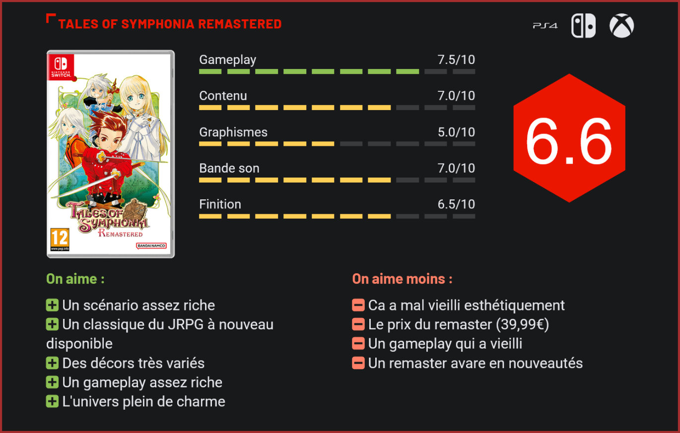 Sorti en 2003 au Japon et en 2004 en Occident, Tales of Symphonia est toujours considéré aujourd’hui comme l’un des grands classiques du JRPG. La sortie d’un remaster sur les consoles de dernière génération n’était qu’une question de temps. Aussi étonnant que cela puisse paraître, Tales of Symphonia est probablement l’un des JRPG qui a eu droit au plus grand nombre de rééditions et de remasters depuis sa sortie. Sorti en 2003 au Japon, il ne sera commercialisé en Occident que l’année suivante. Sorti initialement sur Gamecube, le jeu a droit à une réédition un an plus tard sur PlayStation 2, avec du contenu inédit en prime. Une suite voit le jour en 2008 sur Wii, mais ne remporte pas le même succès. En 2013, Namco Bandai sort un remaster des deux premiers volets dans une compilation qui voit le jour sur PS3. La compilation en question débarque ensuite sur PC trois ans plus tard… Et en 2022, Namco Bandai annonce la sortie d’un remaster du titre sur toutes les machines. Visuellement, le jeu n’a pas trop bien vieilli… Et il fallait s’en douter, ce nouveau remaster n’ajoute pas beaucoup de nouveautés par rapport à la version sortie en 2013. En réalité, il s’agit même d’une version écrémée de la moitié de son contenu puisque la suite du jeu, sortie en 2008, ne fait pas partie du lot. Il faudra se contenter de l’épisode originel, de 2003. Et si un travail a été réalisé au niveau de l’affichage – en HD – et des modèles de personnages, plus fins qu’à l’époque, le flou reste ultra-présent, les décors sont atrocement vides et le frame-rate a tendance à chanceler. Le jeu tourne aux alentours de 30 images par seconde alors que l’original tournait en 60 images par seconde… Il ne faudra pas compter non plus sur de nouveaux contenus inédits, donjons ou boss. Ce remaster est un remaster très classique, pour ne pas dire un simple portage. Vous comprendrez dès lors notre déconvenue à la découverte du prix de 39,99€. Le scénario est narré à travers de multiples cinématiques. Pour autant, ce serait une erreur de passer à côté de cette réédition si vous aimez les JRPG. Car de facto, Tales of Symphonia reste un incontournable du genre. Le jeu séduit avant tout par la richesse de son univers. Dans ce Tales of, les joueurs incarnent Lloyd Irving et sa petite bande d’aventuriers, qui vont devoir partir à la découverte des mondes de Sylvarant et Tethe’alla et sauver l’univers. La particularité de ce monde, c’est que la destruction de l’un entraine la destruction de l’autre. Avec ses personnages charismatiques, ses enjeux complexes et sa ligne narrative joliment mises en avant, Tales of Symphonia a des relents épiques qu’on ne retrouve plus aujourd’hui dans les RPG modernes. Côté gameplay, le jeu de Namco brille par son mélange de genres. Le jeu enchaine combats, exploration, résolution d’énigmes, cinématiques et affrontements de boss. Les séquences de jeu sont assez variées pour qu’on ne s’ennuie pas et surtout, le titre arrive à brillamment se renouveler, tant dans son bestiaire que son univers. Certes, on pourra lui reprocher des puzzles qui restent un peu trop simplistes – la plupart du temps, il s’agira de déplacer des blocs – et des affrontements moins tactiques que dans d’autres JRPG, et pour cause puisque le jeu prend la forme d’un jeu de combat en 2D durant ces séquences, avec un style proche d’un Kingdom Hearts. Le jeu parvient toutefois à briller après quelques heures avec un système de combos très efficace et son équipe de combat, qui force le joueur à essayer plusieurs combinaisons au niveau de son squad. La formule fonctionne très bien et les fans de Golden Sun et Ys devraient y trouver leur compte. Il n’empêche que tant au niveau du gameplay que de la technique, Tales of Symphonia a mal vieilli. On aurait dès lors aimé que Namco Bandai retravaille davantage l’esthétique du jeu et revoie potentiellement certains éléments du gameplay plus en profondeur. Une chose est sûre : la série a fait beaucoup de chemin depuis. Et il est probablement préférable de démarrer avec l’excellent Tales of Arise si vous en avez l’occasion. Conclusion Sorti en 2003 sur Gamecube, Tales of Symphonia fait partie de ces classiques du JRPG qui méritaient à juste titre une cure de jouvence. Si le jeu exerce toujours un certain charme, il n’a malheureusement pas eu droit à un gros travail de remasterisation. Il faudra se contenter de visuels en HD et de quelques petites améliorations, principalement visuelles. En 20 ans, le jeu a toutefois mal vieilli. L’esthétique est pauvre et très floue, le gameplay est vieillot et on ne note aucune nouveauté au niveau du contenu… Pour autant, les fans seront sans doute ravis de pouvoir redécouvrir ce classique du jeu de rôle, si résolument old-school dans sa conception, qui alterne exploration, combats et puzzles avec vigilance et brille par la richesse de son univers. A 39,99€, l’addition est un peu salée. Mais quand on aime, on ne compte pas?