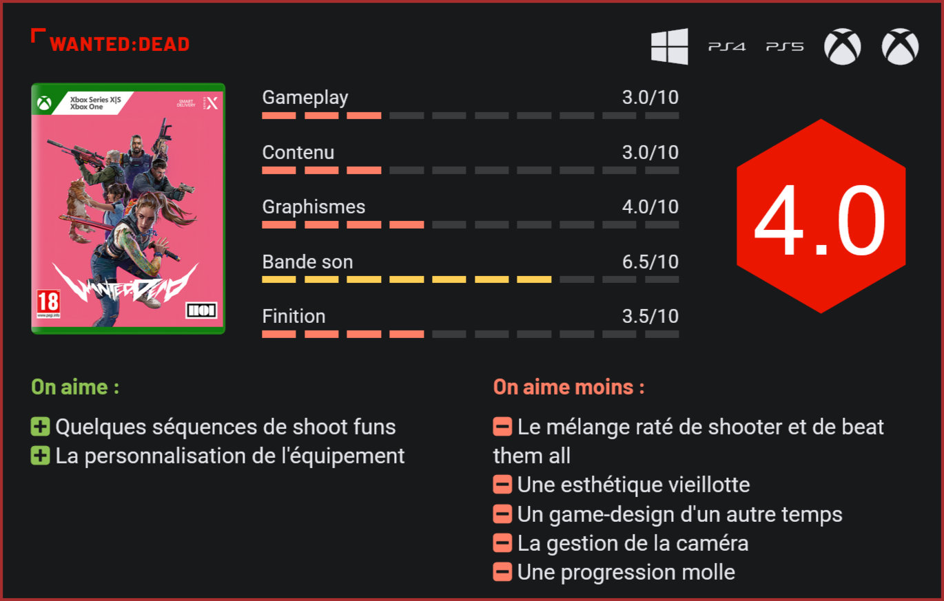 Développé par des anciens de la Team Ninja, Wanted: Dead était attendu par certains comme le messie. Le jeu de Soleil peine toutefois à convaincre… Fondé par d’anciens de chez la Team Ninja (Dead or Alive, Ninja Gaiden), le studio Soleil nous avait livré quelques petits jeux sans grande ambition jusqu’ici, comme la dernière adaptation de Samurai Jack ou Ninjala. Il livre avec Wanted: Dead son premier “gros jeu”. La partie shooter est correcte. Sur le papier, Wanted: Dead avait tout pour séduire. Avec son esthétique léchée, son ultra-violence et son casting badass, le titre s’annonçait comme un festival gore. Le scénario du jeu nous fait découvrir un Hong-Kong dystopique dans lequel une curieuse machination se trame. A la tête d’une unité d’élite baptisée l’unité “Zombie”, le joueur devra tenter de remettre de l’ordre dans la ville. Si sur le papier, le scénario du jeu semblait inspiré, dans la pratique, on se rend malheureusement très vite compte que celui-ci est très maladroitement mis en avant à travers des dialogues pauvres et des cinématiques peu inspirées. Difficile d’être séduit par le casting du jeu, qui ne nous est jamais vraiment introduit, ou par son scénario, qui finit sur un cliffhanger. Tout ou presque paraît relativement fade dans Wanted:Dead. La partie beat them all a du mal à séduire. Côté gameplay, on est face à un curieux mélange de TPS et de beat them all. En d’autres termes, il faudra faire un max de dégâts à distance avec la mitrailleuse et le shotgun, et finir vos adversaires au corps à corps au katana ou au révolver. Sur le papier, le concept était séduisant. Dans la pratique, on a toutefois du mal à être séduit. Tout d’abord parce que pour ce qui est de la partie TPS, l’IA des adversaires est particulièrement médiocre et le jeu vous force à faire du tir au pigeon. Ensuite, parce que vous vous rendrez très vite compte que le jeu est avare en munitions, et pour une bonne raison puisqu’il vous pousse à partir au contact… Et c’est que le bas blesse car que ce soit au katana ou au révolver, les combos ne sont pas très funs et tout le gameplay ou presque repose sur le système d’esquive, basé sur le timing parfait. Le gameplay est difficile à maîtriser, la configuration des boutons étrange et à l’exception des finishing moves satisfaisants, on a bien du mal à trouver ce curieux cocktail de genres explosif. Les contrôles sont très imprécis. D’une part parce que le système de couverture, similaire à celui d’un Metal Gear Solid, paraît ici très imprécis. On se retrouve souvent piégé par un ennemi qui nous a pris par surprise. D’autre part, parce que la caméra est véritablement handicapante. Elle a du mal à suivre l’action et sera souvent la principal cause de votre mort. Le mix de beat them all et de TPS fonctionne également assez mal car clairement la partie shooter est ici au second plan. Les armes à feu ne sont là que pour réduire un peu le nombre d’adversaires… Et c’est bien dommage, puisqu’on n’a pas le choix de notre style de jeu. Mais le plus gros défaut de Wanted: Dead, c’est son level-design d’un autre temps, qui nous rappelle les plus sombres heures de la PS2. Les décors sont répétitifs et vides, l’aventure se joue en ligne droite, on a l’impression de rejouer sans cesse les mêmes séquences et à l’exception de quelques combats de boss qui parviennent à sortir du lot, Wanted: Dead a bien du mal à impressionner. Esthétiquement, le jeu peine à convaincre. Le jeu propose en tout seulement cinq niveaux, assez longs ceci dit puisqu’il vous faudra tout de même environ 7 heures de jeu pour en venir à bout. Et si la difficulté est au rendez-vous, Wanted: Dead peine à véritablement séduire, la faute à un mélange de genres qui ne prend pas, un scénario peu excitant et un level design médiocre. Le jeu n’est pour autant pas mauvais, juste très mal pensé. On retrouve ça et là quelques références à des classiques du jeu d’action made in Japan, avec des mini-jeux au commissariat, notamment. Amusant, même si l’on aurait préféré que les développeurs se focalisent sur l’essentiel. Il y a aussi quelques bonnes idées, comme la possibilité de personnaliser son arsenal au début de chaque mission pour par exemple avoir une arme plus rapide ou plus précise, selon vos goûts. Ou l’arbre de compétences, qui permet d’améliorer progressivement son personnage tout au long de l’aventure. On regrette toutefois que ces deux options soient encore une fois totalement sous-exploitées. L’arsenal du jeu est très limité et surtout, les compétences débloquées n’apportent pas grand chose au gameplay… Côté technique aussi, le constat n’est pas très glorieux. Les textures semblent être tirées d’un jeu PS3, les cinématiques sont d’un autre temps et les décors sont d’une pauvreté affligeante. Les quelques jeux de lumière et reflets permettent toutefois de “plus ou moins” faire passer la pilule. Non, vous ne serez pas impressionné par ce jeu, si ce n’est peut-être par sa finition déplorable. Les bugs et crashs étaient nombreux lors de notre playthrough. Les développeurs entendent toutefois remédier rapidement au problème avec un patch… Pour autant, tout cela ne sauvera malheureusement pas le navire du naufrage. Conclusion Avec ses graphismes d’un autre temps, ses dialogues médiocres et son mélange de genres douteux, Wanted: Dead est probablement la plus grosse déception de ce début d’année pour les amateurs de jeux d’action. Répétitif, le jeu de “Soleil”, un studio composé d’anciens de la Team Ninja, peine à prendre ses marques. La partie TPS du jeu est sous-exploitée vu le faible nombre de munitions à disposition. La partie beat them all a beaucoup de mal à convaincre avec ses placements de boutons douteux et son rythme haché. Wanted: Dead n