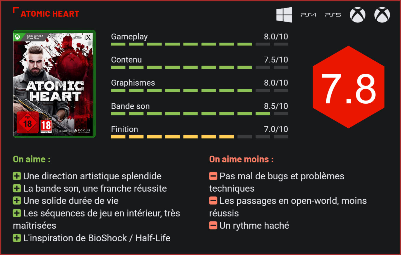 Attendu au tournant, Atomic Heart n’aura pas manquer de faire parler de lui pour sa sortie. Développé par un studio russe, le titre a attiré la colère du gouvernement ukrainien qui demandait à corps et à cris son retrait de la vente. Un “bad buzz” qui lui aura plutôt bien servi puisque le jeu est parvenu à séduire plus de deux millions de joueurs dans la semaine suivant sa sortie…. S’il a été au cœur d’une petite polémique, Atomic Heart n’a pourtant rien d’un objet de propagande. De facto, le développement avait débuté il y a cinq ans en Russie. Mais le studio derrière ce projet, Mundfish, a joliment évité la politisation de son œuvre en s’expatriant à Chypre. Dans son équipe, on retrouve d’ailleurs des développeurs de plusieurs nationalités. Le titre est de surcroit édité par Focus Home Entertainment, un éditeur français. Les niveaux en intérieur sont particulièrement maîtrisés. Au niveau du propos, on en vient aussi à se demander ce qui a bien pu irriter le politique. Car de facto, le jeu critique assez ouvertement le Communisme. Son scénario est en grande partie basé sur un best-seller russe, relativement méconnu chez nous. Atomic Heart nous immerge dans un monde alternatif dans lequel l’Union Soviétique est devenue la plus grande puissance économique et est parvenue à créer un “paradis socialiste” dans lequel des machines réalisent les tâches les plus ingrates de la société. Tout cela est lié à la découverte d’une substance miracle, le polymère, qui permet de connecter l’esprit de tous les humains pour fonder une société moderne et “connectée” qui fonctionne comme une ruche. Le grand rêve socialiste. Les élites du pays ont ainsi conçu une cité volante qui se veut l’exemple à suivre pour le reste du pays. Le jour du lancement de la version 2.0, une erreur se produit dans le système. Les robots d’entretien se transforment en machines à tuer et éliminent méticuleusement toute forme de vie. Vous l’aurez compris, Atomic Heart est une critique ouverte du communisme. Et très sincèrement, pour un jeu made in Russia, le jeu fait preuve d’une complexité narrative étonnante. Dans la peau d’un soldat d’élite, le joueur devra tenter de découvrir les raisons de l’échec du “Kollektiv”, et d’empêcher la catastrophe qui s’annonce. complexe. Côté ambiance, le jeu met le paquet. Atomic Heart frappe fort au niveau de son scénario, avec une histoire captivante à suivre de bout en bout, supportée par une bande sonore extraordinaire et un ton extrêmement mature. Outre les excellentes musiques d’ambiance russophones, on applaudit tout particulièrement les doublages du major, cynique, drôle et terriblement terre à terre, qui rappelle parfois le ton décalé d’un Duke Nukem dans ses commentaires. Car c’est l’une des grandes forces du jeu : Atomic Heart n’intègre aucune censure. Les propos sont parfois choquants, les dialogues hilarants, au point de parfois en être quasiment malaisants… Et mine de rien, cela a un côté très rafraichissant en 2023. Comme on l’a dit plus haut, la narration est soignée et les dialogues entre le major et son IA, “Charles”, sont un véritable régal à suivre. Bien entendu, il est difficile d’ignorer le fait que le jeu s’inspire assez ouvertement de BioShock. On retrouve un univers sci-fi utopique similaire, un gameplay relativement identique et quelques idées repêchées quasiment à l’identique, comme le déblocage des carnets de bord qui permettent d’en apprendre plus sur l’histoire du jeu. Pour autant, Atomic Heart n’est pas une simple copie de son modèle. Le jeu parvient à développer son propre univers, sa propre patte graphique et surtout un gameplay qui parvient à se distinguer suffisamment de son modèle. On se situe quelque part à mi-chemin entre un Doom, un BioShock et un Half-Life. L’intensité de certains combats rappelle les combats de Doom. L’univers rappelle BioShock et la progression semble s’inspirer du modèle d’Half-Life avec des niveaux en intérieur très linéaires et des niveaux en extérieur qui ressemblent à de petits open-world. La direction artistique est impeccable. Globalement, le jeu parvient à agréablement nous séduire avec son univers, qui nous est joliment introduit à travers une longue introduction. On a vraiment l’impression d’explorer un monde utopique soviétique. Et très clairement, la direction artistique splendide du jeu aide à l’immersion. Côté gameplay, Atomic Heart est un mélange de séquences de shoot explosives à la Doom, de résolutions de petites énigmes plus dans la lignée d’un Half-Life ou d’un BioShock et d’exploration. Les trois premières heures de jeu vous feront arpenter des niveaux souterrains extrêmement soignés mais à la structure très linéaire. Plus tard dans l’aventure, le joueur sera amené à explorer de mini open-worlds à la structure plus complexe. La formule a toutefois tendance à moins bien fonctionner dans ces environnements ouverts en raison d’une structure vieillotte et peu adapté aux open-world. Clairement, Atomic Heart se montre beaucoup plus séduisant en intérieur. Le level-design y est certainement pour beaucoup. S’il tente de tanguer du côté d’un Doom dans ses affrontements, Atomic Heart est toutefois loin d’être un fast-FPS. Le jeu est assez pataud – pas autant qu’un BioShock, mais tout de même. Et c’est sans doute le plus gros reproche qu’on lui adressera. La partie affrontements est en retrait, malgré une mise en scène très soignée et des ennemis extrêmement stylés. On ne ressent pas assez la puissance des armes, pad en main, et les déplacements du personnage paraissent souvent un peu trop lents. Le jeu brille en revanche dans sa partie exploration / résolution de petits énigmes et affrontements face à un ou deux ennemis. C’est fun, le gameplay est étonnamment