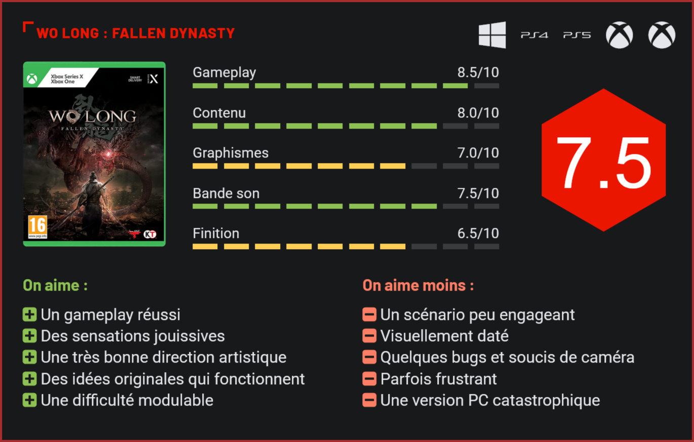 Après les jeux Nioh et Stranger of Paradise Final Fantasy Origin, la Team Ninja nous propose à nouveau un jeu inspiré de la formule des Souls-like. Les développeurs japonais ont sorti Wo Long : Fallen Dynasty il y a quelques jours, un tout nouveau titre inspiré de l’histoire de la Chine. Édité par Koei Tecmo et développé par la Team Ninja, une équipe qui a fait ses preuves sur de nombreux jeux d’action au cours des deux dernières décennies, Wo Long : Fallen Dynasty est un nouvel Action-RPG dont une bonne partie des mécaniques sont tirées du genre des Souls-like. Nouvelle franchise oui, mais soyons honnêtes, le titre repose grandement sur les acquis du studio lors de la conception des deux jeux Nioh, à tel point que ce Wo Long ressemble presque à un troisième épisode déguisé. Le dernier jeu des développeurs japonais se démarque cependant grâce à quelques mécaniques originales et un univers tout à fait différent. Si vous êtes déjà familier avec le roman historique “Les Trois Royaumes”, Wo Long ne devrait pas trop vous perdre puisque l’univers du jeu s’inspire de l’histoire de la Chine féodale. Le titre se permet néanmoins d’ajouter de nombreux éléments fantastiques tirés de la mythologie du pays. L’intrigue se déroule en l’an 184, une période chaotique durant laquelle notre personnage va briller. Notre protagoniste entièrement customisable va perdre la vie face à un soldat, mais sera mystérieusement ressuscité grâce à un talisman donné par un jeune homme. Possédant désormais des pouvoirs, notre personnage va devenir la clé pour combattre des forces maléfiques qui s’éveillent et pour empêcher le pays de sombrer. La mythologie chinoise est un univers que l’on ne voit pas souvent dans un Souls-like. Malgré toutes ses inspirations, l’on remarque très vite que ce n’est pas sur sa trame narrative que Wo Long va se concentrer, et qu’elle n’est principalement là que pour donner un prétexte à cette aventure. Le titre offre tout de même des cinématiques jolies et bien mises en scène entre les missions. Les amoureux de l’histoire de cette période de la Chine devraient aussi apprécier voir certains personnages clés. S’il est musicalement et visuellement très agréable, il faut admettre que le jeu n’est pas une claque graphique malgré une très bonne direction artistique. L’expérience de jeu tourne surtout autour de son gameplay particulièrement réussi. Wo Long souffre également de quelques bugs et quelques soucis de fluidité dépendant de la plateforme, en particulier la version PC soumise à de nombreux soucis d’optimisation qui devraient bientôt être patchés. Wo Long emprunte évidemment de nombreuses mécaniques aux Souls-like telles que les mécaniques de mort qui laissent une partie de notre butin aux mains de l’ennemi qui nous a vaincu, ses drapeaux qui fonctionnent comme des feux de camps et qui permettent d’augmenter notre niveau et d’apprendre de nouvelles compétences, les types d’armes différents et l’importance du poids de l’équipement… À ceci près que Wo Long est plus proche de Nioh que d’un Dark Souls. Le titre est divisé en niveaux déconnectés les uns des autres dans lesquels nous pouvons trouver tout un tas d’ennemis, de pièges ainsi que du loot d’équipement. Des missions annexes sont aussi accessibles, nous permettant de revisiter les différents niveaux dans des conditions altérées. Les niveaux possèdent de nombreux chemins différents. Le jeu se démarque cependant grâce à son système de combat plus original. Si les actions qu’il est possible d’effectuer ne sortent pas des sentiers battus, elles ont ici une tout autre importance en lien avec la jauge “d’esprit” qui vient remplacer un système d’endurance plus traditionnel. Il s’agit d’une jauge qui augmente vers un côté positif ou un côté négatif dépendant de nos actions en combat. Plus nous performons (porter des coups aux ennemis, réussir des parades…), plus la jauge sera dans le positif. À l’inverse, moins nous sommes efficaces, plus la jauge sera dans le négatif, au risque d’être immobilisé durant quelques précieuses secondes une fois remplie. Il s’agit donc d’un élément important pour lequel il est nécessaire de garder un certain équilibre. Wo Long donne une véritable importance à la mécanique de parade, qui se déclenche en réalisant une esquive lorsqu’un coup doit nous toucher. L’approche est donc très différente d’un titre comme Elden Ring, mais offre des sensations tout aussi satisfaisantes. Tout comme les jeux de From Software, Wo Long est un titre à la difficulté relevée, malgré quelques aides comme la présence de personnages du scénario à nos côtés ou la possibilité de parcourir les niveaux en multijoueur. Il existe cependant un autre système permettant de simplifier les choses. Les boss sont les meilleurs moments du jeu. S’il ne transforme pas le jeu en une promenade de santé, le niveau de “moral” est un élément à prendre en compte si vous ne voulez pas être désavantagés en combat. Le niveau de moral augmente en tuant des ennemis, ce qui nous donne un avantage de force, mais ce niveau peut également baisser lorsque l’on meurt. Chaque environnement possède toutefois plusieurs emplacements dans lesquels des drapeaux peuvent être plantés. Plus il y a de drapeau dans le niveau, plus notre moral minimum sera élevé, permettant d’empêcher l’écart de se creuser en cas de mort répétée face à un boss. S’ajoute alors une dimension “exploration” au jeu, puisque trouver tous les emplacements de drapeaux nous offre un avantage non négligeable. Les boss sont évidemment l’attraction principale de ces niveaux, ceux-ci représentent de véritables challenges. Plus que jamais, Wo Long nous demande d’être attentif et de réellement comprendre le comportement de nos ennemis. Ceux-ci ne p