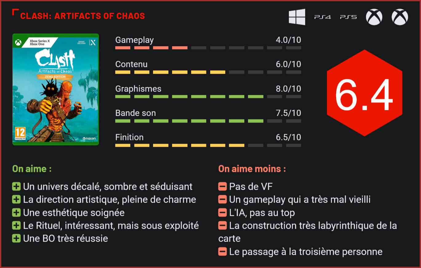 Le studio chilien ACE revient à ses premiers amours avec un troisième épisode de sa série Clash, 10 ans après la sortie du second volet. Autant dire que les fans de “Clash” l’auront attendu, ce troisième épisode. Après la sortie du second volet, le studio chilien avait mis de côté sa franchise pour se consacrer à d’autres projets. De Rock of Ages à Abyss Odyssey, en passant par SolSeraph et plus récemment The Eternal Cylinder, Ace a fait un joli étalage de son talent à travers ses multiples productions. Pour de nombreux fans du studio, jusqu’à The Eternal Cylinder en tout cas, le studio avait troqué sa créativité pour miser davantage sur des jeux plus grand public. L’annonce d’un troisième épisode de la série des Zeno Clash avait donc suscité l’engouement de la petite communauté de fans du studio. Votre campement est votre point de sauvegarde et de résurrection. Sorti en 2009, le premier Zeno Clash était parvenu à s’imposer comme un titre unique en son genre. S’il se jouait entièrement à la première personne, le titre se démarquait des autres FPS par le fait qu’il proposait uniquement des combats au corps à corps dans lequel il fallait parer les coups de ses adversaires et enchainer les combos, le tout dans un univers SF loufoque, peuplé de créatures aux looks étranges, et avec un style “cel-shading” qui rappelait celui des films d’animation. Un pari audacieux qui avait fait mouche. Zeno Clash 3 reprend en partie ce qui a fait le succès des deux premiers épisodes mais se permet toutefois un changement majeur. Le jeu ne se joue désormais plus à la première personne mais à la troisième personne. Il se rapproche ainsi du jeu d’aventure. La structure du jeu évolue également puisqu’on ne se retrouve plus ici sur “un rail” dans des niveaux linéaires entrecoupés par des temps de chargement mais dans un semi open-world labyrinthique dans lequel on peut évoluer librement. Un nouveau monde s’ouvre à vous. Bon, alors, il va falloir tout de même tempérer les ardeurs de certains. Car de facto, l’open-world dont il est question n’est en réalité qu’un vaste labyrinthe. La progression reste très scriptée et le jeu ne s’ouvre qu’au fur et à mesure que vous débloquez des passages secrets vers les zones déjà explorées. Ca reste donc très linéaire et en effet, très proche de l’ancienne formule à cet égard. La vue à la troisième personne n’apporte pas non plus de grande nouveauté. Tout au plus vous permettra-t-elle d’admirer davantage la beauté des paysages. Durant les combats en revanche, on a l’impression qu’elle offre moins de précision dans les frappes, qui auront tendance à passer plus souvent à côté de votre cible. Les combats vous obligent à battre souvent en retraite. Côté gameplay, pas grand chose n’a changé. Et c’est bien dommage car le jeu manque cruellement de profondeur. On se contente de matraquer les boutons X et Y pour frapper son adversaire, on évite un coup, on s’écarte de son adversaire pour récupérer un peu, et on repart à l’assaut. Et c’est bien dommage car si la formule fonctionnait correctement il y a 14 ans, elle parait aujourd’hui bien pauvre. Rappelons-le aussi, le premier Clash était un petit jeu indé vendu une dizaine d’euros en son temps. Clash 3 est vendu presqu’au plein tarif (39,99€). Alors oui, ACE Team a bien tenté de moderniser un peu le tout en intégrant par exemple un curieux jeu de dé qui – en cas de victoire – vous donnera un joli bonus en cours de partie. Le “Rituel” consiste à jouer quatre dés sur un tapis, puis à utiliser 3 pouvoirs pour réduire la puissance des dés de l’adversaire. C’est amusant, un peu tactique, mais l’impact sur le jeu est minime et surtout, cela dépend tout de même pas mal de la chance. Impossible d’inverser le cours d’une partie si vous obtenez quatre “1” et votre adversaire quatre “5”. Autre nouveauté : le joueur peut personnaliser son personnage, son équipement et en améliorer les compétences. Un petit côté RPG qui apporte un peu de consistance au jeu, mais là aussi, on ne ressentira pas de gros impact sur le jeu avant un stade avancé dans le jeu… Chez le marchand, vous pourrez échanger des matériaux contre des objets. Enfin, reste à aborder le passage à la première personne, qui se fera en fin de combat, pour asséner le coup final. Etonnant, dans la mesure où ça n’apporte rien de plus et surtout, cela nous rappelle à quel point le jeu aurait été meilleur si on avait pu y jouer entièrement à la première personne. En définitive, le gameplay peine donc à convaincre. Les nouveautés n’apportent pas grand chose de neuf, les combats sont pauvres et on a tendance à souvent se perdre dans le monde labyrinthique du jeu, au point qu’on en vient à regretter la formule plus linéaire de ses ancêtres. D’un point de vue ludique, ce troisième volet est donc un échec. Ceci étant dit, tout n’est pas à jeter dans Artifacts of Chaos. Esthétiquement tout d’abord, le jeu est absolument superbe. Sa direction artistique lui confère un style unique, les panoramas observés sont splendides, et l’univers décalé, étrange et mystérieux du jeu encourage à l’exploration. Le scénario du jeu séduit également par son étrangeté. Avec ses personnages bizarres mais plein de charme, son excellente bande son (en VO uniquement), et son intrigue mystérieuse, Artifacts of Chaos parvient à séduire assez pour qu’on en vienne à espérer un quatrième épisode. Dommage que son gameplay le tire vers le bas, car il y avait clairement là un véritable potentiel. Conclusion Il se sera fait attendre, ce troisième volet de la franchise. Clash: Artifacts of Chaos ne parvient toutefois pas à convaincre autant que ses ainés. Si du côté de la technique, on frôle la perfection, avec une BO envoutante, une direction artistique somptu