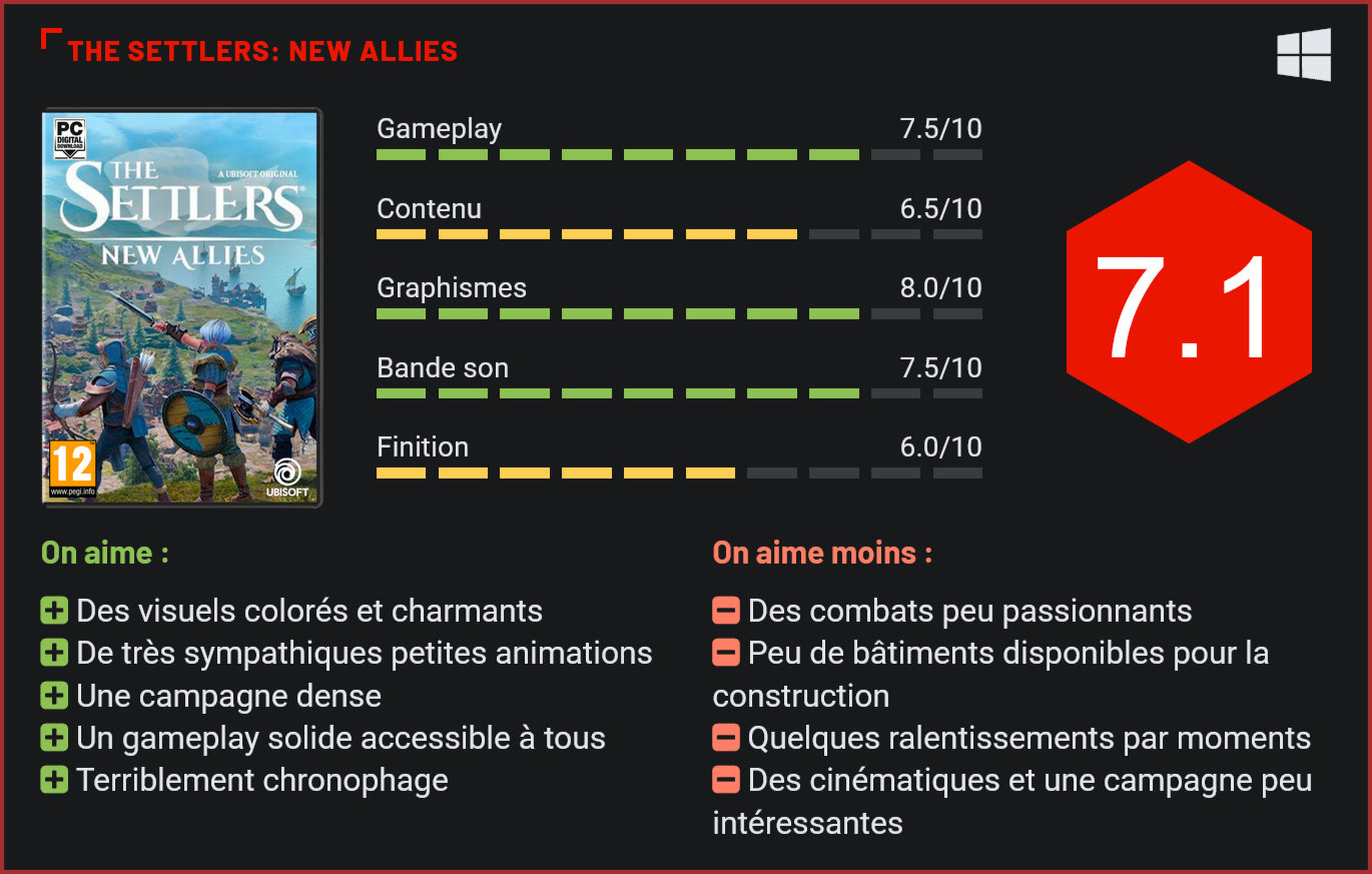 Il aura fallu attendre 13 longues années avant qu’Ubisoft ne sorte un nouveau jeu officiel estampillé The Settlers. C’est donc non sans la moindre émotion que l’on replonge dans cet univers enchanteur. Les jeux de city-building et de stratégie ont principalement connu leurs heures de gloire durant les années 1990 et au début des années 2000. On se souviendra notamment des Anno, Total War, Age of Empires ou encore de The Settlers. Cette dernière franchise, développée par Blue Byte et éditée par Ubisoft, a débuté en 1993. La saga a connu une période faste jusqu’en 2001, avec quatre épisodes sortis. Au total, ce sont sept épisodes qui sont sortis et cinq spin-offs. Cette année, la licence renaît de ses cendres avec New Allies, le huitième opus. Contrairement aux autres franchises citées ci-dessus, The Settlers a toujours su se démarquer grâce à son aspect plus enfantin et coloré que la moyenne. Là où les autres misent davantage sur le réalisme et des graphismes authentiques, “Les Colons” (The Settlers en français) se concentre sur des forêts d’un vert pétant, sur des bâtiments orange, rouge ou bleu vif, ainsi que sur des personnages animés de manière extravagante. Mais avec New Allies, les développeurs ont promis une refonte complète du moteur de jeu. Présenté pour la première fois à la Gamescom 2018, le titre avait charmé les joueurs et la presse grâce au moteur de jeu Snowdrop, également utilisé dans The Division et Avatar: Frontiers of Pandora, entre autres. Et force est d’admettre que le résultat est plus que convaincant ! Le rendu de l’eau est impeccable, les effets de lumière très réussis et les différents éléments de la carte, comme les arbres, très réalistes. Les textures réussissent, elles aussi, à plaire avec beaucoup de détails et de justesse. Enfin, ce sont les personnages qui nous ont beaucoup plu, avec une animation au poil et loufoque. Visuellement, ce Settlers: New Allies s’en sort très bien. C’est très coloré et vivant, tandis que les graphismes et textures sont assez travaillés. La mise à jour visuelle étant dans cet opus la principale nouveauté, attardons-nous désormais à son gameplay. Incontestablement, les joueurs des précédents opus ne seront pas dépaysés étant donné qu’Ubisoft et Blue Byte ont repris les mécaniques de jeu qui avaient eu tant de succès dans les précédents titres. L’objectif des développeurs était ici de moderniser un gameplay qui a fait ses preuves, et ce, afin d’attirer de nouveaux joueurs, mais également de refidéliser les vieux de la vieille. Dans The Settlers, vous êtes à la tête d’une cité en devenir et devez récolter des ressources et de la nourriture dans le but de lui permettre de prospérer et d’attirer encore plus de colons. Vous l’aurez compris, il n’y a rien de vraiment compliqué dans The Settlers. Celui-ci s’adresse à tous, de 7 à 77 ans. Et il n’est pas non plus nécessaire d’avoir déjà joué à un précédent épisode pour correctement prendre en main New Allies. De plus, un didacticiel très complet est proposé, vous permettant de tout comprendre au titre, qu’il s’agisse des différentes méthodes pour amasser des ressources ou de la manière de défendre votre cité. En construisant votre ville, vous aurez besoin de ces ressources donc, mais également d’attirer de nouveaux citoyens grâce aux demeures. À la manière d’une mine ou d’un moulin qui produira des ressources en fonction du temps écoulé, la demeure attirera de nouveaux citoyens avec le temps. Et si vous construisez plusieurs demeures à côté les unes des autres, des bonus vous seront octroyés et une jolie construction vous sera proposée, s’adaptant même aux constructions alentours. Tous les bâtiments et chemins sont d’ailleurs modulables, apportant ce petit plus bienvenu à la construction. Gérer les ressources, attirer davantage de prisonniers ou encore former de nouvelles unités de combat ou offensives : telle est votre mission. Profitons-en pour évoquer le contenu de New Allies qui est, avouons-le, famélique. Le nombre de bâtiments proposés par catégorie est très faible, oscillant entre cinq et six pour cinq catégories. Les unités recrutables se comptent sur les doigts d’une main, et seules trois factions vous sont accessibles, à savoir les Elari, les Maru et les Jorn. Le design des bâtiments et des unités change, mais rien de vraiment transcendant dans le gameplay. En revanche, si le titre n’est pas très étoffé du point de vue du contenu, on notera que la campagne tient ses promesses, dépassant largement les dix heures de durée de vie. Elle est longue, certes, le titre est très chronophage et les heures passent sans qu’on ne s’en rende compte, en effet, mais on ne retiendra pas du scénario qu’il est passionnant. Les cinématiques, quoique bien fichues, sont très rapidement passées et peu captivantes. L’aventure est ponctuée de quelques cinématiques sympathiques et colorées mais peu intéressantes. Ceux qui connaissent The Settlers savent qu’ils ne doivent pas attendre du titre des batailles engageantes et réalistes. Depuis toujours, vous n’avez eu le droit qu’à peu d’unités et à des batailles où tout le monde attaque tout le monde, sans réellement avoir la possibilité de préparer le champ de bataille ou une tactique, un peu à la manière d’un Age of Empires. New Allies ne déroge pas à la règle. Les combats se mènent assez facilement et rapidement, et le commun des mortels peut les remporter. Nouveau moteur pour la franchise donc, mais pas spécialement une technique au poil, puisque nous avons régulièrement eu affaire à des ralentissements malgré les bonnes capacités de notre machine. De nombreux joueurs se sont quant à eux plaints de freezes et de crashes, mais nous n’avons rien connu de tout cela… “Seuls” les ralentissements étaient à déplor