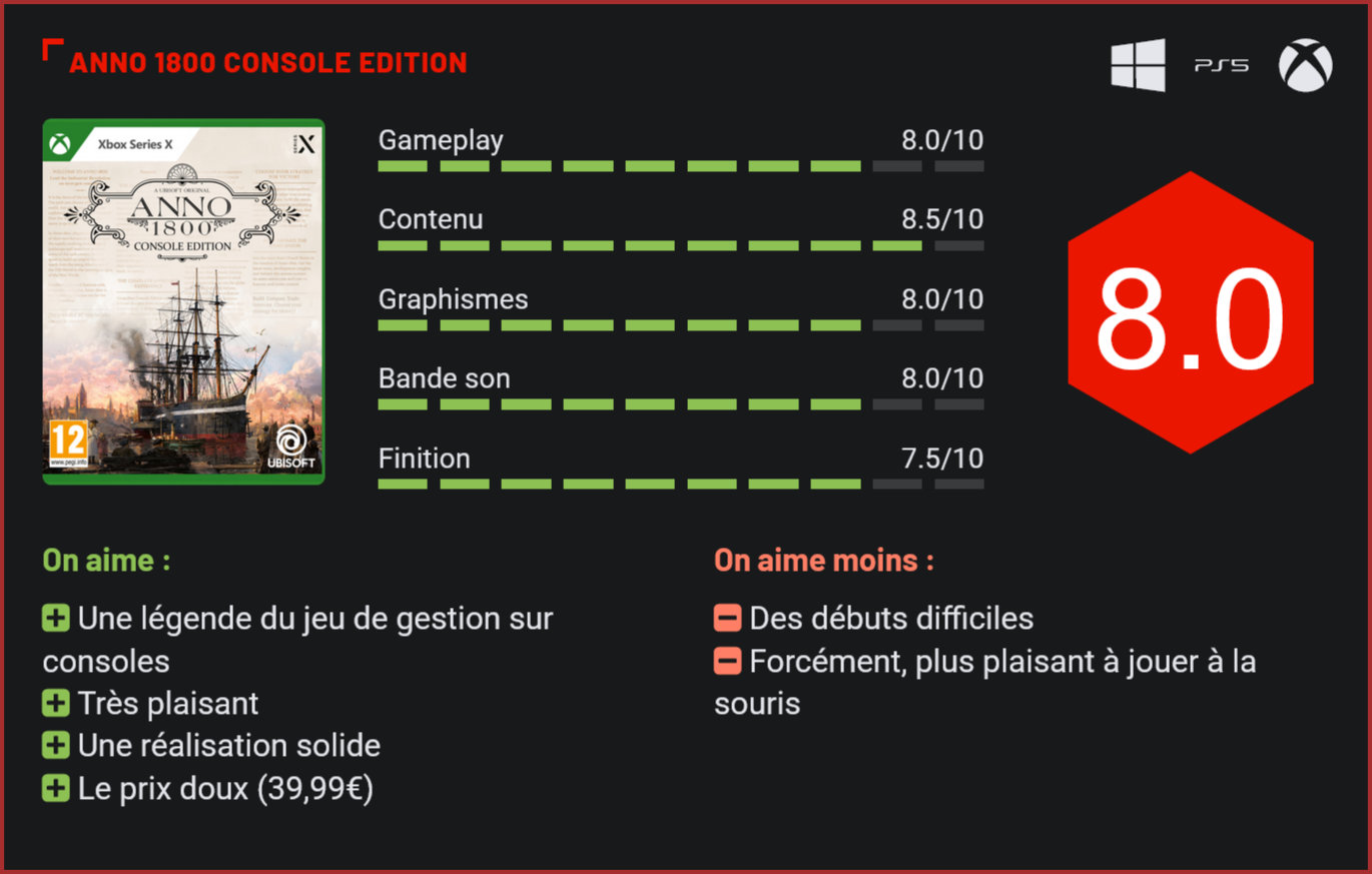 Sortie en 2019 sur PC, Anno 1800 a droit à un portage tardif sur consoles de jeu. Le jeu d’Ubisoft réussit toutefois brillamment l’exercice du portage sur console de jeu. Les jeux de gestion ont connu leur heure de gloire à la fin des années 90 et aux débuts des années 2000. Une popularité qui s’est un peu essoufflée par la suite, sans pour autant disparaître. Sorti en 2019, Anno 1800 était parvenu à joliment remettre au goût du jour une série quelque peu tombée dans l’oubli. 4 ans plus tard, Ubisoft nous livre enfin le portage du jeu sur consoles de salon. Et le moins que l’on puisse dire, c’est que les joueurs console n’auront pas attendu pour rien puisque cette édition est une jolie réussite. Tout d’abord, parce que le jeu est vendu à un tarif compétitif – 39,99€ seulement. Ensuite, parce que le gameplay est parfaitement adapté au pad avec un système de roue d’accès très rapide qui permet de naviguer rapidement dans les menus. C’est assez simple, et passé 2 heures de jeu on maîtrise tout ce qu’il y a à maîtriser de l’interface. Enfin, parce que le jeu a été joliment adapté aux écrans de télévision, avec des textes plus grands et plus lisibles que sur PC. Visuellement, le jeu est plutôt réussi. Anno 1800 prend vie au début du XIX siècle, à l’ère de la Révolution industrielle. Le contexte d’Anno 1800 offre un cadre intéressant pour développer sa cité. Une ère synonyme de progrès technologique, culturelle et sociétale dont le dynamisme est fragilisé par un contexte politique tendu. Ajoutons à cela les drames familiaux de notre personnage et voilà la base de l’aventure d’Anno 1800. Après la mort de son paternel, le personnage qu’on incarne – choisi parmi un panel de près de 25 protagonistes – se voit attribuer la lourde tâche de laver l’honneur de sa famille, victime de fausses et graves accusations. Pour y arriver, il nous faudra développer une nouvelle cité sur des terres laissées à l’abandon et d’anciennes ruines. Une tâche compliquée qui ne sera pas facilitée par les différentes magouilles et pressions politiques et familiales. Plus qu’un simple jeu de gestion, Anno 1800 repose donc sur un véritable scénario qui aura son importance au cours du développement de notre ville. Les différents personnages et les relations qu’ils entretiennent avec notre bâtisseur apportent réellement une plus-value à l’aventure, une caractéristique de la série des Anno. Les environnements du jeu sont très variés. Comme tout bon jeu de gestion, l’aventure débute sur le néant. Débutant seulement avec quelques fermiers motivés et de terres fructueuses, il faudra construire et gérer sa petite ville de bout en bout, intégrant le concept de la Révolution industrielle tout en se reposant sur les bases solides de l’agriculture. Après avoir aménagé les premières maisonnées pour nos bons fermiers, le développement de notre village pourra dès lors véritablement débuter, se complexifiant toujours un peu plus pour devenir une vraie cité moderne. Le management de notre village ne se limitera pas à la construction d’infrastructures et embellissement des rues puisqu’il faudra également prendre en compte le bonheur de nos bons citoyens. Ceux-ci se montrent d’ailleurs très exigeants puisque leurs intérêts sont multiples et impliquent des aménagements divers. Pollution, loisirs, conditions de travail, environnement sont des éléments à prendre en compte pour développer notre cité aux goûts des citoyens, au risque de la voir se vider de sa population. Or, sans fermiers, ouvriers et architectes, pas de nouvelles constructions. À mesure que la population se sent bien et que les infrastructures tournent à plein régime, des nouvelles classes sociales et des nouveaux bâtiments feront leur apparition. Il faudra cependant respecter un certain équilibre des classes sociales afin d’éviter de se retrouver en pénurie de ressources, par exemple. Comme toute bonne société humaine, tout ne file pas toujours droit dans Anno 1800. Au cœur de la Révolution industrielle, les politiques et magouilles tentent de perturber l’ordre des choses. Ajoutez à cela la pression de la presse locale et les revendications de la population et on arrive vite à des débordements dans les rues. Pour amener à bon port notre cité, il faudra donc faire attention au bonheur de nos hommes et femmes sans trop les chouchouter, puisque cela pourrait également avoir l’effet inverse, comme déjà évoqué. Les différents protagonistes de l’histoire nous partagent des informations cruciales pour établir ou anéantir des relations avec autrui. Ils se montrent également très utiles pour prévoir et tuer dans l’œuf l’une ou l’autre révolution grâce aux différentes missions qu’ils nous assignent. En fonction des succès de celles-ci, le cours de l’histoire sera plus ou moins perturbé et amènera, parfois, à des guerres. Celles-ci se dérouleront principalement sur les eaux, un élément caractéristique de la licence. Le développement industriel ouvre de nombreuses options en terme de gestion. C’est là que toute la stratégie du joueur sera mise à l’épreuve, un aspect très apprécié par les aspects de la licence. Face aux différentes tensions, il faudra faire le bon choix, défense ou offensive ? Sachant que l’une ou l’autre peut mener à des batailles navales. Heureusement pour les néophytes, ces phases se révèlent relativement automatisées une fois la guerre débutée. Un aspect que les plus rigides regretteront surement. Les fans de la licence retrouveront facilement leurs marques avec Anno 1800, mais pour les nouveaux venus, l’aventure sera un peu plus compliquée aux débuts. Fort heureusement, après quelques heures de jeu, tout s’éclaircit. Certains principes de base ne coulent pas toujours de source pour un néophyte, ainsi il faudra quelques m