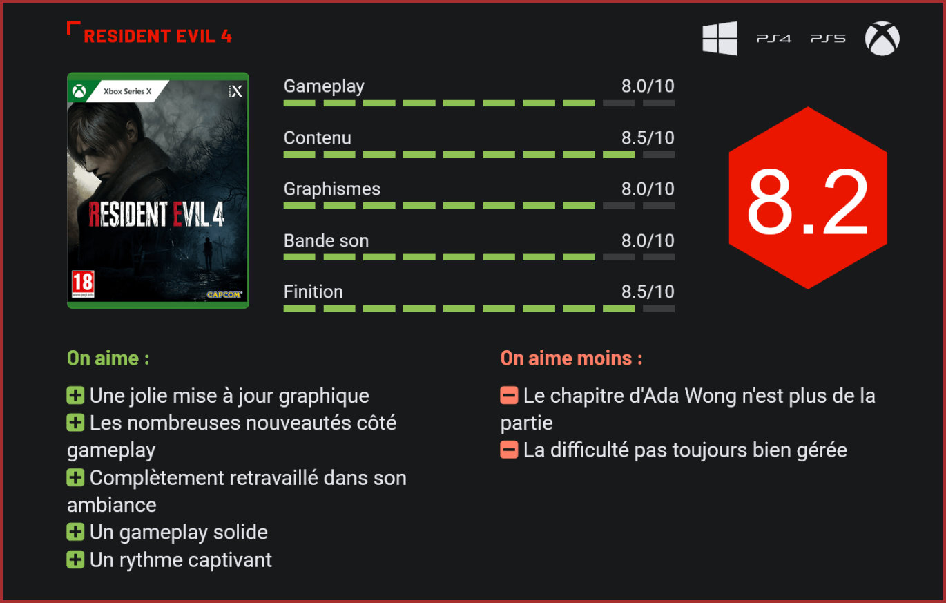 Après un huitième volet très séduisant, la série de survival-horror de Capcom revient avec cette fois un remake du quatrième épisode de la série, sorti à l’époque sur GameCube. Depuis quelques années, plus rien ne semble pouvoir arrêter Capcom, qui multiplie les succès avec sa série Resident Evil. L’éditeur nippon a choisi d’alterner les sorties en proposant une année un nouvel épisode et l’année suivante le remake d’un ancien opus. Après Resident Evil 2 et Resident Evil 3, c’est tout naturellement au tour de Resident Evil 4 d’avoir droit à son remake. L’une des séquences d’ouverture du jeu vous confrontera à une armée d’infectés. Parmi les épisodes les mieux notés de la série, Resident Evil 4 était également l’un de ceux qui avait le plus besoin d’un remake en bonne et due forme. Et pour cause, puisqu’il s’agit d’un épisode sorti sur une console d’il y a deux générations déjà. A ce titre, on peut aujourd’hui sérieusement se demander si Capcom proposera d’autres remakes après ce Resident Evil 4. De facto, Resident Evil 5 et 6 avaient connu un succès critique plus mesuré et surtout sont sortis sur la précédente génération de consoles. Un remake de ces deux titres a donc moins de sens. Et le moins que l’on puisse dire, c’est que comme pour Resident Evil 2 et 3, Capcom a réalisé un travail d’exception dans la relecture de cet épisode ô combien emblématique. L’esthétique du jeu a été entièrement retravaillée, certains aspects du gameplay ont été modifiés mais également certains passages du jeu, plus courts ou plus longs. Une chose est certaine : le titre a été joliment modernisé et ce remake est à ce titre une franche réussite. Resident Evil 4 est plus orienté action qu’horreur. Pour ceux qui seraient passés à côté de cet épisode, pourtant culte, il est important de recontextualiser l’action. Car contrairement à Resident Evil 1, 2 et 3, l’action ne prend pas place à Racoon City. On incarne ici Leon Kennedy, un personnage bien connu des fans de la franchise, six ans après la destruction de Racoon City. L’ex-officier de police est devenu un agent spécial, envoyé en Espagne en mission spéciale pour retrouver la fille du président, kidnappée. La piste qu’il suit l’amène dans un petit village reculé d’Espagne, loin de toute civilisation. Il se rend très vite compte que les habitants du coin ont été infectés par un virus – qui semble lié d’une façon ou d’une autre à Umbrella Corporation, l’entreprise qui avait créé le dangereux virus, responsable de la destruction de Racoon City. Cette fois, Leon n’affrontera toutefois pas une multinationale mais un mystérieux culte baptisé “Los Illuminados”, bien décidé à l’empêcher de réussir sa mission… Vous croiserez des personnages atypiques durant l’aventure. Et le moins que l’on puisse dire, c’est que Resident Evil 4 n’a en réalité plus grand chose en commun avec ses prédécesseurs. Tant au niveau de son gameplay, beaucoup plus orienté action, même s’il conserve quelques éléments propres des survival-horror, qu’au niveau de son ambiance (exit la ville sale, place au dépaysement total avec la campagne espagnole), des personnages croisés, de ses boss (autrement plus variés que dans RE 2 et 3) ou que la construction de son univers. Car RE4 faisait un premier pas en direction d’un open-world, avec des niveaux interconnectés dans lesquels les joueurs progressent selon leurs envies. On notera au passage que par rapport à RE 2 et 3, RE4 offre une durée de vie bien supérieure, ne serait ce que pour ses missions secondaires et trésors à trouver. Des à-côtés qui permettent de récupérer des crédits et objets additionnels, pour se faciliter la tâche dans la progression. RE 4 fait-il toutefois toujours peur? Certainement, mais probablement pas autant que ses prédécesseurs car l’accent est davantage mis sur l’action, les boss sont plus fantastiques qu’effrayants et de façon générale, le jeu se donne un visage plus humain – les zombies de RE4 ressemblant plus à des infectés qu’à des zombies à proprement parler. Le chapitre d’Ada Wong est supprimé… mais il reviendra sans doute en DLC. S’il se distingue de ses prédécesseurs, RE 4 conserve toutefois de nombreux éléments qui ont fait le succès de la série. Ses herbes à combiner pour se soigner, ses coffres pour stocker armes et matériel, ses munitions limitées qui vous forcent à fouiller sans cesse l’environnement, ses longs couloirs au bout desquels vous tomberez peut-être nez à nez avec une affreuse créature, et son arsenal relativement varié (couteau et révolver bien sûr, mais également shotgun, fusil de précision, lance-roquettes, mitrailleuse ou grenades). La force de cet épisode, c’est bien sûr son univers, plus “fantaisiste” qu'”horrifique”. Le jeu a fait couler de l’encre, mais il faut l’avouer, RE4 réserve son lot de passages cultes : le combat contre le monstre du lac, l’attaque du village, l’homme tronçonneuse… Le jeu enchaine les séances cultes à un rythme impressionnant. Alors oui, la difficulté n’est pas toujours très bien dosée. Mais quel pied formidable du début à la fin de l’aventure! Le gameplay de RE4 a par ailleurs été fortement modernisé avec de nouveaux éléments qui viennent apporter un peu de profondeur. Leon peut désormais ainsi avancer furtivement en s’abaissant, et ainsi surprendre ses ennemis pour les poignarder en silence. Un petit côté infiltration qui n’est vraiment pas déplaisant, même si sous-exploité. Le joueur peut désormais également parer des attaques, ce qui rend le gameplay du jeu beaucoup moins rigide qu’à l’époque. La valise de Léon évolue également. Le joueur peut non seulement agrandir sa taille pour lui permettre d’emmener plus d’objets avec lui, mais également y attacher