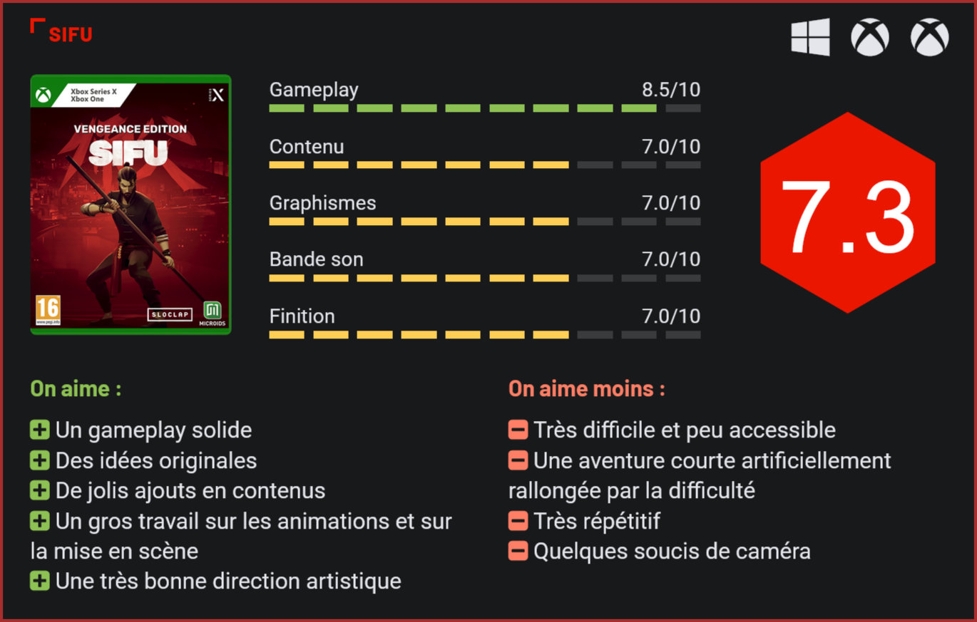 Exclusivité temporaire du catalogue des consoles PlayStation, Sifu a finalement droit à un portage sur PC et consoles Xbox, avec de nouveaux contenus à la clé. Vous vous souvenez peut-être du très sympathique Absolver, le précédent jeu du petit studio Sloclap. Jolie réussite en son temps, le titre a servi de base (solide) pour le développement de Sifu, un jeu de combat intense mais surtout très exigeant, sorti il y a un peu plus d’un an sur PS4 et PS5. Compte tenu de son exclusivité, le titre avait relativement peu fait parler de lui. Sa sortie sur consoles Xbox et PC est l’occasion pour nous de vous en reparler. Esthétiquement, Sifu a un style unique. On y incarne un ou une artiste martial qui part en quête pour venger son maître assassiné des années auparavant par un groupe de cinq individus mystérieux. Un scénario simple et limpide sur la structure du jeu, nous allons parcourir cinq niveaux où nous attendent chacun des cinq antagonistes ayant aidé à vaincre notre maître. Si les évènements sont très classiques, il est tout de même possible de trouver des objets dans les niveaux qui apportent un peu de contexte sur les lieux visités ou les activités des différents antagonistes. Un peu à la manière d’un beat them up à l’ancienne, les différents niveaux sont des passages linéaires entrecoupés de combats contre tout un tas d’ennemis. Le gameplay est particulièrement réussi. Les quelques petits soucis de caméra n’empêchent pas le jeu d’être jouissif. L’action est fluide, la prise en main est efficace et les coups portés ont beaucoup d’impact. La difficulté assez élevée du titre procure un véritable sentiment d’accomplissement lorsqu’on arrive à vaincre tous ces ennemis très agressifs, ceux-ci n’hésitent pas à nous attaquer alors que vous êtes démunis ou au sol. Nos opposants ont tous une jauge de garde qui, une fois remplie, permet de les déséquilibrer et d’en finir avec un enchaînement dévastateur. Il est possible de réaliser tout un tas de combos et de techniques utiles dans diverses situations ainsi que d’utiliser des armes et objets trouvables dans les environnements, mais il faut également beaucoup miser sur la défense avec la garde et les différentes esquives. Il est possible de puiser dans une jauge de concentration pour réaliser des attaques plus puissantes et qui permettent à tous les coups de prendre l’avantage sur les autres combattants. Battre des ennemis nous rapporte des points d’expérience à dépenser dans de nouvelles compétences de combat. Celles-ci doivent d’abord être temporairement achetées et sont donc utilisables durant la partie en cours, mais elles peuvent être acquises définitivement en déboursant beaucoup plus d’expérience. Cette nouvelle version du jeu est enrichie en contenus. La progression du titre repose sur un concept original mais aussi punitif. Grâce aux pouvoirs d’un talisman magique, il est possible de reprendre directement là où nous avons péri, mais chacune de nos morts va faire vieillir notre personnage. Le nombre d’années que l’on perd à chaque mort dépend d’un compteur qui augmente à chaque fois que l’on passe l’arme à gauche. Notre première mort nous fait vieillir d’une année et ajoute un point à ce compteur, et si celui-ci n’est pas diminué en jouant suffisamment bien, notre prochaine mort nous fera alors perdre deux années au lieu d’une. Ce compteur peut continuer à augmenter et inutile de vous dire que le vieillissement de notre personnage peut aller très vite. Avec l’âge, notre protagoniste gagne en puissance mais perd en vitalité, et une fois les 70 ans dépassés, c’est game over. Le titre ne reprend cependant pas au tout début, il est possible de recommencer un niveau avec l’âge que nous avions en terminant le précédent. Si cet âge est trop élevé, il faut alors revenir dans le niveau encore avant et le terminer du mieux possible pour garder nos jeunes années. Le but est donc de jouer assez bien pour survivre jusqu’au dernier niveau. La difficulté élevée du titre nous force donc à recommencer les niveaux encore et encore jusqu’à maîtriser le gameplay suffisamment pour pouvoir progresser. Jongler avec les capacités offensives permettant de ne pas se faire déborder par un groupe d’ennemi et utiliser à bon escient les outils défensifs est primordial. Il faut également affronter les cinq antagonistes du jeu qui sont les ennemis les plus coriaces et les plus agressifs. Sifu est une expérience frustrante mais qui peut devenir très gratifiante en échange de votre temps et d’un certain investissement, un concept qui ne plaira pas à tout le monde. Vous affronterez en tout et pour tout cinq boss. Sifu adopte une direction artistique très plaisante. Le titre propose des environnements et personnages aux proportions réalistes tout en ayant des couleurs et des ombrages ressemblant un peu à des peintures. Un mélange qui lui octroie une ambiance particulière et qui offre de très jolis paysages. Un autre gros point fort du titre c’est aussi sa mise en scène particulièrement soignée. En plus des combats qui proposent des mouvements d’arts martiaux très bien animés et des enchaînements impressionnants qui semblent toujours naturels, les décors du jeu sont aussi mis en valeur à de nombreuses reprises. Les musiques ne sont malheureusement pas très mémorables mais sont de très bonnes factures. Le sound design est, quant à lui, particulièrement réussi, donnant encore plus de panache à l’action. Si l’aventure prend un certain temps avant de se conclure, c’est avant tout grâce à son système de jeu punitif qui nous force à recommencer encore et encore. Sans cet aspect, la durée de vie serait en fait très courte. En résulte un titre très répétitif malgré quelques chemins alternatifs dans les niveaux. Ce jeu reste également une expérience plutôt dé