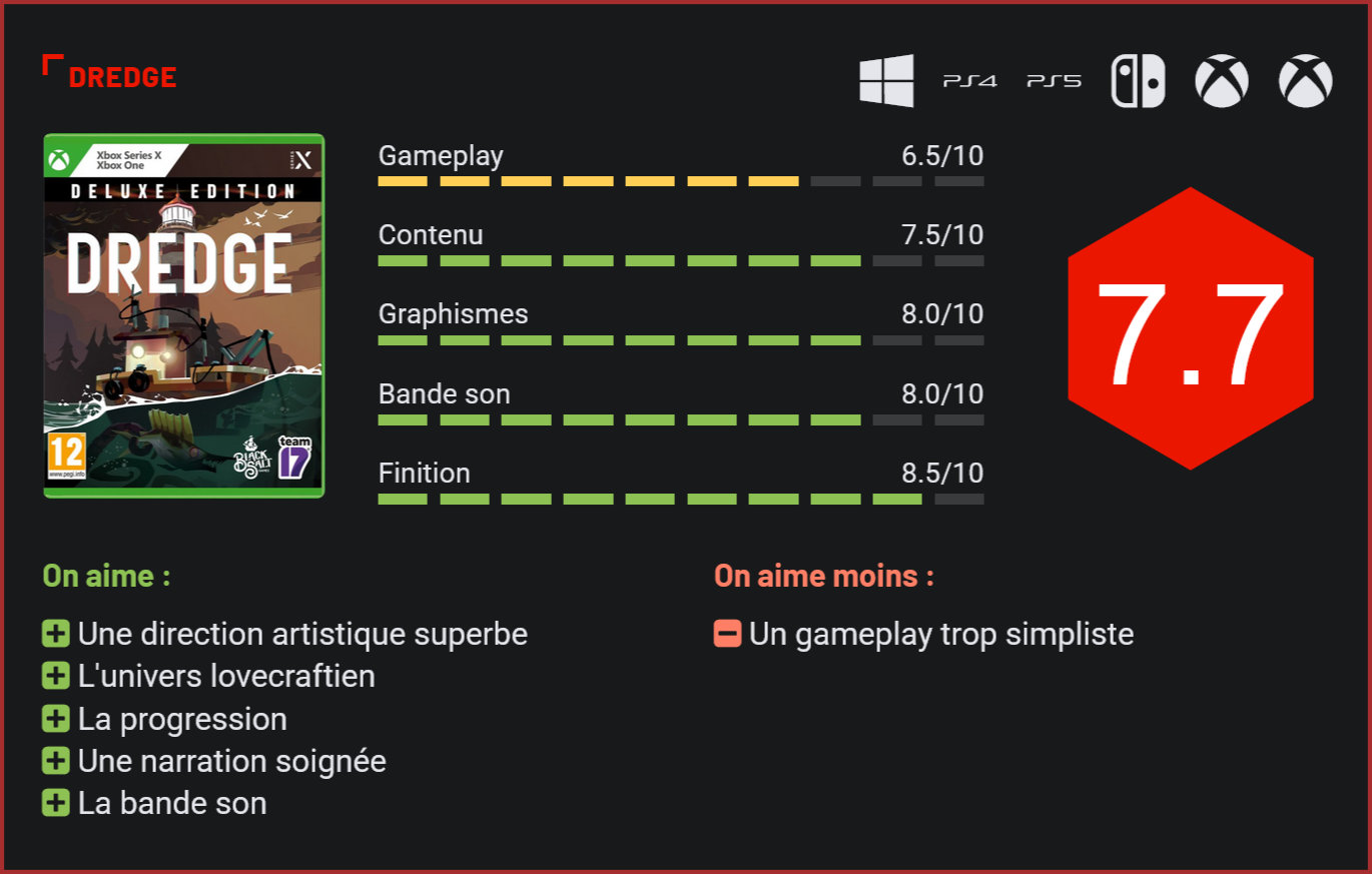 Dredge, le nouveau jeu du petit studio Black Salt Games, propose une expérience unique en vous chargeant d’une pêche en haute mère périlleuse, aux commandes d’un petit chalutier, dans un univers à la direction artistique inspirée. Si les jeux de pêche pullulent, rarement les développeurs s’écartent de la simulation. Le petit studio Black Salt Games a tenté avec Dredge quelque chose de totalement neuf. Ce petit jeu indépendant à la patte artistique très particulière vous plonge dans un univers sombre, inspiré des histoires d’HP Lovecraft. Dans la peau d’un pêcheur fraichement débarqué sur un petit archipel d’îles, le joueur se dirigera chaque nuit en haute mer pour tenter d’attraper de la poiscaille de valeur. D’entrée de jeu, Dredge se positionne comme un jeu très accessible. Le petit chalutier se dirige du bout du stick et une fois les filets lâchés, on prend part à une sorte de mini-jeu rythmique pour capturer la poiscaille. On ne va pas vous mentir, le gameplay du titre reste très basique, mais il parvient à régulièrement se renouveler avec des variations dans les mini-jeux et des petites nouveautés. Difficile de ne pas tomber amoureux, au premier regard. Très répétitif les premières nuits, le jeu prend progressivement un tournant très sombre puisqu’au fil de vos excursions nocturnes, vous pêcherez des créatures de plus en plus étranges, récupérerez du butin et apercevrez de curieuses lumières dans l’océan. Les références à l’univers d’HP Lovecraft sont nombreuses et si Dredge peine à véritablement éblouir dans son gameplay, le jeu parvient à séduire de par son côté très énigmatique. On ne sait jamais ce sur quoi on va tomber en haute mer. Et à vrai dire, mieux vaudra être prudent, car sans vous spoiler, les dangers sont nombreux. D’autant plus que notre cher marin a la fâcheuse tendance à se surmener et à peu dormir… Ce qui a pour effet de provoquer de jolies hallucinations chez lui… Vous l’aurez compris, on n’est pas là face à un jeu de pêche classique. Dredge se positionne en réalité davantage comme un jeu narratif très mystérieux dans son ambiance. D’ailleurs, vous ne passerez guère plus de la moitié de votre temps en mer. Le reste du temps, vous le passerez à dialoguer avec des PNJ qui vous révéleront progressivement l’intrigue du jeu… L’univers lovecraftien est très séduisant. Dredge parvient à agréablement nous surprendre malgré la simplicité de son gameplay, en nous proposant de découvrir régulièrement de nouveaux environnements et surtout d’améliorer son bateau pour naviguer toujours plus loin. Rempli de bonnes intentions, le titre remplit plutôt bien son pari. A 24,99€, voici en tout cas un titre plein de charme, qui offre un véritable vent de fraicheur et qui vous réserve une durée de vie solide (comptez 8h environ). Difficile d’ailleurs de ne pas être séduit par sa superbe bande son, qui lui confère une atmosphère très mystérieuse, ni par ses superbes tableaux. Esthétiquement, le jeu est très réussi. Chaque panorama ou presque pourrait être un véritable tableau. Bref, un très gros coup de cœur! Conclusion Parmi ces petits jeux indépendants qui sont parvenus à agréablement nous surprendre cette année, Dredge fait partie de ces titres qui d’apparence se destinent à une niche (jeu de pêche oblige), mais qui parviendront à séduire tous les publics. Très accessible, le titre propose des parties de pêche plaisantes, qui s’apparentent à des mini-jeux. Il tire sa richesse de son univers lovecraftien, sa direction artistique superbe et son atmosphère mystérieuse. Difficile de ne pas avoir envie d’explorer toujours davantage les archipels que l’on croise, à la recherche d’un meilleur butin, pour améliorer son rafiot. Atypique et délicieusement rafraichissant, Dredge est un jeu qui se déguste en solitaire, un samedi pluvieux. Une petite pépite qui mérite le détour, que vous aimiez ou pas la pêche.