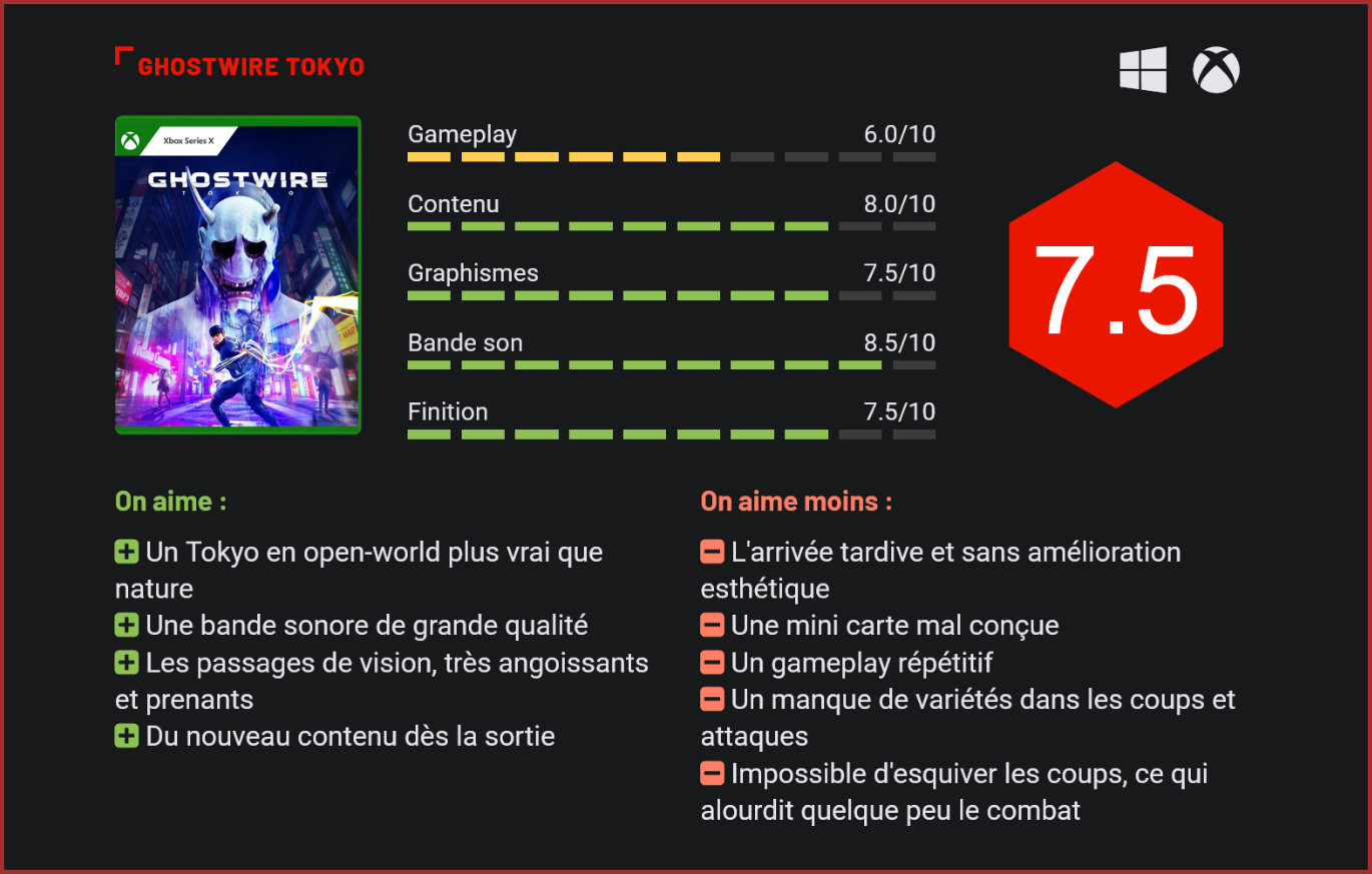 Plus d’un an après sa sortie sur PS5, Ghostwire Tokyo, l’une des premières exclus du catalogue de la PS5, débarque sur Xbox Series et PC. Ghostwire Tokyo restera dans les annales comme la dernière exclu PlayStation de l’éditeur Bethesda Softworks. Racheté depuis par Microsoft, le studio avait déjà porté sur PC et Xbox Series l’excellent Deathloop. Il enchaine aujourd’hui avec Ghostwire Tokyo, le jeu de Tango Gameworks, qui a récemment fait un tabac avec l’excellent Hi-Fi Rush mais qui s’était fait connaitre auparavant pour son travail sur la saga The Evil Within. Le jeu avait reçu un accueil plutôt chaleureux à sa sortie, malgré quelques petits défauts. Ghostwire Tokyo se présente comme un habile mélange de FPS, de survival-horror et d’infiltration dans la mégalopole japonaise de Tokyo, vidée de sa population. Alors que la ville vient d’être mystérieusement vidée de 99% de sa population suite à une malédiction lancée par Hannya, le joueur se retrouve dans la peau d’Akito, un jeune homme qui a survécu à cette apocalypse après avoir été habité par une force mystique appelée KK lui conférant d’incroyables pouvoirs. Ensemble, l’esprit de KK et Akito vont collaborer pour combattre Hannya, sauver les Esprits des Tokyoïtes et lever le voile sur le mystère qui entoure cette malédiction. L’univers visuel du jeu surprend. Pour secourir sa sœur, Akito bénéficie donc des pouvoirs de KK. D’abord un pouvoir de vent, puis ceux du feu et de l’eau, lui permettront d’affronter les âmes tourmentées des Tokyoïtes venues hanter les rues de la capitale. L’intégralité du titre se joue à la première personne et le gameplay prend la forme d’un FPS. Vous tirez avec vos pouvoirs sur les ennemis et devrez vous en défendre en bloquant les attaques des adversaires. Il est possible de charger l’attaque pour infliger davantage de dégâts. Les sensations de tir sont relativement plaisantes même si l’on regrettera que ce ne soit pas davantage rythmé, voire plus nerveux. Aux trois pouvoirs qui s’offrent à vous, est également disponible un arc enchanté aux flèches surpuissantes et des leurres, vous permettant de paralyser les ennemis, de créer un leurre ou encore de vous cacher. Pour utiliser vos sorts, vous devrez trouver de l’Ether, une sorte d’aura ayant envahi l’ensemble de la ville et certains objets. En détruisant ces objets, vous acquerrez de l’énergie supplémentaire et serez dès lors capable d’attaquer vos ennemis. En les parant au bon moment, en arrachant leur cœur (le moyen de les achever) ou en frappant au corps à corps, vous pourrez également récolter de l’Ether. Les affrontements vous permettront quant à eux de récupérer de l’expérience afin de compléter trois arbres de compétences permettant d’améliorer votre pouvoir, votre arc ou encore vos déplacements. Le jeu se joue comme un FPS. Si les affrontements sont très réussis, on regrettera, comme indiqué plus haut, qu’ils manquent parfois de panache. Est-ce parce qu’il est tout simplement impossible d’esquiver les attaques adverses ? Vous encaisserez très régulièrement des dégâts en raison de cet immobilisme partiel et plutôt frustrant. Au lieu de cela, vous devrez courir pour éviter l’attaque ou tout simplement bloquer, même si l’on perd des dégâts lorsqu’on ne réussit pas la parade parfaite. Il y a également le manque de diversité dans les affrontements que nous regretterons. Comme il s’agit d’un FPS, on se contente de marteler la gâchette pour tirer avec les sorts, et c’est à peu près tout. Pour utiliser un objet jetable, il faut par exemple alterner l’attaque sélectionnée, ce qui ralentit le tout. Clairement, c’est sa vue à la première personne qui fonctionne le moins bien. Ghostwire Tokyo est un FPS lent et relativement mou. Par chance, le titre ne se cantonne pas uniquement à des affrontements puisqu’on retrouve également des séquences d’infiltration et de survie. Ce premier se ressent énormément dans certains combats et passages, où il faut par exemple attaquer un boss par derrière sans qu’il ne nous voit pour en venir à bout, ou encore dans les passages où Akito est séparé de KK et qu’il ne peut utiliser ses sorts pour se battre contre une foule d’ennemis. Des passages très réussis et plaisants, qui permettent de varier le gameplay. Le character design est travaillé. Le côté survival se ressent tout au long de l’aventure, que ce soit au niveau des affrontements que de certains moments. Les ennemis principaux, appelés les Visiteurs, sont la représentation parfaite des critiques de la société japonaise. Semblables à de grands Slender Man, les Visiteurs représentent tantôt les Japonais qui se tuent à la tâche au travail puis errent dans les rues la nuit, tantôt les petites Japonaises désespérées de ramener des bonnes notes à leurs parents. Ces âmes errent dans Tokyo sans réel but et apportent une ambiance très malsaine dans la capitale de l’Empire du Milieu. Tout aussi angoissants, les passages de Vision qu’Akito traverse par moments. Dans des couloirs ou environnements fermés, Akito est parfois pris d’hallucinations visuelles causées par Hannya et ses disciples. Des passages juste sublimes, tant d’un point de vue visuel qu’artistiquement, et notamment aidés par une bande sonore juste incroyable. Tokyo, une ville si fidèlement reproduite dans Ghostwire. C’est bien simple, on a l’impression de s’y balader, grâce notamment à la vue en première personne. Si les graphismes y sont pour beaucoup, la construction de la ville est également capitale. Vous devrez débloquer de nouveaux quartiers grâce aux portails Torii parsemés ici-et-là et recouvrant leur quartier d’un épais et dangereux voile de fumée. Si les habitants en chair et en os ne sont plus présents, ce sont donc les Visiteurs qui peuplent la ville, mais ég