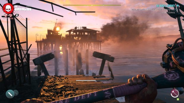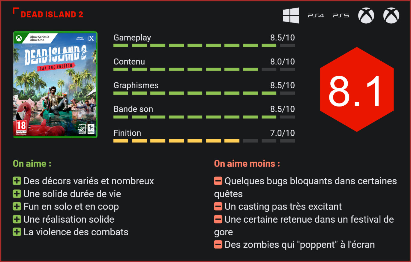 Parmi les plus grosses arlésiennes de l’histoire du jeu vidéo, Dead Island 2 aura décidément fait couler beaucoup d’encre jusqu’à sa sortie. Passé entre les mains de trois studios différents – ce qui n’est généralement pas bon signe -, le jeu parvient à agréablement surprendre et s’impose même comme l’un des meilleurs jeux de zombies de ces dernières années. Explications. Vous vous souvenez peut-être de Dead Island, un “beat them all coopératif à la première personne” dans lequel plusieurs joueurs affrontaient des hordes de zombies dans des environnements tropicaux. Développé par le studio polonais Techland à l’époque, le titre avait reçu un accueil chaleureux des critiques. Au point que plusieurs spin-off seront mis en production les années suivantes. Les fiascos de ceux-ci ont toutefois enterré la franchise quelques années, jusqu’à ce que l’éditeur Deep Silver se décide de lui redonner sa chance en confiant au studio Yager Entertainment – le studio derrière Spec Ops The Line – le développement d’un nouvel opus, en 2014. Fast forward, quelques années plus tard, le projet passe entre les mains de Sumo Digital, auteur de LittleBigPlanet 3, avant d’atterrir entre les mains de Dambuster Studios en 2019, un studio fondé par d’anciens de Free Radical Design (TimeSplitters), qui avait eu beaucoup de mal à convaincre avec son premier jeu (Homefront: The Revolution). Traditionnellement, des annulations successives et redémarrages depuis zéro d’un projet ne sont pas vraiment un bon signe pour les joueurs. La plupart des projets qui ont changé de main se sont très mal finis, avec des titres mal fignolés. L’éditeur n’avait d’ailleurs pas beaucoup communiqué sur le jeu, ce qui laissait planer un doute sur ses qualités. A la surprise générale, Dead Island 2 est toutefois une très bonne surprise. Techniquement, Dead Island 2 surprend agréablement. Pourtant, on ne va pas vous le cacher, on ne peut pas vraiment parler d’une suite très originale puisque dans les faits, le jeu n’a presque pas évolué. Le concept reste le même : on incarne un survivant à l’apocalypse zombie dans un milieu plus ou moins tropical (en l’occurrence, les beaux quartiers de L.A.). Le jeu se joue entièrement à la première personne et se présente avant tout comme un beat them all puisque durant toute la première moitié du titre vous vous battrez avec des armes blanches et vos poings. Dans la seconde moitié du jeu, Dead Island 2 parvient à agréablement se renouveler avec des armes à feu et surtout des pouvoirs particuliers. Plongé au cœur d’une ville en pleine quarantaine, le joueur va devoir explorer les environs seul ou avec deux amis en coop – mode dans lequel le gameplay du jeu brille particulièrement. Chaque carte est de taille modeste, mais le joueur a une totale liberté dans l’exploration de ces mini mondes ouverts. Il pourra choisir d’avancer dans la mission principale, de réaliser des missions secondaires qui demandent généralement d’aider des citoyens en difficulté, de se lancer dans des recherches de civils disparus, ou simplement collecter des ressources qui lui permettront d’améliorer son arsenal. De nuit, le danger rôde partout. Dead Island 2 brille particulièrement au niveau de son gameplay, assez technique et exigeant avec son système d’esquive, son arsenal immensément varié et la customisation d’arme qui permet d’appliquer différents effets comme une électrocution ou un choc avec certaines armes blanches. La personnalisation est extrêmement poussée et il devient ainsi possible de réaliser de formidables combos avec ses armes. L’arsenal va de la batte de baseball à la mitrailleuse lourde, en passant par la hache de pompier au fusil à pompe. La diversité est au rendez-vous et on ne va pas vous mentir, la partie combat est très réussie avec de solides sensations et surtout beaucoup de gore. Les corps des zombies ont été modélisés de sorte à ce que le joueur puisse découper chaque partie indépendamment : bras, jambe, buste, tête… On voit même l’effet des brûlures et électrocutions directement sur la peau! Dead Island 2 est incontestablement l’un des jeux les plus violents de ces dernières années. On retrouve aussi une belle diversité au niveau des zombies. Outre les “runners” qui vous courseront en hurlant sur des centaines de mètres, et les “walkers”, qui sont les ennemis les plus basiques, on retrouve des tanks particulièrement brutaux au corps à corps, des “screamers” qui appellent des groupes de zombies en aide et vous repoussent de plusieurs mètres à chaque cri, et plusieurs variations de chaque type d’ennemi, avec divers éléments, comme l’acidité, le feu… Et puis bien sûr, quelques boss bien costauds. On retrouve pas mal de diversité dans le bestiaire. Dead Island 2 parvient à agréablement surprendre dans sa narration, soignée, au niveau de son univers aussi, avec des décors variés et extrêmement réussis, qui reprennent plusieurs lieux emblématiques de L.A. On reconnait ainsi facilement Hollywood, Beverly Hills ou encore Santa Monica. Au niveau de la progression, tout se fait très naturellement. On passe d’une zone à l’autre de la ville très facilement, on progresse sur plusieurs quêtes en même temps et à l’exception de quelques passages un peu moins réussis, la progression est vraiment plaisante. On reprochera en revanche à Dead Island 2 d’en faire à la fois trop et pas assez. On vous explique. Le jeu est un véritable festival de gore : les membres volent dans tous les sens, le sang gicle par hectolitres, les créatures croisées ont de quoi vous donner le frisson. Et en même temps, le jeu met en place toute une série d’interdits : ne vous attendez pas à croiser un enfant, un bébé ou un handicapé. Dead Island 2 reste étonnamment propret et tente à tout prix d’éviter les polé