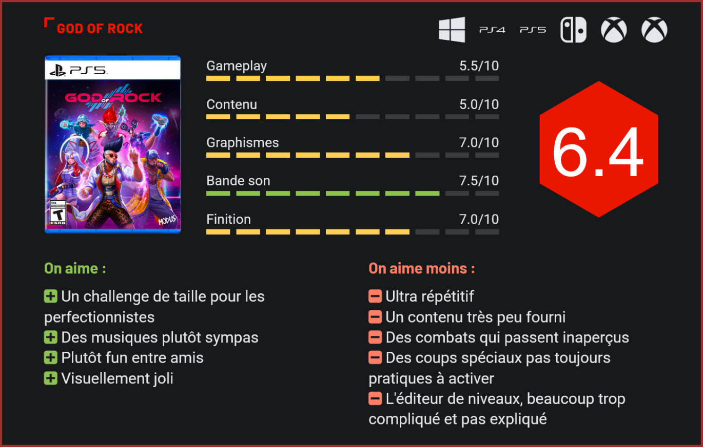 Combiner Street Fighter et Guitar Hero, vous en rêviez ? Les Californiens de Modus l’ont fait, avec God of Rock. Nous ne sommes toutefois pas certains que c’était le mix idéal. God of Rock est, ce qu’on peut appeler dans le jargon du gaming, un ovni vidéoludique. Modus, le studio derrière le développement du jeu, est habitué de ce genre d’expériences peu flatteuses pour l’industrie. Nombreux sont les ratés des Californiens, God of Rock est donc l’occasion pour le studio de redorer son blason. Et c’est avec un … jeu de baston musical que les Californiens entendent marquer le coup. Un peu de Guitar Hero par ici pour l’aspect musical et rythmique et du Street Fighter par là pour la baston et le character design. Oui, vous avez bien lu, difficile de croire que deux jeux que tout oppose puissent être réunis dans une seule et même production. Et pourtant, les développeurs de Modus l’ont fait. Le résultat est plutôt surprenant, et ce, dans les deux sens du terme. Comme pour meubler, les développeurs ont imaginé un semblant de scénario qui s’incruste très bien dans l’ambiance du titre. Le Dieu du Rock est d’humeur jouette et taquine. Il a ressuscité les plus grands musiciens de l’histoire, tous fictifs bien que parfois inspirés de vrais chanteurs comme Elvis, et leur a lancé à chacun le défi d’obtenir la suprématie musicale. Ils vont ainsi devoir se battre entre eux sur fond de musiques endiablées pour devenir le numéro un. Pour ce faire, les 12 anti-héros vont se livrer une bataille sans merci sur fond de mélodies hard-rock, électro ou encore pop. Le concept est simple : les combats se font par affrontements 1v1, contre l’IA ou un ami, lors desquels il faut appuyer au bon moment sur la bonne touche. Une bonne coordination est nécessaire donc, puisque chaque faux pas ou misclick causera la perte d’une partie de vos PV. À l’instar d’un Street Fighter ou de tout autre jeu de combat, c’est en arrivant à bout de la jauge de vie de l’adversaire que vous remporterez la partie. En mode facile, vous arrivez rapidement à bout de votre adversaire, mais si vous optez pour le mode “God of Rock”, alors vous risquez vite de vous retrouver dans les choux. Visuellement, le titre est plutôt sympa. Dommage que les visuels passent inaperçus avec les combats qui demandent de rester constamment attentifs. Mais pour cela, diverses ruses sont à votre disposition, à savoir les multiples coups spéciaux. En combinant des mouvements avec le joystick droit et l’activation avec la touche R2, vous aurez la possibilité de lancer un “sort” permettant de perturber le combattant adverse : accélération du défilé des touches, touches qui clignotent et disparaissent, apparition subite de touches trompeuses… Des outils plutôt sympas, mais qui sont assez compliqués à activer. En effet, pour les actionner, vous devez arrêter d’appuyer sur vos combinaisons, ce qui provoque irrémédiablement une perte de votre jauge de vie. Concernant les combats, l’accent a principalement été mis sur le fun et l’amusement. À partager sans modération avec un ami, God of Rock assurera de très sympathiques soirées entre amis ou en famille, que ce soit avec des enfants ou des plus grands. Seul, le soft peut vite s’avérer redondant et répétitif. D’une part en raison d’un contenu famélique (nous y reviendrons), mais aussi et surtout à cause d’une rejouabilité très pauvre, puisqu’on fait tout le temps la même chose, sans diversité aucune. Précision et rapidité sont la clé pour battre votre adversaire. Côté contenu donc, c’est extrêmement pauvre. Niveau gameplay d’une part, puisque seulement 12 personnages sont mis à disposition du joueur. Malheureusement, le style de combat ne varie pas suffisamment entre chacun d’entre eux, en tout cas de prime abord. En effet, on s’attarde principalement sur le combo et le tempo des touches et n’avons absolument pas le temps d’admirer les combats qui sont pourtant très réussis et stylisés. D’autre part, c’est les modes de jeu qui ne sont vraiment pas nombreux. Seuls un mode arcade en ligne, en local ou en solo, un mode entraînement et un éditeur de niveaux sont proposés. L’arcade dispose de quelques cinématiques liées au personnage choisi, mais c’est vraiment trop maigre. Quant à l’éditeur de niveaux, qui est vraiment trop léger lui aussi, on regrettera que rien ne nous soit expliqué et que nous soyons plongés dans le grand bain sans explication aucune. Dommage, car le potentiel est là, ne restait plus qu’à l’exploiter. En revanche, là où les développeurs ont fait fort, c’est la direction artistique de leur titre. Graphiquement parlant, sans être superbe, God of Rock est plutôt joli et jouit, notamment, d’un univers qui lui est propre et qui est vraiment fun et sympa. La musique joue justement un grand rôle là-dedans (et heureusement pour un jeu musical) et assure des parties endiablées, rythmées et frénétiques. Conclusion God of Rock n’est certainement pas dénué de défauts, bien au contraire. Mais vous ne risquerez pas de vous ennuyer en y jouant avec des amis. Mélange de Street Fighter et de Guitar Hero, le titre requiert de vous une habileté et une dextérité à toute épreuve pour appuyer sur la bonne touche au bon moment. Problème : si vous décidez d’y jouer seul, vous risquez de très vite vous ennuyer. Contenu famélique, gameplay répétitif et visuels qui passent au second plan, God of Rock n’est assurément pas fait pour s’y aventurer en solo. La direction artistique et le gameplay entre amis sauvent les meubles. Mais si vous n’avez personne dans votre entourage qui serait intéressé à passer son temps sur God of Rock avec vous, alors passez sans hésitation votre chemin.