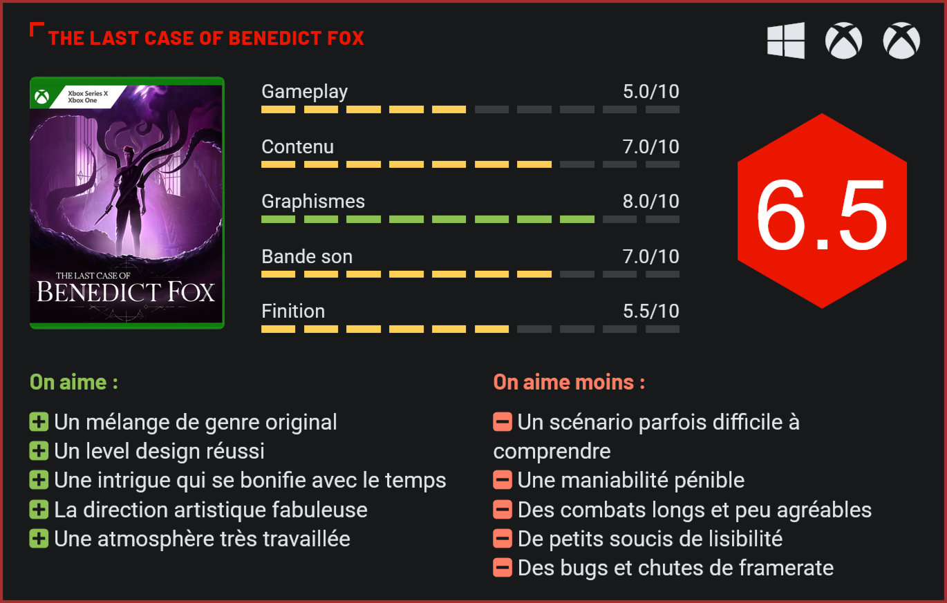 Annoncé en juin 2022 dans une présentation de la marque Xbox, The Last Case of Benedict Fox est un Metroid-like qui faisait de l’œil aux fans du genre. Disponible depuis quelques jours sur PC, consoles Xbox et sur le Game Pass, le résultat se révèle moins brillant qu’espéré. The Last Case of Benedict Fox nous vient tout droit de la ville de Cracovie, en Pologne. Les développeurs de chez Plot Twist proposent ce nouveau titre qui diffère de leurs précédentes productions, ayant travaillé avant cela sur la série de jeux de course “Drift Zone”. Leur nouveau titre, qui avait un peu fait parler de lui lors de présentations Xbox, est un Metroid-like auquel ils ajoutent des éléments de réflexion inspirés de jeux d’enquête. Un mélange original qui ne met malheureusement pas le jeu à l’abri de nombreux soucis. Dans cette aventure se déroulant quelques années après la première guerre mondiale, nous incarnons Benedict Fox, un détective accompagné d’une créature démoniaque mystérieuse qui réside dans son corps. Alors qu’il est pourchassé par une organisation secrète, le protagoniste débarque dans un manoir appartenant à son père. Benedict va très vite découvrir que son paternel n’est plus de ce monde, et va décider d’enquêter pour comprendre comment c’est arrivé. La créature habitant le détective va se montrer utile puisque ses pouvoirs permettent de voyager dans un monde où résident les souvenirs des défunts. Les différents environnements sont souvent esthétiquement réussis. Le début de l’aventure ne laisse pas une très bonne impression. Si The Last Case of Benedict Fox nous laisse très vite jouer, il aurait peut-être fallu prendre un peu plus de temps pour poser les bases de ce scénario qui semble presque incompréhensible au départ. La narration s’améliore au fil du jeu, mais il est parfois difficile de suivre tant le début paraît confus. Le titre ne nous prend certainement pas par la main, ce qui a le mérite de nous immerger dans son ambiance pesante. Le gameplay de The Last Case of Benedict Fox va se diviser en deux parties distinctes. Dès le début, notre personnage débarque dans le manoir de son père et commence son enquête en réunissant indices et objets dans le but de trouver de quoi ouvrir les nombreux mécanismes et portes qui cachent les secrets de l’habitation. Les pouvoirs de notre protagoniste lui permettent également de plonger dans les souvenirs de son père décédé, qui prennent la forme d’un monde cauchemardesque et lovecraftien. À partir de ce moment, l’aventure de Benedict se déroule comme dans un Metroid-like traditionnel. Il faut parcourir des environnements labyrinthiques dont de nombreux passages nous sont inaccessibles, nécessitant différents types d’améliorations et de pouvoirs pour progresser dans ce monde. Cependant, le titre propose une progression en miroir entre nos découvertes dans le manoir et notre exploration dans les souvenirs d’autrui. Les labyrinthes cachent des indices et objets qu’il faut utiliser pour résoudre de sympathiques puzzles dans le manoir. L’exploration de ce monde chaotique peut s’avérer pénible malgré un bon level design. En plus de cette exploration en 2D, le titre propose aussi de la plate-forme ainsi que des combats. Ces moments particulièrement pénibles mettent en lumière l’un des gros soucis du jeu : sa maniabilité. Benedict semble particulièrement lourd et notre contrôle sur le personnage manque cruellement de précision, ce dont on se rend vite compte lorsque nous sommes confrontés à quelques passages de plate-forme. Des ennemis peuplent aussi ce monde chaotique, ainsi qu’une très petite quantité de boss. Pour se défendre, Benedict possède un couteau qui lui permet d’attaquer au corps-à-corps, ainsi qu’un révolver qu’il est possible d’améliorer. Notre personnage gagne évidemment en capacités au fil du jeu. À défaut de rendre les combats amusants, ces nouvelles aptitudes les rendent tout de même moins pénibles. Notez que différentes options de difficulté permettent de rendre l’expérience plus ou moins difficile, dont les combats qui seront donc plus ou moins fastidieux. Malgré ses soucis de gameplay, cette aventure n’est pas déplaisante à parcourir. Le level design est soigné et les allers-retours entre les différents endroits sont simplifiés par les nombreux points de téléportation. Une bonne dizaine d’heures est nécessaire pour voir le bout d’un scénario qui se bonifie avec le temps, et trouver tous les collectables augmente bien sûr la durée de vie. Le jeu propose très peu de combats de boss. Là où The Last Case of Benedict Fox impressionne, c’est plutôt par sa direction artistique maîtrisée. Si le titre est techniquement perfectible, force est de constater qu’il est visuellement très réussi. Le manoir et ses différentes pièces empruntent une esthétique basée sur le début du vingtième siècle, tandis que le monde des souvenirs propose une ambiance bien plus sombre et effroyable, s’inspirant des travaux de H. P. Lovecraft. Dans les deux cas, le résultat est très convaincant malgré certaines folies visuelles qui occasionnent quelques soucis de lisibilité dans notre exploration. La bande-son propose également des morceaux efficaces qui se marient parfaitement avec l’atmosphère sombre du jeu. Nous pouvons cependant noter quelques petits soucis de sound design, dont des bruitages pas toujours très convaincants. Si les idées sont là, l’exécution est un peu moins convaincante. The Last Case of Benedict Fox donne parfois l’impression qu’il essaye de faire trop de choses en même temps, et qu’il aurait pu bénéficier d’un peu plus de temps de développement. Quelques bugs et crashs surgissent occasionnellement, de même que des chutes de framerate dépendant de notre machine. Un constat fâcheux tant le titre propose une ambiance mar