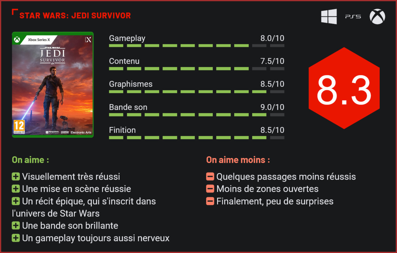 Avec Jedi Survivor, Respawn Entertainment nous livre enfin la suite tant attendue de Jedi Fallen Order, probablement l’une des adaptations de Star Wars parmi les plus réussies en jeu vidéo. Et, bonne nouvelle, sa suite n’a pas à rougir. Sorti il y a quatre ans déjà, Jedi Fallen Order était parvenu à séduire les fans de la saga avec son scénario inédit et son gameplay technique. Cal Kestis et son droïde BD-1 nous livrent aujourd’hui la suite de leur récit à travers Jedi Survivor, la suite directe de Fallen Order. Avec le studio Respawn aux commandes, on n’avait pas trop à s’en faire sur les qualités du titre. Et il faut bien l’avouer, le studio américain a tenu toutes ses promesses avec cette suite, qui s’inscrit dans la continuité directe du premier épisode tout en apportant son lot de nouveautés. Au passage, on applaudira le choix de l’éditeur de tout miser sur les versions “new-gen”. De facto, Jedi Survivor n’est disponible que sur PC, PS5 et Xbox Series. Un choix qui aura permis au studio Respawn de proposer des environnements beaucoup plus riches visuellement grâce à la puissance des consoles de nouvelle génération. L’aventure commence assez mal pour notre héros… L’histoire du jeu prend place peu après les événement survenus dans Fallen Order. Cal Kestis est traqué à travers la galaxie par l’Empire. L’histoire du jeu débute avec son arrivée sur Coruscant. Kestis est en mauvaise posture : le jedi est sur le point d’être livré à un sénateur. Il s’engage, dans cette suite, dans une nouvelle quête qui l’amènera à découvrir une façon de protéger ses semblables. Agréablement mis en scène à travers de nombreuses cinématiques, le scénario de cette suite n’est toutefois clairement qu’un prétexte à nous faire voyager à travers la galaxie et explorer de multiples planètes. Côté gameplay, ceux qui ont fini Fallen Order savent à quoi s’attendre. On est ici face à un jeu d’action-aventure assez linéaire, contrairement à son prédécesseur, qui proposait des zones beaucoup plus ouvertes. Et c’est probablement le principal reproche que l’on fera à Survivor, qui se présente comme un titre plus linéaire que Fallen Order, avec un rythme plus soutenu. Rassurez-vous toutefois, on retrouve bien des zones ouvertes. Elles sont néanmoins moins nombreuses que dans le premier épisode. Vous serez ainsi amené à explorer “Koboh”, une planète rocheuse que vous pourrez explorer à de multiples reprises durant l’aventure, pour en découvrir tous les secrets… On reste également sur une formule similaire à celle de Jedi Fallen Order niveau gameplay avec une alternance de séquences de combats, d’exploration et de plates-formes. Une formule finalement pas si éloignée d’un Tomb Raider… Visuellement, le jeu fait forte impression. S’il s’inscrit dans la suite de Fallen Order, Survivor introduit toutefois quelques petites nouveautés au niveau du gameplay. Très tôt dans l’aventure, notre jedi s’équipe d’un grappin qui lui permet de s’accrocher à divers éléments du décor pour explorer verticalement les décors. Pratique. Plus tard, il récupérera un “dash aérien”. Une nouvelle posture de combat est ajoutée avec le “blaster”, qui permet de mixer les attaques au corps à corps et à distance. Comme son prédécesseur, Jedi Survivor intègre également un système de gain d’expérience qui permet de débloquer des capacités pour notre cher jedi. Un système bien pensé, qui permettra surtout de ressentir une véritable montée en puissance du personnage au cours de l’aventure. L’arbre de compétences est bien fourni et permet de forger un personnage sur base de ses envies. Le système de combat, lui, reste assez technique, et en ce sens un poil inspiré de celui d’un Souls-like. Quelques coups suffisent ici à vous mettre au sol. On attend de vous l’excellence, et donc une capacité à éviter les blasters de vos ennemis et à virevolter entre les tirs. La bonne nouvelle, c’est que si le jeu vous paraît trop difficile, il est possible de réduire le niveau de difficulté à tout moment. On retrouve en tout cinq niveaux de difficulté, dont un mode “histoire” qui simplifiera grandement les combats. Les combats sont toujours aussi techniques. Outre par sa réalisation somptueuse, Jedi Survivor est également porté par ses séquences de jeu épiques. Des séquences au cours desquelles vous devrez utiliser la force pour détruire des pans entiers des décors aux affrontements de boss en passant par des attaques éclairs, vous aurez votre quota d’adrénaline. Le rythme est beaucoup plus soutenu que dans l’épisode original et du point de vue narratif, de gros efforts ont été consentis pour nous immerger dans un véritable film interactif. Alors oui, Jedi Survivor ne réinvente pas vraiment la roue. Les développeurs n’ont pas pris de gros risques avec cette suite, qui est finalement très classique et ne parvient jamais vraiment à nous surprendre. On évolue toutefois ici à travers une aventure parfaitement maîtrisée, très joliment mise en scène et les vétérans du premier volet auront tout de même droit à quelques nouveautés. Si vous n’aviez pas placé la barre trop haut, vous ne devriez donc pas être déçu par la suite des aventures de Cal Kestis. Si troisième épisode il y a, il faudra toutefois amener plus de nouveautés. Une chose est sûre : cette suite brille avant tout par son excellence au niveau de sa réalisation. Visuellement, le résultat est très propre, la narration est soignée, la bande son épique et le jeu est parfaitement optimisé pour les consoles new-gen avec de superbes effets visuels et du ray-tracing à gogo. Bref, un véritable spectacle à couper le souffle. Conclusion Marchant sur les traces de Fallen Order, Jedi Survivor est une suite très réussie, qui reprend dans les grandes lignes la formule de 