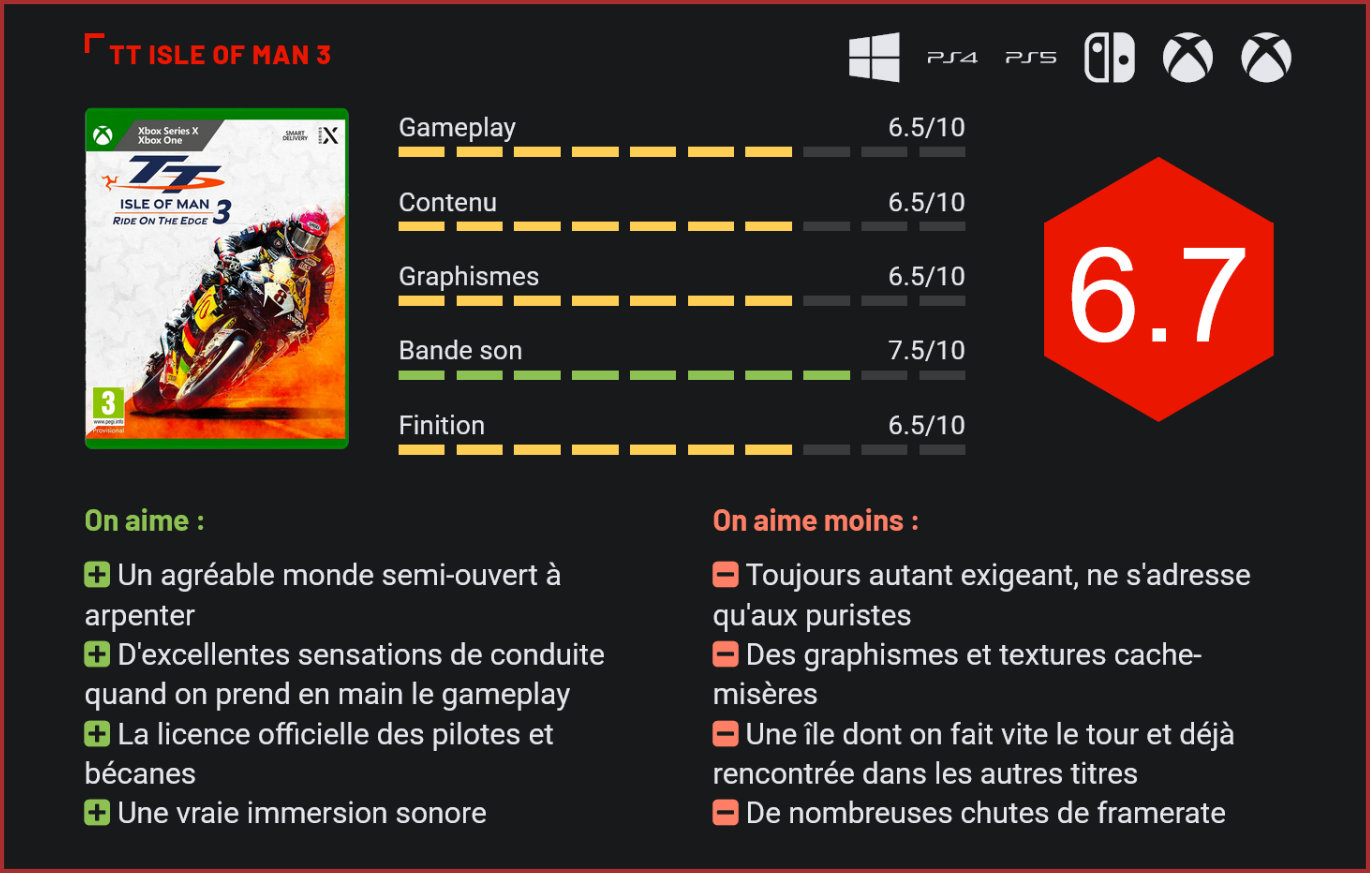 Jamais deux sans trois. Nacon remet le couvert cette année avec un troisième épisode de sa franchise de moto consacrée au Tourist Trophy de l’île de Man, censé se dérouler début juin. Un troisième opus enfin abouti ? Pas nécessairement… Les adages “jamais deux sans trois” et “on prend les mêmes et on recommence” sont habituels dans le microcosme des jeux vidéo de sport. Les FIFA ou F1 d’EA Sports sont coutumiers du fait, et certains autres studios ne semblent pas non plus motivés à renouveler leur formule d’une année à l’autre. C’est le cas de Nacon et RaceWard, les développeurs de la franchise TT Isle of Man depuis cinq ans. En autant d’années et trois épisodes, le moins que l’on puisse dire est que la franchise ne s’est pas vraiment renouvelée, loin de là. L’île de Man, c’est un petit bout de terre situé en mer d’Irlande, pile entre la Grande-Bretagne et l’Irlande. Dépendance de la Couronne britannique, cette toute petite île de 83.000 habitants organise chaque année sur ses routes la Tourist Trophy, et ce depuis 1907. Une course de motos de 60,32 km qui traverse les villages et plaines de l’île britannique. Devenue mythique, cette course a fait l’objet de nombreuses adaptations vidéoludiques, dont TT Isle of Man Ride on the Edge. Isle of Man 3 est le premier épisode de la franchise à sortir sur consoles de neuvième génération, à savoir la PS5 et les Xbox Series. A ce titre, nous sommes en droit d’espérer de la part des développeurs une nette amélioration graphique par rapport au précédent épisode, d’autant que les graphismes de celui-ci n’étaient pas glorieux. Malheureusement, l’arrivée sur une nouvelle génération de consoles n’aide absolument pas à l’amélioration des graphismes qui paraissent toujours aussi vieillots. A première vue, le titre paraît joli. Mais quand on s’attarde aux détails, on se rend compte que les textures font office de cache-misère. En réalité, c’est bien plus complexe que ça n’y paraît. Si vous jouez à TT Isle of Man 3 à toute allure, ce que vous ferez 95% de votre temps, le titre vous paraitra plutôt joli voire même très beau. Mais c’est en partie grâce à l’effet de flou appliqué par les mouvements et la vitesse. En se concentrant sur les différents éléments du décor, on s’aperçoit très vite que ceux-ci sont brouillons et répétitifs. Les arbres sont pratiquement tous les mêmes avec l’un ou l’autre changement au niveau de la taille par exemple, et les différents environnements ne varient pas beaucoup entre eux. Indéniablement, en recréant un jeu sur la même course pour la troisième fois, on ne peut éviter une certaine redondance au niveau de l’aire de jeu. L’île de Man n’est pas très grande et, malgré le semi monde ouvert sur lequel nous reviendrons, on a quand même l’impression de voir encore et encore les mêmes paysages et décors. Ce n’est pas vraiment pas très varié, et les spectateurs présents au bord de la route ne sont vraiment pas réussis ni bien animés. En revanche, notons la très juste modélisation des différentes motos. Criantes de réalisme, on a sincèrement l’impression de piloter les bécanes officielles des pilotes qui, eux aussi, sont sous licence officielle. Au total, ce sont 38 pilotes et une dizaine de véhicules qui sont proposés, pour une conduite des plus compliquées, aux manettes de Supersport (des motos de 600 et 750cc) et de Superbike (des motos de 1000cc). Depuis trois épisodes, le terrain de jeu reste le même : l’île de Man. Il n’y a dès lors plus beaucoup d’intérêt dans la franchise si elle ne se renouvelle pas suffisamment. Nous avons ainsi la possibilité de conduire une Honda CBR 600 RR, une Kawasaki ZX-10RR ou encore une Yamaha YZF-R6 qui, si elles sont génialement modélisées, bénéficient aussi d’une représentation sonore des plus réussies. Montée en régime, passages de rapports ou encore freinage, on a réellement l’impression d’être à bord de ces motos surpuissantes. Ajoutez à cela des commissaires qui sifflent au passage d’un véhicule pour avertir les spectateurs ou encore des musiques rock pendant les courses, et l’immersion est totale. Abordons désormais le gros point noir de la franchise : sa jouabilité. La maniabilité des motos est ultra exigeante, à tel point que ce ne sera pas donné à tout le monde de piloter les motos sans vous retrouver dans les roses. C’est ultra compliqué, et il faudra ainsi plusieurs heures de jeu avant de correctement piloter les bécanes. Le moindre passage dans l’herbe, sur un trottoir ou le moindre frottement avec une haie sera fatal et vous coûtera littéralement votre course. Toutefois, la persévérance est évidemment récompensée, et dès que vous aurez compris les rouages du gameplay, le kiffe sera de mise. Le gameplay est ultra exigeant. Indéniablement, le jeu ne s’adresse pas à Monsieur et Madame Tout-le-monde. Comme pour les précédents opus, Nacon et RaceWave ont opté pour un monde semi-ouvert. S’il vous est bien évidemment possible de vous balader comme bon vous semble sur les 571 km² de l’île, il vous sera impossible de prendre des raccourcis et de rouler dans les champs. Vous êtes cantonnés à la route, ce qui est à peu près normal quand on sait à quel point c’est déjà difficile de rouler sur du bitume. Côté contenu, nous avons le droit à un mode carrière divisé en saison incluant des événements, le tout nous menant à la fameuse course Tourist Trophy. Un mode course rapide, un multijoueur en ligne et des défis hebdomadaires et mensuels sont également au programme. A la manière d’un RPG, le titre nous propose d’acquérir diverses pièces allant d’une rareté légère à importante. Celles-ci nous permettent alors d’améliorer notre tenue de route par temps humide, de réduire l’usure des pneus ou encore la température des fre