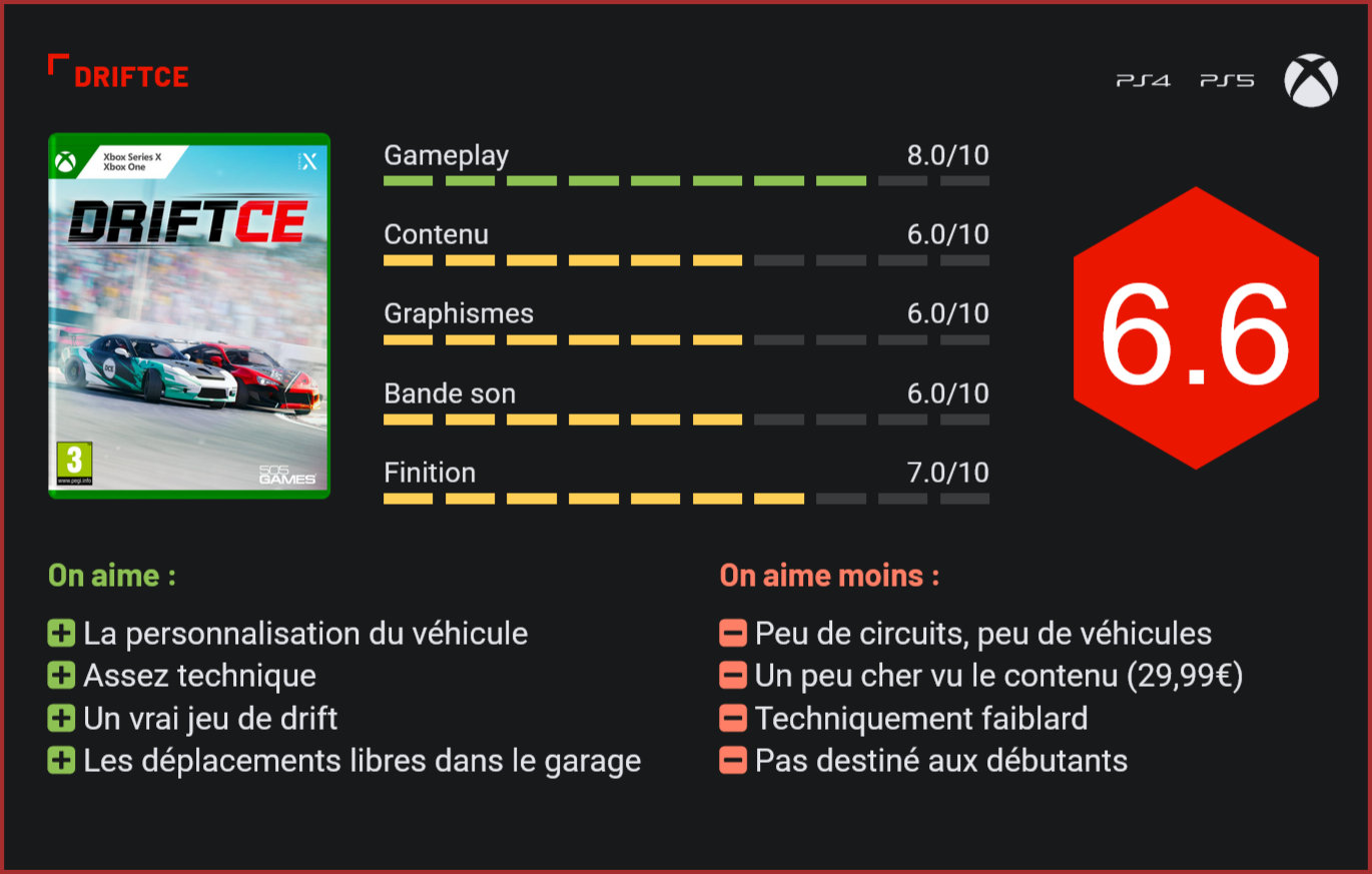 505Games rempile pour un nouvel épisode de sa série de jeux de drift. Et pour cette cuvée 2023, l’éditeur a mis les petits plats dans les grands pour nous proposer un jeu à la hauteur de nos attentes. Si le drift et le tuning n’ont pas autant la cote qu’il y a 20 ans, 505Games s’est mis en tête depuis quelques années de développer une simulation ultime de drift. Sur consoles, il propose cette année DriftCE, une version spéciale du nouvel opus. Derrière ce projet, on retrouve les développeurs de Car Mechanic Simulator, qui s’étaient déjà essayé à la conduite avec Drift21 il y a deux ans. Le garage est le hub central du jeu. Alors bien sûr, DriftCE ne s’adresse pas à un public très large. Il cible les passionnés de drift et ceux qui s’intéressent à la discipline. Pas de courses ici, de drag, ni de rallye. Tout le gameplay se concentre sur du drift sur circuits. Il vaut mieux le savoir avant de s’y lancer, sans quoi vous risquez d’être assez déçu. Autre mise en garde, niveau contenu, il ne faudra pas en attendre trop non plus. On retrouve une dizaine de circuits et douze véhicules en tout et pour tout. Parmi ceux-ci il y a quelques classiques comme la Ford Mustang, la Mazda MX5 ou encore la BMW E48. C’est peu mais le jeu propose de customiser dans les moindres détails chaque véhicule avec plus de – accrochez-vous – 1800 pièces détachées. Et il faut bien l’avouer, c’est plutôt bien fichu puisqu’on peut personnaliser l’esthétique de son véhicule dans les moindres détails mais aussi influencer sa conduite en en changeant tous les éléments. Chaque élément du véhicule peut être customisé. D’ailleurs, c’est loin des gros points forts du titre, qui, si à la base, cible les amateurs de drift, se révèle être un excellent jeu de tuning également. On le sent, les développeurs sont des passionnés et ont déjà travaillé sur plusieurs simulations de customisation de bolide. D’ailleurs, cette partie est sans l’ombre d’un doute la plus réussie du jeu. Côté course et drift, ça se complique un peu. Tout d’abord parce qu’on est face à une simulation. Ce n’est pas très accessible et surtout, c’est 100% centré sur le drift. Autant vous dire qu’il faut vraiment être fan pour accrocher. Visuellement, le jeu est loin de mettre une claque. Pad en main, le jeu est plaisant, mais il vous faudra une ou deux heure d’apprentissage pour vous rôder. Le moindre déplacement du stick peut vous faire partir en vrille et il faut donc être très précis. En ce sens, le jeu est donc plutôt réussi, mais dans la carrière, on a tendance à vite tourner en rond sur les quelques circuits et visuellement, le titre est loin de nous en mettre plein les yeux. Il vous faudra donc beaucoup de patience pour y prendre goût et également être relativement peu regardant sur l’esthétique… Sur le long terme, les passionnés trouveront toutefois la conduite grisante. Comme on l’a précisé toutefois, DriftCE est plus réussi dans sa partie conception. Passer beaucoup de temps à concevoir sa voiture ultime pour ensuite l’essayer sur circuit est grisant. Participer aux courses et remplir les challenges, un peu moins. A 29,99€, on lui pardonnera volontiers ses petits défauts pour se concentrer sur ce qui marche. Une chose est sûre toutefois : la formule peut encore être (pas mal) améliorée. Conclusion DriftCE n’est pas un jeu de course comme les autres. Ici, tout est basé sur la conception d’un véhicule. Le joueur peut choisir jusqu’à 1800 pièces différentes pour customiser l’un des douze véhicules mis à disposition. La partie grisante, c’est de tester sa création sur le circuit, après des dizaines de minutes à travailler dans le garage. La conduite a un peu plus de mal à séduire car DriftCE est exigeant et il faut bien l’avouer assez répétitif avec sa dizaine de tracés. Les courses sont réussies, mais on tourne vite en rond. Visuellement, on n’est pas non plus face à une claque graphique. A 29,99€, on acceptera volontiers ses petits défauts pour se concentrer sur ce qui marche, mais inutile de le préciser : DriftCE est un jeu qui s’adresse avant tout aux passionnés de tuning et de drift.