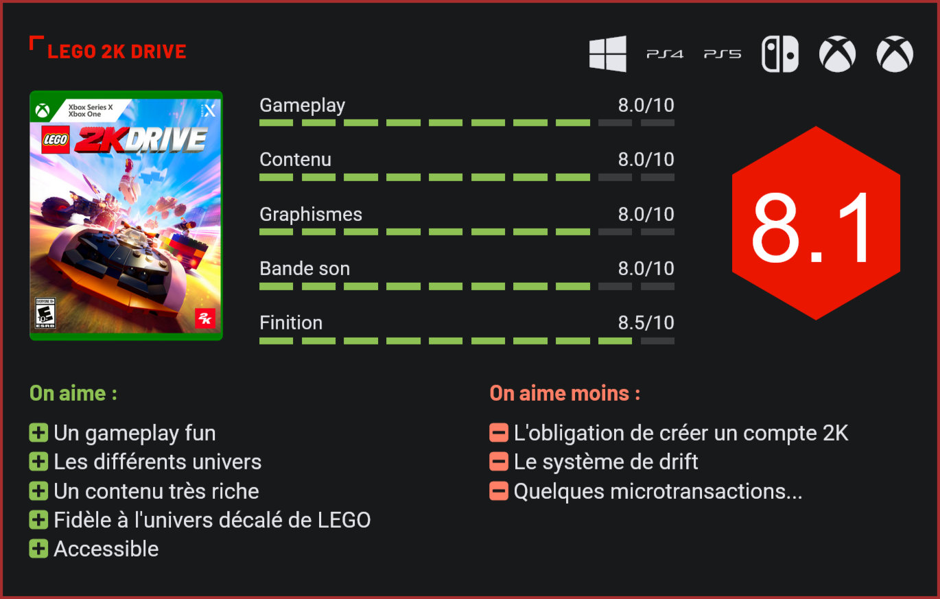 Annoncé il y a quelques semaines seulement, Lego 2K Drive est l’une des bonnes surprises de cette année 2023. Sorti de nulle part, le jeu de course de Visual Concepts fait mouche à tous les niveaux. Derrière plus d’une trentaine de simulations sportives, le studio Visual Concepts a certainement bondi de joie le jour où il s’est vu proposer par 2K Games de faire quelque chose de “différent”. Le studio s’est vu confier le développement de Lego 2K Drive, un jeu de course déjanté dans l’univers des célèbres briquettes, axé jeune public mais pas que puisque tout le monde y trouvera certainement son compte. Lego 2K Drive se présente comme un jeu de course arcade, quelque part à mi-chemin entre un Mariokart (pour l’univers coloré et l’utilisation de power-ups dans les courses) et un Forza Horizon (pour la conduite et l’open-world. On parle ici d’open-world, mais en réalité, le jeu donne accès à plusieurs mini mondes ouverts aux ambiances très différentes. Les différents univers du jeu proposent diverses ambiances. Chaque open-world propose quantité d’événements : des courses qui vous feront avancer dans le scénario principal, des défis de différentes catégories, des quêtes secondes, des collectibles… qui permettront tous de débloquer des pièces pour créer le véhicule de vos rêves, de nouveaux véhicules et personnages… Et mine de rien, le contenu du jeu est tout simplement gargantuesque quand on prend en compte les épreuves secondaires, aussi variées qu’originales. Car ici, on est loin de se limiter à de simples courses sur circuits. Dans certaines épreuves, il vous faudra par exemple tenter de récupérer des missiles, puis désespérément tenter des les ramener à leur propriétaire, en jouant contre leur physique de propulsion. Dans d’autres, vous serez amené à participer à une épreuve inspirée de Squid Game, dans laquelle vous devrez atteindre une position en vous arrêtant à chaque fois qu’un robot se retourne, pour éviter l’élimination directe. Il y a là beaucoup d’originalité mais aussi de fun! Côté conduite, le jeu parvient également à séduire, avec une conduite très arcade qui se rapproche beaucoup de celle d’un Forza Horizon. C’est très accessible, fun et complètement décomplexé. On roule à toute berzingue en envoyant des power-ups à la figure de ses opposants, sur des circuits complètement décalés. Seul défaut d’après nous de cette conduite : le drift, qui s’active avec la gâchette gauche, mais nécessite donc de maintenir le stick droit activé en même temps pour accélérer… Bof. Les compétitions sont endiablées. Lego 2K Drive surprend aussi par sa richesse. Le jeu n’est pas un bête jeu de course puisqu’il propose de vastes open-worlds qui recèlent d’activités secondaires et de secrets à découvrir. En plus, on ne se limite pas ici à la conduite d’un seul et unique véhicule puisque votre véhicule changera littéralement de forme selon la surface sur laquelle vous roulerez. Un véhicule de course sur le tarmac, une sorte de kart sur la terre battue, et un hors-bord sur l’eau. Ce qui a permis aux développeurs de concevoir des circuits encore plus fous, avec des sauts prodigieux. Visuellement, le jeu est fidèle à la marque Lego. Autre atout du jeu, il est possible d’y concevoir le véhicule de ses rêves. Comme on l’a dit plus haut, on débloque de nouvelles pièces, véhicules et personnages en progressant dans l’aventure. Les passionnés de petites briques pourront, avec celles-ci, concevoir le véhicule de leurs rêves en personnalisant l’apparence et le style de leurs bolides. Une idée joliment exploitée qui apporte une vrai touche de construction au titre. En définitive, difficile donc de ne pas être agréablement surpris par ce jeu de course arcade à la fois très fun et généreux en contenus. Certes, on pourra lui reprocher l’intégration de quelques microtransactions, son season pass coûteux qui annonce déjà de nouveaux contenus et l’obligation de créer un compte 2K pour accéder à certaines fonctions, dont le multijoueur. Mais globalement, la formule fonctionne très bien et le jeu s’avère étonnamment fun. Les courses en hors-bord sont extrêmement funs. Sur le plan technique, Lego 2K Drive s’en sort également très bien, avec des décors soignés qui regorgent de détails, de jolis effets visuels et une grande stabilité. Peu voire pas de bugs et zéro temps de latence. Le jeu est joliment peaufiné et tourne bien. En revanche, il ne faut pas forcément s’attendre à une claque graphique. C’est certes joli, mais loin d’être superbe. Alors, faut-il craquer pour lui? Si vous êtes fan de Lego, 2K Drive est un must. Le jeu parvient également à réconcilier tous les publics : il est assez accessible pour les plus petits, mais la difficulté est au rendez-vous, le jeu est fun et assez technique pour qu’un adulte prenne son pied dessus. Autrement dit, il parvient à séduire plusieurs publics différents, et c’est ce qui fait tout son charme. Avec lui, 2K Games signe l’une des meilleures surprises de cette année 2023, et potentiellement l’un des GOTY dans le secteur des jeux de course. Conclusion On ne l’attendait pas forcément au tournant, Lego 2K Drive est pourtant l’une des meilleures surprises de cette année 2023. Le jeu de course de Visual Concepts est non seulement extrêmement fun, mais offre aussi un contenu très riche, est fidèle à l’univers décalé de Lego et est plutôt joli. A mi-chemin entre un Mariokart (auquel il emprunte son univers coloré et ses power-ups) et Forza Horizon (auquel il emprunte sa conduite et son open-world), Lego 2K Drive est un jeu de course extrêmement amusant, pour les petits comme pour les plus grands.