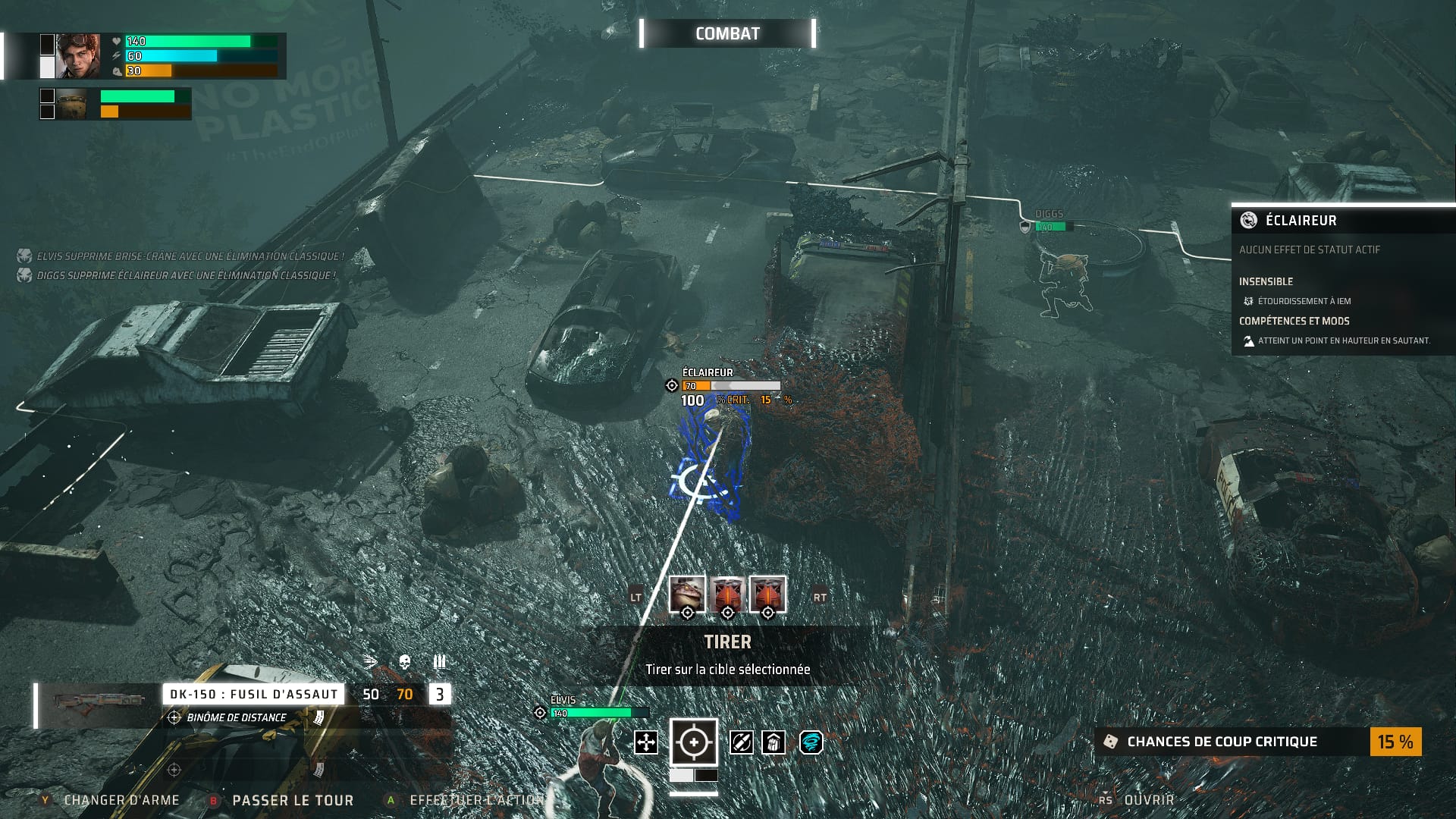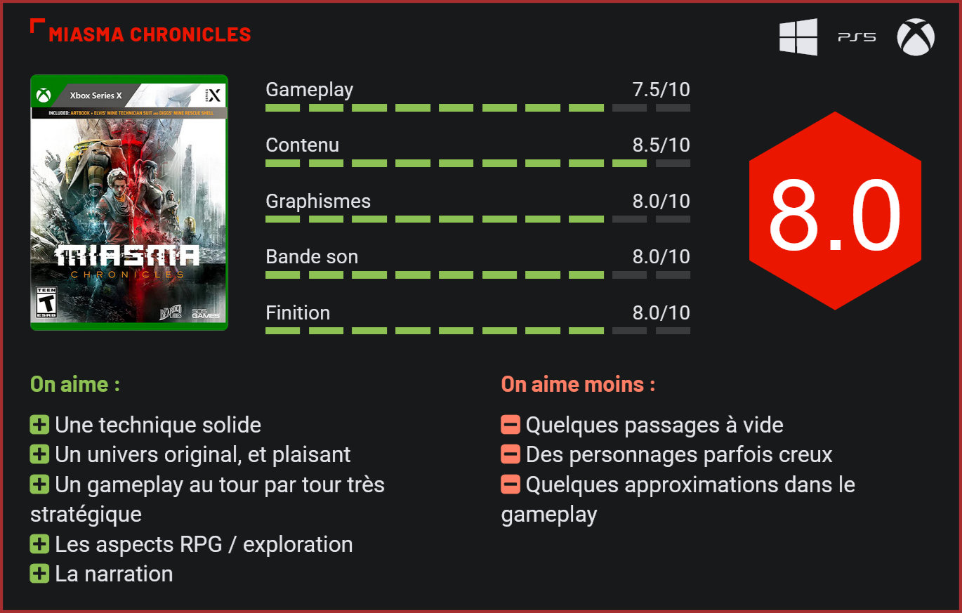Nouveau jeu des créateurs de Mutant Year Zero, Miasma Chronicles est un tactical au tour par tour qui se distingue des autres jeux du genre par son approche RPG. Un titre qui n’a presque pas fait parler de lui jusqu’à sa sortie et s’impose pourtant comme l’une des très bonnes surprises du mois… Disponible exclusivement sur PC et consoles new-gen, Miasma Chronicles est un tactical dans la droite lignée de Mutant Year Zero, qui s’inspirait lui même assez ouvertement d’un X-Com. La grosse différence ici vient de l’approche : le jeu ne se cantonne pas à des combats au tour par tour puisqu’il propose aussi de l’exploration (en temps réel), des dialogues, et de la gestion d’équipe. Un mélange de tactical et de RPG qui fonctionne étonnamment bien. Il est possible à tout moment de savoir où il faut se rendre pour la mission en cours. De façon générale, la recette reste très proche de Mutant Year Zero. Miasma Chronicles se présente comme un tactical à la fois accessible en mode facile et technique en difficile, qui se caractérise surtout par son univers SF travaillé. Ici, on plonge dans un monde futuriste dans lequel l’humanité a été décimée par le miasme, une force sauvage et inconnue, qui ravage tout ce qu’elle touche. Cette force à priori extraterrestre contamine l’environnement, transformant en d’horribles créatures les animaux de la faune locale, et dégage des gaz toxiques qui tuent les humains. Les cinématiques et la narration sont travaillées. Dans la peau d’Elvis, un jeune homme capable de manipuler le miasme, et accompagné de son “grand frère”, un robot qui a veillé sur lui depuis la mort de sa mère, le joueur devra tenter de contrer les plans du miasme. Avec son univers SF unique, Miasma Chronicles parvient à joliment se distinguer des autres titres du genre. Un énorme travail a été réalisé du côté des développeurs pour donner à cet univers une identité unique et cela se ressent. Miasma Chronicles brille par l’excellence de sa narration et la richesse de son univers. Les cinématiques sont stylées, les personnages plutôt réussis, les dialogues superbement écrits. Seul petit reproche qu’on pourrait lui adresser à ce niveau : certains personnages sont moins intéressants que d’autres. Il faudra utiliser les aptitudes de chacun sur le champ de bataille. Côté gameplay, le jeu brille également par sa diversité. Les séquences d’exploration permettent de faire le plein de loot et d’explorer davantage l’univers, mais aussi de prendre un avantage tactique sur ses ennemis en choisissant la façon d’engager le combat et en surprenant l’adversaire. Vous pourrez d’ailleurs scinder vos groupes pour les prendre de plusieurs angles différents. Si le jeu est tactique, il reste très accessible grâce à un excellent tutorial. Il brille également là aussi par son originalité, puisqu’on ne se contente pas ici de se planquer derrière des abris et d’utiliser des armes et objets. Pour remporter la partie, le joueur devra aussi apprendre à maîtriser les pouvoirs du miasme. L’un d’eux vous permet par exemple de faire valdinguer un ennemi dans les airs. L’esthétique du jeu est plutôt soignée. Terriblement efficace dans sa formule, Miasma Chronicles est clairement une excellente surprise. Visuellement, le jeu impressionne aussi avec ses graphismes next-gen. Sans être une claque (il s’agit d’un petit projet, développé par une équipe modeste), le titre exploite joliment le potentiel des consoles de nouvelle génération. Pour autant, tout n’est bien sûr pas parfait. On reprochera au jeu un rythme qui n’est pas toujours soutenu, quelques passages à vide et quelques approximations aussi dans le gameplay, qui reste moins exigeant que sur un X-Com. La grande force de Miasma Chronicles finalement, c’est de parvenir à réunir les passionnés du genre et des débutants. Ce qui n’est pas un maigre exploit. Reste que tout le monde ne sera pas forcément sensible à son univers très particulier… Conclusion S’il n’a que très peu fait parler de lui jusqu’à sa sortie, le nouveau jeu des créateurs de Mutant Year Zero est une franche réussite. Mêlant brillamment tactical et RPG, Miasma Chronicles est un titre brillant dans sa conception, à la fois accessible aux débutants et aux passionnés. Il se démarque des X-Com likes par le fait que si les séquences de combat se jouent au tour par tour, l’exploration, les dialogues, eux se jouent en temps réel. A la fois tactique, riche dans son univers, très joli aussi grâce à son statut de jeu new-gen only, Miasma Chronicles est une vraie bonne surprise, qui a en outre le mérite de nous ouvrir les portes d’un univers SF atypique.