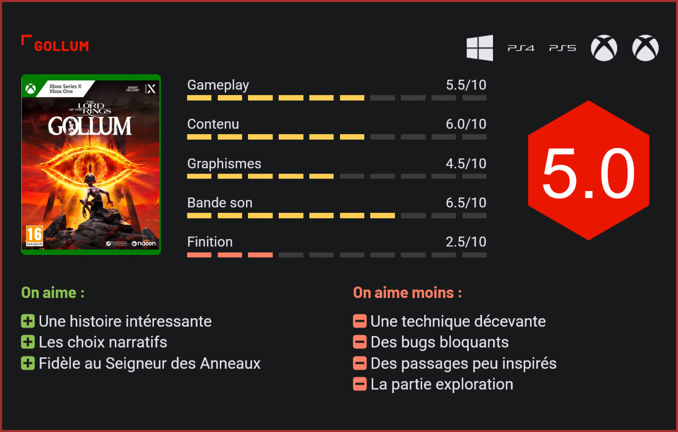 Développé par Daedelic, un petit studio indépendant qui signe avec ce jeu son titre le plus ambitieux à ce jour, Gollum est une adaptation fidèle à l’œuvre de J.R.R. Tolkien, qui peine toutefois à convaincre, la faute à une finition désastreuse… Attendu au tournant par les fans du Seigneur des Anneaux, Gollum : le jeu ne s’annonçait pourtant pas vraiment comme un hit en puissance. Depuis sa première présentation, le titre avait été régulièrement raillé pour sa technique pauvre. Et on ne va pas vous le cacher, il ne s’agit pas vraiment d’une claque, bien au contraire même. Pour autant, on lui reconnaîtra toutefois quelques qualités esthétiques : sa direction artistique plutôt inspirée, quelques très jolis panoramas et quelques excellents choix de mise en scène. Non, on n’est pas là face à un triple A mais pour un jeu à petit budget, Gollum s’en sort correctement. Les cinématiques du jeu sont travaillées. Côté gameplay, même son de cloche : on le savait, Gollum n’allait pas être le jeu d’infiltration de l’année. Car de facto, le jeu nous avait été présenté comme tel. En réalité, on est face à un jeu d’aventure très linéaire, qui mixe différents genres : de courtes séquences d’infiltration durant lesquelles il faudra généralement ramper dans les hautes herbes, des séquences de plates-formes assez basiques, un peu d’action et un paquet de lignes de dialogues à écouter et de cinématiques à visionner. Vous l’aurez compris, sur le plan ludique, le jeu n’est pas une réussite, mais pas un total fiasco non plus. On est là face à un jeu à licence très classique, dans la lignée de ce qu’on avait l’habitude de voir il y a dix ans. Gollum parvient toutefois à tirer son épingle du jeu sur le plan narratif, avec un scénario bien ficelé et agréable à suivre pour les fans, de jolies cinématiques, des dialogues bien écrits et un système de choix qui permettront d’influencer la trajectoire du scénario. Tout au cours de l’aventure, vous serez amené à faire des choix, en incarnant ainsi soit Sméagol, soit Gollum. Ces choix n’auront pas forcément de grosses conséquences, mais ils n’en restent pas moins intéressants, surtout qu’ils vous mèneront à de courtes séquences où il faudra convaincre l’autre moitié de personnalité de votre héros de suivre vos directives. Un concept sympa. Les choix narratifs apportent un vrai plus. Sympa… mais en aucun cas explosif. Et c’est bien là tout ce qu’on reprochera à ce récit, certes intéressant à suivre (le choix d’axer toute une trame narrative sur le personnage de Gollum était risqué!), avec quelques moments réussis, mais souvent lancinant et assez mou à jouer. Comme on l’a dit plus tôt, Gollum est un jeu qui s’adresse avant tout aux fans du Seigneur des Anneaux et en ce sens, le titre s’en sort assez bien puisqu’il reste fidèle à l’univers créé par J.R.R Tolkien. Les fans y trouveront certainement de quoi passer un très bon moment, d’autant plus que la présentation est soignée et la BO plutôt efficace. Les séquences d’infiltration restent très basiques. Si Gollum aurait dû donc être un jeu “sympa” mais sans éclats, le titre est malheureusement victime d’une finition désastreuse. Les bugs dans le jeu sont nombreux. Pire, on se retrouve assez souvent face à un bug bloquant. Par exemple, dans le chapitre deux du jeu, notre personnage est tombé et est mort. Le chargement du checkpoint a affecté la partie, avec une porte qui est restée fermée… Il nous a fallu recommencer complètement le niveau (45 minutes de jeu tout de même) pour finir le chapitre… Et d’après les joueurs, ce genre de bug n’est pas un cas isolé… Mieux vaut donc patienter un gros patch avant de se lancer dans cette aventure. Conclusion Descendu par les critiques du monde entier, Gollum n’est pourtant pas le pire jeu d’aventure qui existe. Le jeu de Daedelic est même plutôt plaisant à parcourir pour les fans de la saga. Fidèle à l’univers de Tolkien, le titre propose un scénario riche et joliment présenté. l’aventure en elle même n’est guère passionnante, la faute à un gameplay un peu trop simpliste, mais certaines séquences de jeu sont assez réussies pour qu’on y prenne plaisir. Gollum reste un jeu d’aventure efficace. Il faudra toutefois composer avec de gros défauts : des bugs bloquants, qui vous obligeront à recommencer plusieurs fois un niveau, des visuels datés, et quelques choix douteux pour certaines séquences de gameplay qui ne fonctionnent absolument pas.