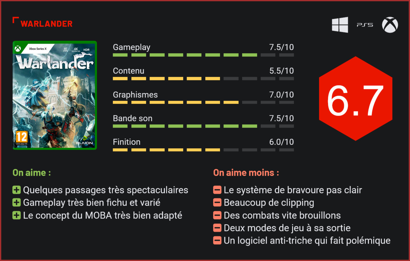 Un MOBA à la troisième personne prenant place dans un univers moyenâgeux, ça vous tente ? C’est le pari un peu fou tenté par Toylogic avec Warlander. Début d’année sortait sur PC le très sympathique Warlander, un nouveau jeu du studio japonais Toylogic (qui a notamment travaillé sur Nier Replicant) mêlant ici univers moyenâgeux, match à mort par équipe et gameplay fortement inspiré des MOBA. Un mix plutôt original qui a visiblement fait mouche sur PC, donnant l’envie aux développeurs de faire sortir leur free-to-play sur consoles next-gen. Warlander dispose d’un gameplay plutôt original pour le genre. Le principe est on ne peut plus simple. Vous incarnez un chevalier et devez capturer des tours ainsi que détruire le noyau ennemi qui se trouve dans leur forteresse. Forteresse que vous devez intégrer grâce à des échelles, un bélier, des sorts ou même au forceps, le tout en passant par des tours à capturer. Plus vous aurez infligé de dégâts au noyau ennemi ou aurez conquis de tours, plus vous aurez de chance de remporter la partie. A la manière d’un MOBA, la carte est répartie en deux forteresses, avec des tours et trois chemins à emprunter. Pour cela, vous aurez à choisir entre trois classes de héros parmi la prêtresse (combinaison de corps à corps et de magie), le guerrier (corps-à-corps) et le mage (magie) et pourrez ensuite le personnaliser. Plus vous personnalisez votre héros avec des puissants items, plus il sera alors nécessaire d’obtenir de la bravoure pour l’utiliser sur le champ de bataille, bravoure qui s’obtient tout simplement en tuant des ennemis. Le problème est que l’obtention de cette bravoure est quelque peu brouillonne, comme l’ensemble du jeu. On n’a aucune jauge qui nous indique où elle se situe, impossible donc de savoir à partir de quand on peut l’utiliser. Et c’est un peu le ressenti que l’on a dans tout le jeu, menus compris. Les combats sont extrêmement brouillons. Même si c’est un peu plus potable en 1v1, ça reste très difficile d’y voir clair quand les affrontements ont lieu. Même constat pour les menus, notamment de configuration du héros, qui regorgent d’options sans spécialement donner envie que l’on s’y aventure. Lorsque l’on est en combat, ceux-ci sont assez brouillons et il faut principalement être en 1v1 pour y voir quelque chose. Du côté du gameplay, nous évoquions donc les trois classes de personnage et leurs spécificités à chacune. Honnêtement, il n’y a pas de grandes différences entre le guerrier et la prêtresse. Tous deux se battent au corps-à-corps et seuls les attaques spéciales différent. Le mage, lui, est plus difficile à manier, notamment dans les lieux exigus comme le donjon, où se situe le noyau. Pour venir à bout de vos ennemis, plusieurs possibilités s’offrent à vous. La première, et probablement la plus simple, consiste à affronter les ennemis en face-à-face. Ensuite, partout sur le champ de bataille sont disséminés des balistes, catapultes et autres arbalètes à construire. Si elles requièrent un long temps d’attente pour être construites, elles sont d’une efficacité redoutable une fois opérationnelles. Mais ce qui impressionne le plus dans Chivalry 2, c’est sa mise en scène et l’aspect spectaculaire des affrontements, avec notamment des attaques ultimes juste impressionnantes, comme la pluie de météorites. Les forteresses sont magistrales, et voir d’immenses météorites s’abattre sur leurs fondations est vraiment jouissif. D’autant que le titre n’est vraiment pas vilain visuellement, bien au contraire. Visuellement, Warlander s’en sort très bien, et mise principalement tout son level design et son gameplay sur le spectaculaire. Niveau contenu, en revanche, Warlander peine à convaincre. Seul trois classes sont proposées, les maps sont guère plus nombreuses et vous n’avez que deux modes de jeu à votre disposition : combat à deux ou à cinq équipes. Chaque équipe est composée de 20 joueurs, répartis en cinq sections aux objectifs variés. Une section doit défendre le donjon, tandis que d’autres conquièrent les tours ou attaquent le noyau adverse. En revanche, les parties à cinq équipes (et donc 100 joueurs) sont bien plus brouillonnes et il faut attendre un matchmaking organisé pour y participer, qui peut parfois prendre jusqu’à vingt minutes d’attente. Enfin, dire que Warlander a été fini à la va-vite et est mal optimisé semble un euphémisme. Il y a énormément de clipping où qu’on soit, et ce, malgré le fait que le titre soit proposé sur next-gen. Un autre souci vient poser problème : l’existence d’un logiciel anti-triche sur PC. Il n’existe pas sur consoles, mais le simple fait que les développeurs nous imposent l’installation de ce logiciel polémique qui serait capable d’avoir accès à certains fichiers privés présents sur l’ordinateur. Conclusion Petite (agréable) surprise cette année avec Warlander. Très largement inspiré des MOBA dans la construction de ses niveaux, le titre nous plonge dans une bataille sans merci entre 2 (ou 5) équipes devant détruire le noyau de la forteresse ennemie. Tant au niveau du gameplay que dans la mise en scène, on sent que Warlander est conçu pour en mettre plein les yeux des joueurs, quitte peut-être à passer à côté de l’essentiel. Certains combat sont parfois brouillons, tout comme les menus ou le système de classe, et le contenu est relativement maigre. Malgré tout, ces points mis de côté, Warlander est fun à parcourir, surtout entre amis.