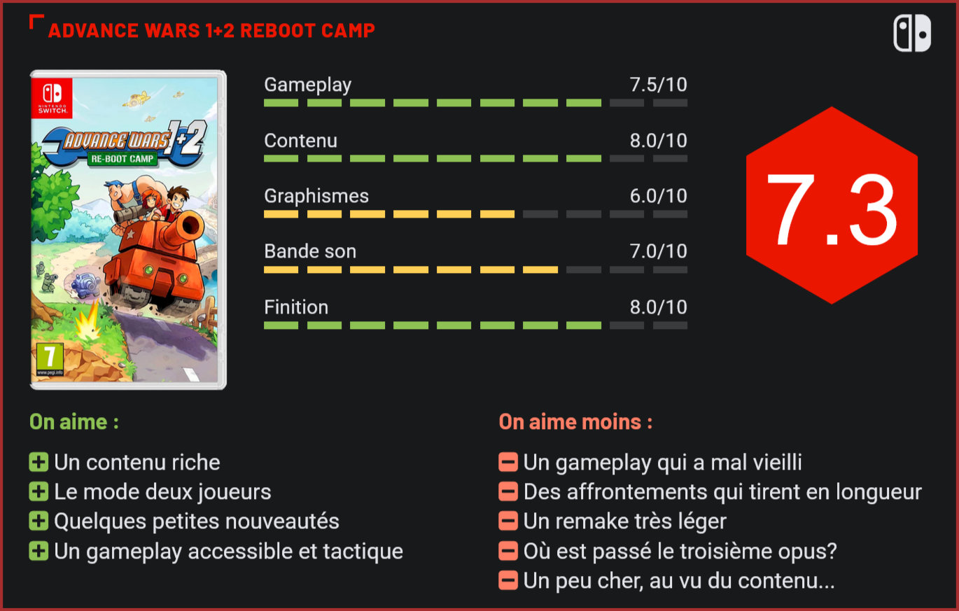 Sortie fin avril sur Switch, la compilation Advance Wars 1+2 Re-Boot Camp remet au goût du jour une série de jeux de stratégie qui n’avait été que trop longtemps laissée de côté par Nintendo… Si l’on pense souvent à F-Zero et Wave Race en premier lorsqu’on évoque les franchises de Nintendo rangées au placard, Advance Wars était pourtant l’une des séries qui méritait le plus un remake ou un reboot. Et c’est précisément ce que Nintendo a décidé de faire avec Re-Boot Camp, une compilation rassemblant les deux premiers épisodes de la franchise, légèrement remis au goût du jour. Pour ceux qui ne connaîtraient pas cette série, il s’agit d’une série de jeux de stratégie au tour par tour qui avait connu un franc succès sur GameBoy Advance. Pour son retour sur Switch, Nintendo a choisi de ne pas prendre de risques : la compilation reprend quasiment à l’identique le contenu des deux jeux. Le seul réel changement conserve la technique. L’esthétique a été retravaillée. Dans la pratique, on se retrouve donc sur une carte en 2D quadrillée, sur lequel il faudra déplacer ses différentes unités pour affronter l’armée adverse et prendre ses positions. Comme dans tout RTS qui se respecte, on a le choix de déplacer différents types d’unités : des fantassins, chars, bateaux, avions,… Chacun a ses particularités, ses avantages et ses faiblesses. Chacune de ces unités dispose également d’un nombre de points de déplacement limité et affiche une portée de tir différente. Le joueur dispose également d’une unité spéciale qui dispose d’un avantage passif et d’un avantage actif. Par exemple, il pourra soigner ses unités, ou disposera d’avantages uniques avec ses fantassins. A tout cela vient s’ajouter un facteur additionnel : le champ de bataille. Selon l’endroit où se positionneront vos troupes, vous disposerez d’avantages différents. Les véhicules auront beaucoup de mal à se mouvoir en forêt. Les fantassins seront plus efficaces en ville. Contrôler certains territoires, comme les villes, vous apportera également des crédits additionnels pour renforcer votre armée… Vous l’aurez compris, s’il reste un jeu de stratégie très accessible, Advance Wars sait aussi se montrer tactique. Les combats ont tendance à s’éterniser un peu… La bonne nouvelle, c’est que tous ces mécanismes vous seront enseignés très progressivement au cours de l’aventure, avec de mini-tutoriels intégrés à l’aventure, et très bien fichus. Et autant dire que cela vous sera utile car mine de rien, ce sont plus de 25 heures de missions qui vous attendent à travers les deux campagnes principales du jeu, auxquelles il faudra ajouter une bonne dizaine d’heures de jeu en plus pour finir les missions additionnelles. Le contenu de cette compilation est très généreux. On retrouve d’ailleurs le même mode éditeur de niveaux qui permet de prolonger davantage encore l’expérience, ainsi qu’un mode deux joueurs en ligne. Quelques petites nouveautés font aussi leur apparition : des doublages pour les personnages, un mode avance rapide (x2) et une option “rejouer le dernier tour”. Des petites nouveautés bienvenues mais qui n’apportent pas forcément de gros changements au titre. Et il faut bien l’avouer, en 20 ans, le jeu a vieilli… On regrette la lenteur du début du jeu, la longueur de certains affrontements, la lenteur de la capture de positions, un gameplay qui a tout de même un peu vieilli et une technique certes convaincante, mais qui ne fait finalement que rafraîchir l’esthétique du jeu sans totalement la réinventer. Et il faut bien admettre, si le jeu est plus joli qu’à l’époque, le travail de remasterisation reste minimaliste et l’esthétique semble surtout avoir perdu de sa personnalité. La mise en scène des combats est soignée. Alors oui, les fans seront sans doute aux anges. Oui, cette compilation est un joli cadeau pour eux, mais au vu du prix auquel le jeu est vendu, on aurait tout de même pu en attendre un peu plus. On notera au passage que le troisième opus ne fait pas partie de l’aventure, ce qui est bien dommage. Surtout que les développeurs auraient eu tout le loisir d’améliorer un peu la formule avec les multiples reports du jeu, à cause de la guerre en Ukraine… Conclusion Nintendo nous livre une compilation des deux premiers Advance Wars très convaincante. Riche en contenu, avec ses deux longues campagnes en solo, ses scénarii multiples, son éditeur de niveaux et son mode deux joueurs, le titre se présente comme un jeu de stratégie étonnamment riche et fun à jouer. Certes, la formule a vieilli : les affrontements ont tendance à tirer en longueur et on s’ennuie parfois ferme entre deux missions, mais quel plaisir malgré tout de retrouver une série aussi culte sur Switch. D’autant plus que quelques petites nouveautés sont au programme et que les visuels du jeu ont été retravaillés. Faut-il pour autant craquer? Certainement, si vous êtes fan de la franchise. Reste qu’on en attendait sans doute un peu plus, au prix auquel le titre est vendu…