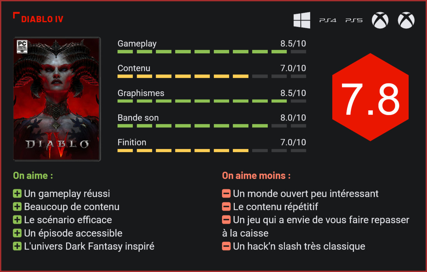 Plus de dix ans après Diablo III, Blizzard revient avec un quatrième épisode de la franchise culte. Diablo IV est-il capable d’améliorer l’image de l’entreprise qui traverse une mauvaise passe depuis quelques années ? Entre les différents scandales autour de leur culture d’entreprise et la sortie de plusieurs titres dont les qualités font débat dans leurs communautés respectives (on se souvient de Warcraft III : Reforged et Overwatch 2), Activision et Blizzard Entertainment ont une image à redorer. La licence concernée aujourd’hui a, elle aussi, subi les choix douteux de l’entreprise ces dernières années avec l’arrivée du controversé Diablo Immortal sur mobile. Les équipes entendent apporter une expérience plus satisfaisante avec ce Diablo IV, un nouveau jeu qui arrive plus de dix ans après la sortie de l’épisode précédent. Dans Diablo IV, nous incarnons un héros ou une héroïne qui va se lancer dans une quête aux quatre coins de Sanctuaire, la terre des humains dans l’univers de la licence. Alors que notre personnage se réfugie dans une petite bourgade durant une tempête de neige, il se fait piéger par les habitants qui lui font ingurgiter des pétales de sang de l’antagoniste du jeu : Lilith. Doté d’une étrange connexion avec la démone, notre protagoniste va suivre ses traces à travers le monde pour mettre un terme à ses sombres agissements. Si les précédents épisodes de la licence nous demandaient de choisir parmi plusieurs personnages représentant les différentes classes du jeu, Diablo IV pousse les choses un peu plus loin en nous donnant la possibilité de customiser notre protagoniste. En plus du choix du genre, de nombreuses options de personnalisations permettent de rendre unique ce personnage qui apparaît désormais dans plusieurs cinématiques au fil du jeu. Les scènes qui détachent la caméra du point de vue habituel sont très convaincantes, mais peut-être trop rares et réservées aux quêtes scénarisées. Une intrigue divisée en plusieurs actes et qui, sans être particulièrement impressionnante, remplis habilement la promesse de nous faire voyager, et ce, sans avoir besoin de beaucoup de connaissances concernant l’univers de Diablo. Ce nouveau Diablo utilise un rendu visuel bien plus sombre que son prédécesseur. Diablo IV propose une grande différence par rapport aux précédents jeux. Ce nouvel épisode est un RPG en monde ouvert qui nous laisse rapidement la liberté de progresser dans le sens désiré, le niveau des zones s’adaptant à celui de notre personnage. Malgré ce changement de structure, Diablo IV reste un hack n’slash dans la même veine que ses prédécesseurs, le principe reste le même. Nous devons parcourir le monde pour avancer dans la quête principale, effectuer des quêtes secondaires, mais surtout tuer tout un tas de créatures de l’enfer. Les combats nous permettent de gagner des niveaux et des points à distribuer parmi différentes compétences. Le loot est ici une part primordiale de l’expérience puisque l’on gagne de très nombreuses pièces d’équipement en espérant que la chance nous accorde quelque chose de rare. Cinq classes sont disponibles pour parcourir cette aventure. Nul doute que de futures mises à jour ou extensions en amèneront d’autres, mais le panel disponible est satisfaisant et offre des styles de jeu différents puisque chacune des catégories possède plusieurs particularités. Le choix de la classe se fait dès la création de notre personnage et ne peut pas être altéré en cours de partie. Sont disponibles : Barbare, Druide, Nécromancien, Voleur et Sorcière. En plus d’un bon nombre de capacités propres à chaque classe, le gameplay varie un peu dépendant de notre choix et plusieurs spécialisations se débloquent après un certain niveau, ce qui amène de véritables différences dans la prise en main. Le barbare est par exemple capable de manier plusieurs armes pour lancer différentes attaques. Voleur est une classe versatile permettant de se spécialiser au corps-à-corps ou à distance, en plus d’avoir la possibilité d’utiliser des pièges. Un nécromancien peut être accompagné de plusieurs minions prenant la forme de morts-vivants… Les différentes classes offrent des options bien distinctes. Le gameplay se montre convaincant, proposant plusieurs possibilités d’évolutions et de style de jeu pour une même classe. L’expérience générale est très satisfaisante et parfois exigeante. Pareillement, la prise en main est très agréable et fait preuve de modernité, que ce soit en utilisant un clavier et une souris, ou même une manette. Diablo IV se montre également plutôt accessible pour les nouveaux joueurs, mais les vétérans pourront s’amuser grâce à différents modes de difficultés. Le nouveau monde ouvert réserve son lot de contenu inédit. Le titre nous disperse des entrées de donjons un peu partout, ainsi que des évènements temporaires qui promettent un joli coffre une fois l’objectif atteint. Il est dommage de voir que ce monde ouvert parait souvent un peu vide et son contenu très répétitif, un triste constat pour le nouveau jeu d’un genre qui l’est par définition. Explorer Sanctuaire n’est pas aussi palpitant que l’on imaginait, et nous sommes vite amenés à nous demander si l’idée d’un terrain de jeu beaucoup plus large était bien pertinente. Malgré tout, Diablo IV propose de nombreuses fonctionnalités multijoueur, notamment du contenu joueur contre joueur et de la coopération en ligne et hors-ligne. L’obligation d’être constamment connecté à internet est regrettable, mais le titre fournit un contenu très généreux. Ce nouveau Diablo est aussi un titre dont le contenu compte bien évoluer avec le temps. Les combats de boss sont parfois très exigeants. La période de test ne nous a pas permis de jeter un œil aux différents systèmes de monétisation du jeu,