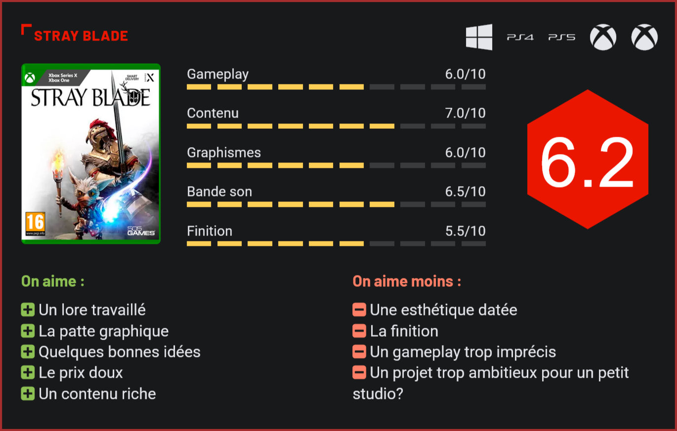 Développé par un tout petit studio allemand, qui signe avec ce projet sa première création, Stray Blade était pourtant l’un des projets de souls-likes parmi les plus ambitieux du marché. Edité par 505 Games, il n’aura toutefois que très peu fait parler de lui… Les Souls-likes ont la cote. Depuis quelques mois, les clones d’Elden Ring se multiplient. Certains sont plus ambitieux que d’autres. Et parmi la multitude de titres sortis ces 12 derniers mois, Stray Blade était probablement l’un des projets les plus ambitieux que nous ayons croisé, malgré son micro-budget. Car de facto, il ne s’agit pas d’un titre développé par un gros studio mais par une toute petite équipe. Visuellement, le jeu a son propre style. L’agenda du studio était chargé puisqu’il entendait nous proposer un mélange de metroidvania et de souls-like dans un semi-open world, avec un vaste univers à explorer, une vraie trame narrative, un arsenal varié, un gigantesque bestiaire… Si le studio est parvenu à insuffler de la vie dans son jeu, à développer son univers et à introduire quelques très bonnes idées au niveau du gameplay, on ne va pas vous mentir, le titre tient assez mal la comparaison avec les plus grosses productions. Esthétiquement tout d’abord, s’il a sa propre patte graphique, qui lui va plutôt bien, on n’est pas face à une claque mais un double-A “correct” visuellement. Quelques effets visuels sont sympas, les paysages sont réussis, mais on a plus l’impression d’être sur un jeu d’ancienne génération que sur un titre “new-gen”. Par certains de ses aspects, Stray Blade rappelle parfois Amalur. Côté narration ensuite, si le studio arrive à joliment développer son univers et tout le lore qu’il y a autour, le scénario du jeu n’est guère très palpitant. On est face à du vu et du revu dans un univers fantaisiste très classique et surtout niveau mise en scène, c’est très minimaliste avec des cut-scenes animées de façon assez pauvre. Le lore est intéressant, mais il faudra s’y plonger. Au niveau de la structure aussi, c’est la déception. Si vous vous attendiez à un open-world vous serez déçu. Car le jeu est en réalité très linéaire, avec certes des raccourcis à la metroidvania et des morts punitives, qui vous obligeront à recommencer depuis le début à chaque fois. Autant dire que si vous n’êtes pas du genre persévérant, vous allez lâcher très vite le pad. Et vu la difficulté du titre, il est fort probable que vous serez très vite agacé, car même en “normal”, le titre peut s’avérer hardcore. Plus qu’un Sekiro? Sans doute pas, car il n’exige pas une si grande excellence, mais c’est plutôt le manque de précision des commandes qui est à pointer du doigt. L’univers du jeu a son charme. Car vous l’aurez très vite remarqué, les commandes sont loin d’être irréprochables. Lors des combats, certains coups pourront être parés, d’autres pas. Auquel cas il faudra éviter le coup par un déplacement latéral. C’est la couleur de l’aura qui entoure l’arme de votre adversaire qui définira la marge à suivre… Si elle est rouge, il faudra éviter le coup, si elle est bleue, vous devrez le parer. Facile, à priori. Dans la pratique toutefois, on observe souvent que même avec un excellent timing on encaisse un coup sans trop savoir pourquoi ni comment… La hitbox et le comportement de l’adversaire sont très imprévisibles. Et dans ce genre de jeu, difficile de faire plus agaçant. Autre problématique : il y a beaucoup d’infos à digérer pour les nouveaux venus. Stray Blade, malgré son côté “enfantin”, s’adresse à un public de passionnés. Les combats sont fatigants, compte tenu du nombre de PV de vos adversaires, l’arsenal est extrêmement varié, ce qui fait qu’il faudra passer du temps à le maîtriser, les boss sont coriaces et il faudra se plonger pas mal de temps dans les menus pour progresser et faire progresser son arsenal… Les combats sont exigeants et très frustrants. On retrouve en réalité dans ce jeu des éléments qui semblent s’être inspirés de toute une série d’autres productions… Côté style graphique, Stray Blade s’inspire assez ouvertement d’un Amalur, côté gameplay, on est plus proche d’un action-RPG à l’Absolver. Et puis, il y a le style qui s’inspire des souls-likes. Un cocktail de genres qui marche… à moitié. Clairement, il s’agit d’un jeu qui nécessitera un gros investissement du joueur. Car ici, rien n’est pensé pour le débutant. Les menus sont surchargés d’infos et peu ergonomiques, les combats tactiques, le jeu punitif et pour ne rien faciliter, la jouabilité manque de précision. Cela ne veut toutefois pas dire pour autant qu’il s’agit d’un mauvais jeu. En réalité, l’idée derrière est excellente. Ce qu’on reproche à ce titre, c’est son manque de finition avec un paquet de bugs et de plantages rencontrés durant notre périple, et l’imprécision des commandes. On le sent, les développeurs ont été trop gourmands. Ils ne sont pas parvenus à concrétiser toutes leurs idées et se sont un peu emmêlés les pinceaux. Asterigos a suivi un chemin similaire, en visant un public plus large. Les fans du genre pourraient donc y trouver un certain plaisir, pour peu qu’ils ne soient pas trop exigeants, car en définitive c’est bien au niveau de la finition, de la précision des commandes et d’un certain manque de profondeur du gameplay qu’on a à redire, pas au niveau du lore, du style ou de l’univers. Car Stray Blade offre une expérience riche, avec un contenu généreux et un style graphique unique. Le jeu n’aura en ce sens aucun mal à se forger une petite communauté de fans. Conclusion Sorti de nulle part, Stray Blade est un curieux mélange de Souls-like et de metroidvania qui ne prend qu’à moitié. Si son univers riche, son contenu généreux et sa patte grap