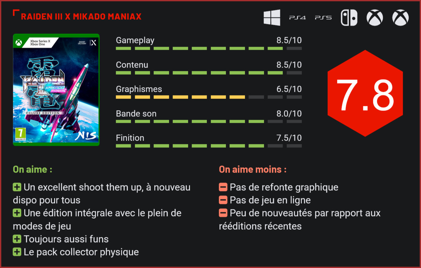 Sorti en 2005 sur bornes d’arcade puis décliné sur toute une variété de supports, Raiden III reste l’un des shoot them up les plus emblématiques de l’Histoire. NIS America lui offre aujourd’hui un revival avec la sortie d’une réédition Mikado Maniax. Parmi les grands classiques du shoot them up moderne, Raiden III est très probablement l’un des épisodes les plus appréciés de la franchise. Après nous avoir livré une réédition du quatrième volet l’an dernier, NIS America poursuit sur sa lancée et nous livre cette fois-ci la réédition du troisième épisode. Visuellement, le titre a un peu vieilli. Au programme : 7 niveaux du jeu original, jouables à travers le fameux mode solo classique, un Score Attack, un mode Boss Rush, et puis des nouveautés comme les classements en ligne des meilleurs joueurs, des wallpapers pour personnaliser l’interface, les replays avec les enregistrements de vos meilleures parties, le choix des morceaux, le support des écrans verticaux, et, nouveauté principale enfin : le mode Remix, qui revoit complètement la position des ennemis et propose donc un nouveau challenge pour les fans de la franchise. Boss et miniboss viennent ponctuer la progression. Alors bien sûr, tout cela ne parlera pas aux joueurs qui n’ont jamais touché à l’original. Raiden III, en soi, reste l’un des meilleurs shoot them up du début des années 2000. Nerveux, technique, le jeu se démarque des autres shmups par son rythme effréné et surtout son arsenal unique. Concrètement, certains ennemis lâcheront des power-ups dont la couleur variera toutes les x secondes. Le power-up dont vous êtes équipé sera renforcé si jamais vous en récupéré un de couleur identique, ou remplacé par un autre power-up si vous récupérez un power-up d’une autre couleur. Tout cela ajoute un peu de stratégie aux combats puisque les armes à votre disposition ont des effets différents. Un laser infligera de lourds dégâts à l’ennemi visé mais ne permettra pas de tirer sur plusieurs opposants en même temps, à l’inverse de la mitrailleuse ou du laser directionnel… Le mode Boss Rush est à débloquer. Alors forcément, ça a un peu vieilli. Visuellement, le titre n’a pas eu droit à une refonte et c’est bien dommage. Mais il faut bien l’avouer, c’est le genre de titre qui reste difficile à trouver en magasin et dont le prix a tendance à grimper avec les années. Sa disponibilité sur une nouvelle série de supports est donc une bonne nouvelle, d’autant plus qu’il est proposé en version numérique et physique. En soi, les fans seront donc comblés par cette réédition. Surtout que désormais, ce sont les trois derniers volets de la franchise qui sont disponibles sur presque tous les supports. Conclusion NIS America livre une réédition de l’excellent Raiden III, potentiellement le meilleur volet de la série de shoot them up de MOSS, généreuse en nouveautés. Si le jeu n’a pas bénéficié d’une refonte intégrale, il propose de nombreux nouveaux contenus : classements en ligne, wallpapers personnalisables, replays, mode “arrangé”, choix des morceaux, support des écrans verticaux. Il y a de quoi faire. Les fans se jetteront sans doute sur l’édition physique du titre. Les autres se tourneront vers l’édition numérique, pour (re)découvrir l’un des meilleurs shmups du début des années 2000.