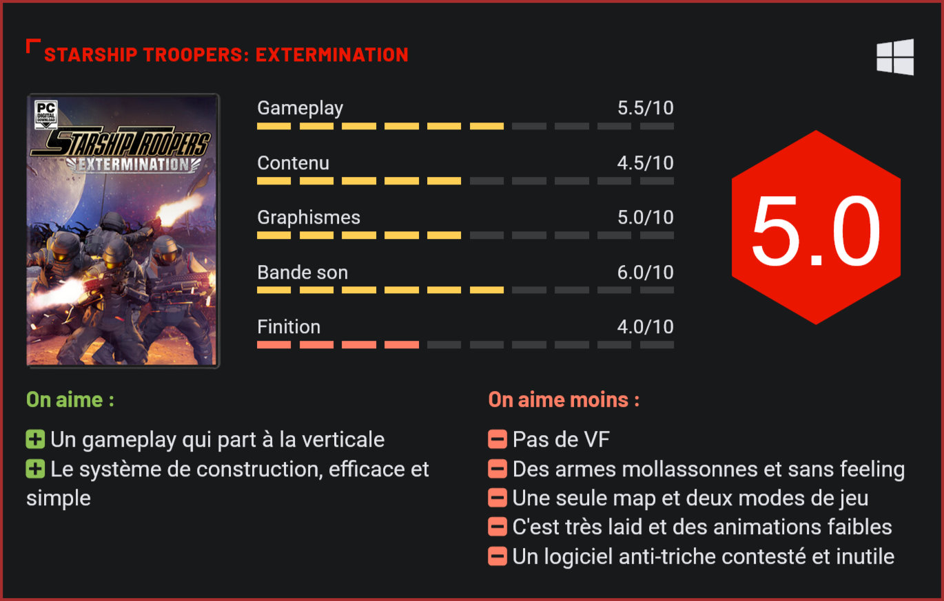Avec son statut d’accès anticipé, Starship Troopers: Extermination veut que les joueurs donnent leur ressenti sur l’état actuel du jeu. Espérons qu’il s’améliorera, puisqu’actuellement, c’est une catastrophe. Starship Troopers, c’est tout un univers initié en 1959 avec le roman Étoiles, garde à vous de Robert A. Heinlein. S’en suivront un film, en 1997 réalisé par Paul Verhoeven, ainsi que quatre jeux, de 2000 à 2023. Le succès commercial sera presque toujours au rendez-vous, mais la critique se montrera acerbe, autant avec les productions cinématographiques que vidéoludiques. D’ailleurs, attardons-nous sur le dernier jeu de la franchise, Extermination, sorti ce printemps sur PC. Après plusieurs titres sur les guerres mondiales et modernes, Offworld Industrie s’attaque au FPS de type futuriste, à la Halo, prenant place sur une planète désertique où vivent d’abominables créatures à détruire. Visuellement, tous les paysages sont aussi ternes et peu colorés que celui-ci. Mais Starship Troopers, c’est plutôt une enveloppe plaisante, mais un intérieur qui est … incroyablement vide. Et ce, que ce soit sur le plan du gameplay, du contenu que du level-design. Au niveau du gameplay d’une part, avec des sensations de tir qui ne sont absolument nul part. Les armes n’apportent aucun feeling lorsque l’on tire, sont totalement molles et vraiment nazes. On ne prend absolument aucun plaisir à tirer sur les ennemis et les créatures. Il est en revanche à noter que le gameplay se joue autant à l’horizontale qu’à la verticale, ce qui apporte un peu de variété dans le gameplay. Heureusement, la construction est plutôt réussie dans son ensemble et diversifie le gameplay. Outre le fait de tirer sur tout ce qui bouge, le gameplay requiert de construire sa base et des fortifications. Une étape capitale, puisque c’est elle qui vous permettra de survivre le plus longtemps possible dans une partie sans que l’ennemi ne parvienne au cœur de votre base. Côté contenu, c’est extrêmement pauvre là aussi. Il n’y a que trois classes possibles pour former une escouade, une seule carte possible et deux modes de jeu, dont la capture de territoires. Vous admettrez que c’est bien trop peu pour une early access vendue 25€. Dans la loi, on appelle ça du vol avec préméditation. Il s’agit bien évidemment toujours d’un accès anticipé, mais le jeu est tout simplement injouable. Le clipping est omniprésent, tout comme les ralentissements. De notre côté, nous avons voulu attribuer de nouvelles touches, et un bug permet à deux touches d’être attribuées à la même action, ce qui est tout simplement incompréhensible. Enfin, absolument aucun élément du jeu n’a été traduit en français, même pas les menus. Vous n’avez le choix qu’entre trois classes, deux modes de jeu et une seule carte. Graphiquement, c’est vraiment vilain. Le level-design de la seule carte n’a aucune saveur, les effets visuels sont complètement datés, au même titre que les animations. Qu’il s’agisse des personnages ou des monstres, Extermination semble surtout sorti sur Playstation 2 en 2005 et non pas sur PC en 2023. D’ailleurs, les couleurs sont ternes et peu variées, ne donnant absolument pas envie de découvrir les paysages, si tant est qu’il y en ait suffisamment. Pour éviter que les joueurs ne trichent, Offworld Industries utilise le logiciel Easy Anti-Cheat. Il est censé empêcher l’utilisation d’un software pouvant altérer le jeu, mais ne fait absolument pas le taff. Si l’on passe outre le fait que Steam installe ce logiciel à notre insu, son fonctionnement totalement inutile remet sincèrement en doute l’intérêt d’une telle installation. Conclusion Avec Starship Troopers: Extermination, Offworld Industries nous prouve qu’on peut facilement proposer un jeu aux joueurs qui ne soit absolument pas fini, rempli de bugs et maigre en contenu, le tout à 25€. Pour un FPS qui se voulait prometteur, Extermination est ultra décevant. Les armes sont nulles et les graphismes et animations d’une autre époque. Le système de construction et la verticalité du gameplay viennent améliorer quelque peu la donne. Mais c’est tout. Ajoutons à cela un logiciel anti-triche inutile et un titre qui n’a absolument pas été traduit en français, et vous avez probablement l’un des pires FPS de ces cinq dernières années.