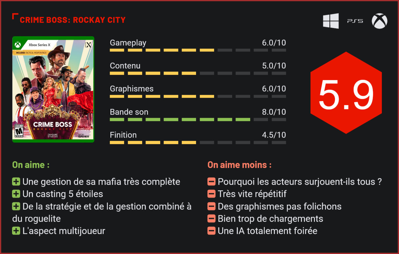 Avec son casting très fort, Crime Boss: Rockay City avait beaucoup fait parler de lui à son annonce, en décembre dernier. La présence d’un certain Chuck Norris au casting permet-elle au jeu de casser le game ? Oui, mais pas nécessairement dans le bon sens du terme… Clint Eastwood, Danny Glover, Kim Bassinger ou encore Dany Trejo. Un casting de rêve qui a plus souvent eu l’habitude d’apparaître au générique des plus gros blockbusters des années 1980 que dans un jeu vidéo. C’est pourtant le cas dans Crime Boss: Rockay City. Après avoir énormément fait parler de lui aux Game Awards en décembre en raison, notamment, de son casting, le titre est rapidement tombé aux oubliettes. La première sortie sur PC en mars n’a pas non plus fait beaucoup parler d’elle, jusqu’à ce que le titre débarque en grande pompe en ce mois de juin sur consoles. Pour une première expérience, Ingame Studios ne s’est certainement pas contenté d’un petit morceau. Un casting de rêve et ultra prometteur, un gameplay original combinant gestion, sessions FPS et braquage… Les développeurs allaient indéniablement être attendus au tournant, à tel point que leurs épaules n’étaient peut-être pas assez solides pour une telle production qui frôle les limites du AAA. En effet, on a clairement l’impression qu’un très gros budget a été débloqué par 505 Games pour ce Crime Boss. La promesse du studio est forte. Vous êtes Travis Baker, le nouveau paria du crime à Rockay City qui tente d’avoir la mainmise sur le trafic de drogues, des produits de luxe ou encore sur le contrôle des quartiers de la cité américaine. En se forgeant une équipes de bras-droits, une armée et un véritable patrimoine, votre personnage va tout faire pour éliminer un à un les obstacles qui se dresseront sur son passage, qu’ils fassent partie de la pègre ou des forces de police. Dans le jeu, Chuck Norris n’a pas besoin de chercher les criminels, ce sont les criminels qui le cherchent. Nous l’évoquions plus haut, Crime Boss c’est avant tout un casting cinq étoiles, qui a toutes les armes en main pour assurer un scénario de feu et des personnages charismatiques. Michael Madsen (Kill Bill, Reservoir Dogs) incarne le héros principal, épaulé par Kim Basinger (L.A. Confidential, 8 Mile), Danny Glover (L’Arme Fatale, Predator 2) et Michael Rooker (Les Gardiens de la Galaxie, The Walking Dead). Face à lui se dresseront plusieurs chefs de gang ennemis, dont Vanilla Ice et Danny Trejo (Une Nuit en Enfer, Machete), ainsi qu’un Texas Ranger nommé Chuck Norris, qu’on ne présente évidemment plus. De grands noms de la télévision et du 7e art, qui donnent toutefois l’impression de jouer dans une vieille série B des années 1990. Les acteurs surjouent sans qu’on ne sache réellement pourquoi. Cela aurait été bienvenu si le titre avait insisté sur l’exagération, en ce compris le scénario, mais on a vraiment l’impression que c’est plus un mauvais jeu d’acteur qu’autre chose, ce qui est évidemment surprenant. Seul Chuck Norris tient un rôle à sa grandeur, quoiqu’avec un doublage purement catastrophique. D’autant que le scénario n’est pas non plus très accrocheur. Un mafieux arrive en ville, veut capturer les différents quartiers et s’en approprier les différentes richesses. Punt aan de lijn. À aucun moment nous n’avons le droit à un plot twist qui vient rebattre les cartes, c’est très linéaire et téléphoné. Vous vous rappelez de The Expandables, ce film d’action qui mise tout sur la forme avec un casting incroyable et un fond qui sent le néant absolu ? Et bien on est en plein dedans. Si la modélisation des acteurs est fidèle et réussie, les graphismes globaux sont plutôt décevants. Rendons toutefois à César ce qui lui appartient, la modélisation de ces grands acteurs est impeccable. On les reconnaît sans peine, et leurs animations sont vraiment pas mal. Heureusement que l’accent a été mis là-dessus, parce que le reste des visuels, en ce compris les environnements, ne sont pas vraiment foufous. À de nombreuses reprises les textures ont eu besoin d’un petit temps pour être correctement chargées, ce qui n’est absolument pas normal pour un titre de cet acabit sur Xbox Series X. Vous l’aurez compris, Crime Boss, c’est avant tout une affaire de mafieux qui tourne très bien. Ou du moins, en apparence. Il s’agit en réalité d’un roguelite, vous mettant aux commandes d’une “famille” de gangsters. Avec vos acolytes, vous allez devoir vous créer une armée, organiser des cambriolages de petites boutiques de luxe, d’électronique ou de spiritueux ou encore de plus gros braquages, comme des banques. Vos soldats peuvent mourir, mais si c’est Travis Baker qui est éliminé, alors vous devrez recommencer à zéro, avec de petits flashbacks. Le problème, c’est qu’une fois mort, on recommence tout depuis le début, mais il n’y a pas de continuité entre les morts. Vous refaites tout et ça se répète jusqu’à la fin ou votre prochaine mort. Très mal construit, le jeu paraît alors ultra répétitif et redondant, tant par cette construction que par les missions proposées. À ce propos, vous avez le droit à deux principales missions différentes : les braquages et cambriolages et la lutte pour un territoire. Ces premières sont directement inspirées de Pay Day. Vous arrivez dans un centre commercial ou dans une boutique, devez éliminer les gardes et caméras de surveillance, puis récupérer tout ce qui a de la valeur avant que la police n’arrive. C’est plutôt sympa, même s’il faut admettre que les missions suivent toujours la même structure. Par moment, vous aurez des événements imprévus qui vous compliqueront la tâche, mais rien de vraiment dingue en soi. D’autre part, les luttes pour le territoire s’apparentent principalement à un FPS, puisque vous devez tirer sur un certain nomb