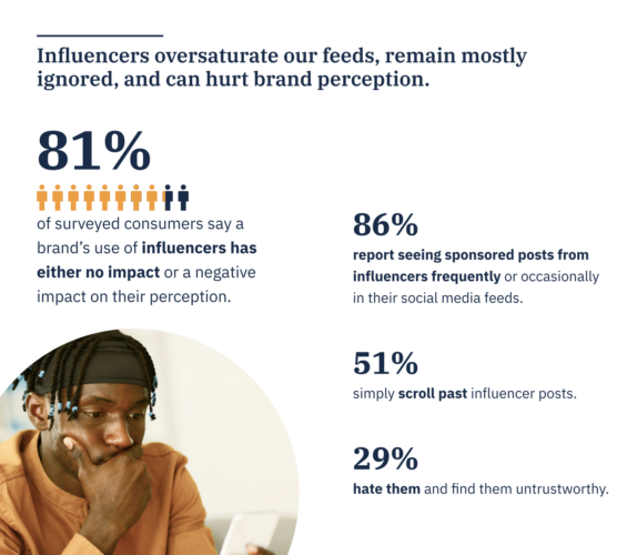Une étude menée Entribe révèle à quel point les influenceurs ont mauvaise presse. Et le moins que l’on puisse dire, c’est que les résultats sont surprenants : les influenceurs ne font pas vendre. Ces derniers temps, de nombreux influenceurs français ont été épinglés par la répression des fraudes pour pratiques commerciales trompeuses et mensongères. Payés une fortune par les marques pour mettre en avant leurs produits, les Nabilla, Capucine Anav et autres leaders d’opinion sont suivis par plusieurs millions d’abonnés qui visionnent en masse leurs publications et stories sur les réseaux sociaux. Mais finalement, à quel point les influenceurs “influencent-ils” réellement leurs abonnés ? À quel point les vues d’une story ont-elles un impact sur les ventes du produit mis en avant ? C’est ce qu’a cherché à comprendre la société d’analyses Entribe au travers d’une large étude menée en avril 2023 auprès de 1.046 Américains âgés de plus de 18 ans. “Nous avons constaté que la confiance des consommateurs envers les influenceurs continue de décliner, tandis que les recommandations des pairs et l’utilisation par une marque du contenu des consommateurs réels continuent d’augmenter”, explique la société sur son site internet. Ce qui est clair, c’est que les influenceurs pullulent sur les réseaux sociaux, ce qui a l’effet inverse de celui escompté. Les marques souhaitent que les influenceurs mettent en avant leurs produits, mais l’overdose de contenus sponsorisés provoque désormais la méfiance des utilisateurs, à tel point que cela renvoie une mauvaise image de la marque. Des chiffres saisissants Selon l’enquête d’Entribe, 81% des sondés avouent que l’utilisation d’influenceurs par une marque n’a soit aucun impact, soit un impact négatif sur leur perception, ce qui peut considérablement remettre en question l’intérêt de leur métier. Face à ces publications que 86% des sondés avouent voir de manière occasionnelle ou plus régulière, la moitié des personnes interrogées continuent de scroller et ignorent la publication sponsorisée. 742 d’entre eux ressentent pour leur part de la colère et trouvent ce type de contenus indigne de confiance. © Entribe. Finalement, et c’est un réel problème pour les marques, plus de 6 sondés sur 10 n’ont jamais acheté un produit mis en avant par une célébrité. Et quant à ceux qui ont craqué, 40% d’entre eux ont été déçus par leur achat. Sans surprise, 4 utilisateurs sur 5 préfèrent obtenir des conseils de leurs amis plutôt que des influenceurs quant à l’achat d’un produit. Chez les jeunes de la génération Z, c’est TikTok et Instagram qui génèrent le plus de revenus pour les marques puisque c’est sur ces plateformes qu’elles vendent le plus. Les générations plus anciennes achètent 4 fois plus souvent sur Facebook. Les autres utilisateurs davantage écoutés Contrairement aux influenceurs, c’est le contenu généré par les utilisateurs (CGU) eux-mêmes qui rencontre le plus de succès auprès des autres usagers. Ainsi, 86% des Américains interrogés font davantage confiance aux marques qui privilégient le CGU plutôt que les influenceurs, tandis que 83% d’entre eux sont plus enclins à acheter si c’est les utilisateurs qui donnent leur avis sur un produit. Tous ces chiffres signent-ils la fin de l’hégémonie des influenceurs sur les réseaux sociaux et le début d’un nouveau mode de consommation sur ces mêmes réseaux ? Probablement pas, mais il est certain que les influenceurs ont bien moins d’impact sur leurs abonnés que ce que l’on pouvait penser.