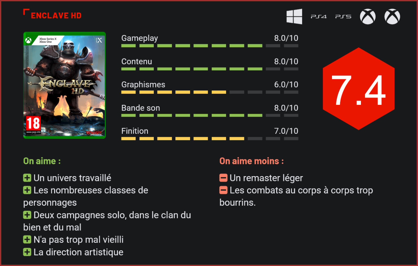 Sorti en 2002 sur PC et Xbox, Enclave est un action-RPG relativement méconnu qui était toutefois parvenu à se forger une solide réputation auprès des amateurs de fantasy avec son univers riche et sombre. 20 ans après sa sortie, le jeu de Starbreeze a droit à son remaster sur les machines de dernière génération. Peu de joueurs se souviennent d’Enclave, pour de nombreuses raisons. Tout d’abord, parce que ce jeu de Starbreeze était sorti à l’époque sur une console peu populaire, la toute première Xbox, qui avait eu droit par ailleurs à l’un des plus gros line-up de lancement de l’histoire du jeu vidéo. Entre Halo, Project Gotham Racing, Amped, Enclave avait eu bien du mal à se faire une place… Le jeu de Starbreeze s’est toutefois forgé une solide réputation auprès des amateurs d’action-RPG de l’époque. Pas d’open-world ici, puisqu’on joue à un titre très linéaire, découpé en niveaux. Une structure vieillotte qui fonctionne toutefois encore très bien aujourd’hui. Car Enclave, c’est un peu l’ancêtre du Souls-like. En plus accessible bien sûr – bien que la difficulté soit bel et bien au rendez-vous! Contrairement à un Dark Souls, vous ne devrez pas recommencer le niveau en cours du début à chaque fois. Chaque niveau comprend plusieurs points de sauvegarde. Contrairement à Dark Souls également, le titre propose également un mode facile plus accessible. Pour le reste, la formule est globalement identique : on progresse dans des niveaux sombres et souvent labyrinthiques, remplis de créatures et d’ennemis qui sont prêts à en découdre avec vous. Visuellement, le jeu n’a pas trop mal vieilli. Enclave se distingue toutefois des autres jeux du genre de l’époque, comme Severance par exemple, par son approche différente. On n’incarne pas ici un seul personnage mais le personnage de son choix. Au cours de l’aventure, on débloquera ainsi plusieurs classes de personnages comme un magicien, un halfling, un archer, une elfe… Aux capacités et pouvoirs uniques. Le jeu intègre également une dimension RPG puisqu’il faudra récupérer de l’or dans les niveaux en les fouillant de fond en comble, ressources qui permettront ensuite de débloquer de meilleurs armements pour son personnage : des épées et armes plus puissantes, de nouveaux types de flèches, une meilleure cuirasse, etc. Et cela sera bien nécessaire puisque vous affronterez dans ce titre une véritable armée de monstruosités, s’intégrant également dans différentes classes. Les combats à distance sont toujours aussi funs. Autre particularité du jeu : il propose non pas une mais deux campagnes solo. Et ça, c’est relativement unique. Vous pourrez parcourir la campagne de la lumière, dans le clan des humains et des elfes, mais également la campagne des ténèbres, du côté des trolls et démons. La campagne des ténèbres est par ailleurs si réussie qu’elle nous ferait presqu’oublier à quel point la campagne de la lumière est déjà sympathique à la base… Quoi qu’il en soit, ne vous attendez pas à y passer des jours non plus, le jeu se terminant en moins de 10 heures. Enclave parvient à surprendre par la richesse de son scénario qui confronte les deux factions, de son lore et de son incroyable casting. Votre façon de jouer devra ici s’adapter à la classe de votre personnage. Avec le guerrier, vous foncerez dans les rangs ennemis à la hache et devrez beaucoup utiliser votre bouclier pour vous protéger. Avec l’archère et le mage, c’est le combat à distance qui prime. D’autres classes proposent plus d’originalité comme le gnome qui pose des pièges ou le halfling qui joue davantage sur la rapidité. Le lore du titre est extrêmement travaillé. Méconnu, Enclave est un action-RPG qui mérite sa seconde chance. La sortie de ce remaster est donc une aubaine pour les amateurs du genre, d’autant plus que le jeu n’a pas trop mal vieilli techniquement (et dans la pratique, les retouches visuelles sont mineures) et que la formule fonctionne toujours aussi bien. Le titre offre par ailleurs une solide replay value avec ses différents niveaux de difficulté. Tout cela n’enlève rien à ses petits défauts : oui le jeu est parfois un peu trop bourrin dans ses combats au corps à corps et sa structure reste très linéaire. Si vous étiez passé à côté de cette petite pépite à l’époque, voici en tout cas l’occasion de redécouvrir ce classique de la toute première Xbox. Conclusion Sorti en 2002 sur Xbox, Enclave était passé relativement inaperçu. Il n’en reste pas moins un excellent action-RPG qui méritait plus que jamais un remaster. Et c’est désormais chose faite. Ancêtre du Souls-like (en toutefois plus accessible), le titre de Starbreeze marque les esprits avec son univers travaillé, ses nombreuses classes de personnages, son excellente bande sonore et ses nombreuses idées innovantes. A la fois technique, bourrin et terriblement addictif, le titre propose surtout deux campagnes solo très différentes, dans le clan du bien et du mal. Un action-RPG atypique que les amateurs du genre ne doivent manquer sous aucun prétexte.