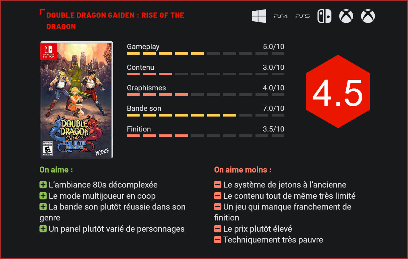 Double Dragon Gaiden : Rise of the Dragon est le petit dernier d’une longue franchise de beat them up qui remonte aux années 80. Et si elle avait su être à l’origine de la plupart des codes du genre, force est de reconnaître qu’en 2023, la série, désormais reprise par un studio singapourien, tient plus de l’auto-parodie que d’autre chose. Double Dragon, l’opus original, est un classique du genre sorti en arcade en 1987 et qui avait su définir un genre et une époque. Il faut dire que le jeu s’inscrit totalement dans l’environnement culturel de son époque : de Bruce Lee à Ken le Survivant, les années 80 sont remplies de films de kung-fu et d’univers postapocalyptiques. C’est dans ce cadre que vont naître les frères jumeaux Billy et Jimmy Lee (oui, comme Bruce), qui évoluent dans un New-York dévasté par une guerre nucléaire et ravagé par une guerre de gangs. Une formule qui restera parfaitement inchangée jusqu’à ce nouvel opus. Si certains jeux de la série, comme Double Dragon Neon, ont tenté d’apporter une renouveau graphique tout relatif à la série, il semble désormais qu’il faille retourner aux sources, voire plus. Car cet opus parvient même à être plus pixelisé que l’épisode original, ce qui est tout de même un tour de force. Le jeu est très… pixélisé. Dès l’écran titre, Double Dragon Gaiden exulte les années 80 avec une musique qui aurait bien eu sa place dans un épisode de Cobra Kai. Difficile de rester indifférent : soit on est porté par le kitsch assumé, soit on déteste. Mais il n’empêche qu’à force de jouer sur la nostalgie, Double Dragon Gaiden en deviendrait presque indigeste. Un système de jetons digne des arcades à l’ancienne est-il encore très adapté de nos jours ? Ce qui est sûr, c’est que le fait de devoir recommencer en permanence la même séquence peut avoir quelque chose d’assez agaçant. Car à moins d’être un collectionneur de personnage, Double Dragon Gaiden ne dispose pas d’une excellente durée de vie. Le jeu se termine en deux heures, en étant généreux. Ce sont donc ces mêmes deux heures qui se répètent inlassablement, puisque presque chaque partie se soldera par un échec qui vous forcera à recommencer du début. Et comme l’accumulation des jetons est très lente, il vous faudra refaire la même chose maintes et maintes fois avant de pouvoir débloquer du nouveau contenu. La boucle de gameplay en elle-même est très similaire à ce que vous pouvez attendre d’un jeu Double Dragon. Ou de n’importe quel beat them up : avec deux personnages que vous jouez en alternance, vous affrontez quatre gangs dans quatre zones différentes. Après avoir affronté la foule des ennemis, vous vous trouvez face à un boss. À chaque fois que vous battez le chef d’un des gangs, le Q.G. des autres clans “s’upgrade”, et les niveaux deviennent de plus en plus longs, en deux ou trois parties avec à chaque fois des boss plus élevés. Et vous aurez l’occasion, entre deux boss, d’upgrader votre personnage. Des momies, du sable et des pyramides, en plein New York post-apocalyptique ! Les jetons sont conçus non seulement pour acheter des personnages et des bonus supplémentaires, mais également pour sauver votre partie. Car au moindre échec, si vous n’avez pas de quoi payer, vous recommencez à zéro. Vous pouvez aussi, en cours de partie, ressusciter vos personnages pour quelques dollars que vous aurez collecté en battant des niveaux. Mais attention: le prix augmente à chaque résurrection… Un autre souci apparaîtra aux joueurs sur PC. Si nous vous conseillons bien évidemment de jouer à Double Dragon Gaiden au moyen d’une manette, pour ceux n’en ayant pas, il est impossible de changer la disposition des commandes du jeu, qui sont calibrées sur le QWERTY. Un problème qui peut vite être réglé en changeant de disposition du clavier directement sur l’ordinateur, certes, mais qui peut s’avérer très agaçant. Du reste cependant, Double Dragon s’avère être un jeu tout à fait sympathique, bien qu’il ne casse pas les codes du genre et n’invente rien de bien nouveau. Les quatre personnages de base ont des mouvements variés qui permettent un gameplay diversifié, bien qu’on puisse regretter un certain déséquilibre entre, par exemple, un personnage de Marian qui, avec son attaque à distance et ses attaques spéciales explosives, est presque « overpowered », et un personnage d’Uncle Matin, certes très balèze, mais dont la lenteur fait un personnage sous-optimal. Vous aurez donc tendance à tout le temps vouloir jouer avec la même équipe. On notera également, en parlant des attaques des personnages, que les capacités spéciales de ceux-ci tendent à varier de manière presque aléatoire. C’est particulièrement le cas pour Marian, qui oscille entre trois attaques différentes, du Bazooka au Fouet, sans qu’on puisse vraiment déterminer ce qui déclenche l’une ou l’autre. Le temps de latence entre deux coups reste assez long, et on perd souvent le contrôle de son personnage pendant de longues secondes alors que celui-ci se prend une rafale de coup. Ce qui peut s’avérer plutôt agaçant, mais correspond plutôt bien à la réalité des arcades à l’ancienne. Le jeu est tout à fait sympathique en multijoueur, où il constitue un bon divertissement entre amis qui ramènera avec plaisir ceux-ci dans la même pièce à une époque ou le multijoueur se décline surtout en ligne. En solo, toutefois, le jeu n’a pas beaucoup d’intérêt, sauf à se plonger dans une ambiance volontairement kitsch. Rien de bien étonnant pour un jeu du genre. Un sympathique mode multijoueur pour deux Il n’empêche que Double Dragon Gaiden a un prix. Et celui-ci (29,99€) n’est pas négligeable, au vu du peu de contenu qu’il a à offrir et de sa réalisation très bancale. Car si le Pixel-Art est un style à part entière, il faut bien r