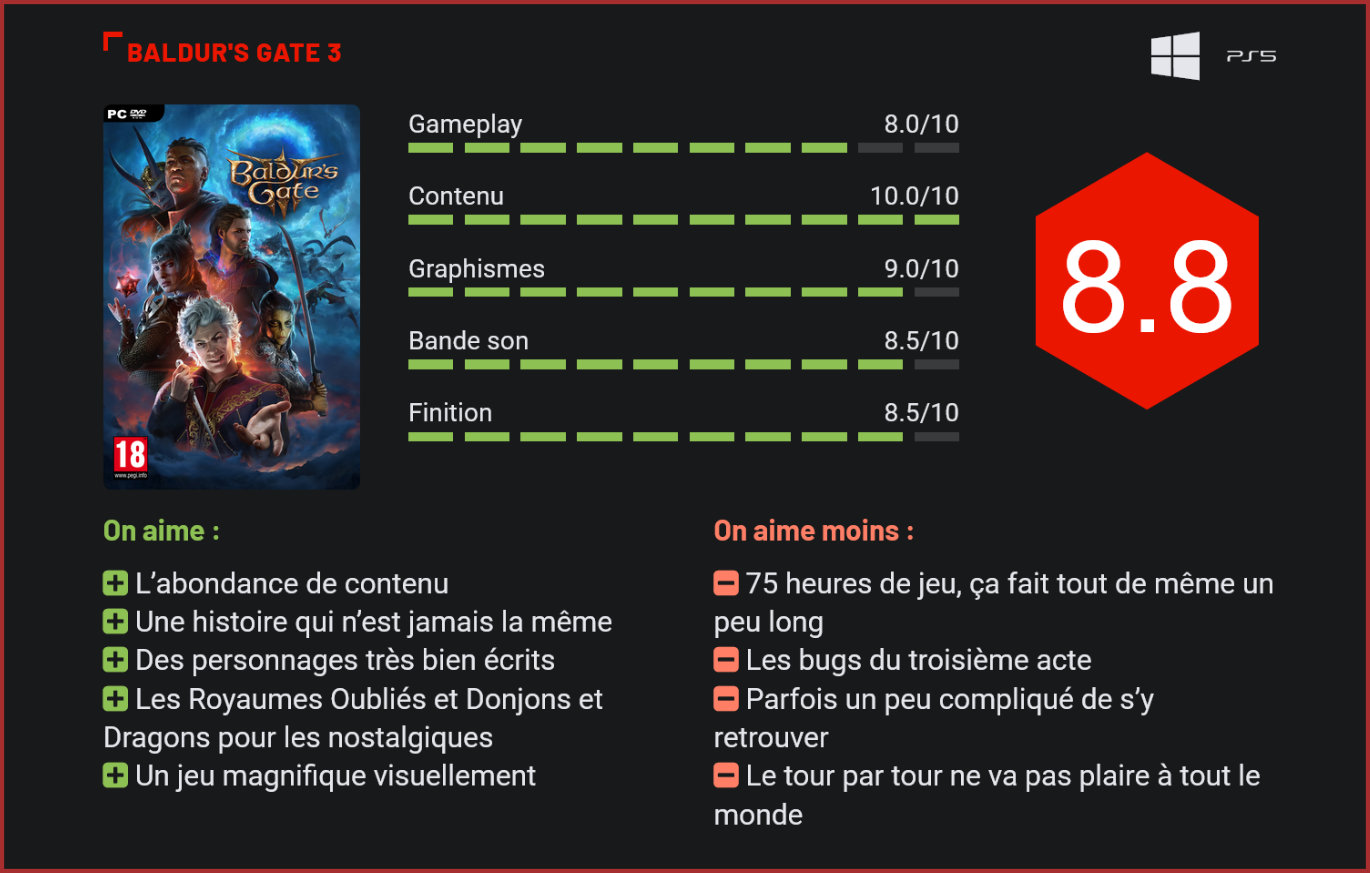 Petite fierté nationale belge, le jeu Baldur’s Gate 3 a pourtant été principalement conçu à l’étranger. Mais qu’en est-il de la qualité de cet impressionnant Divinity: Original Sin à la sauce D&D ? Baldur’s Gate 3 est un jeu terriblement mal nommé… En tout cas, c’est ce qu’on dit. Si vous connaissez un peu le monde du CRPG, alors vous saurez que ce nouveau jeu ne se joue pas comme un Baldur’s Gate du tout, mais plus comme Divinity: Original Sin, avec quelques éléments de Dragon Age. Mais peut-on vraiment blâmer Larian ? Après tout, la formule des deux premiers jeux est typique des années 1990, et il est difficile de dire ce à quoi elle devrait ressembler de nos jours. Mais assez parlé des premiers opus d’une franchise qui a été mise en pause pendant 23 ans. Car oui, c’est vrai, Baldur’s Gate 3 n’a aucun rapport, ou presque, avec ceux-ci. Alors autant en parler comme d’une nouvelle expérience à part entière. On peut enfin combattre un Tyrannœil en 4K ! (mais toujours au tour par tour) Il y a quelques semaines encore, en effet, on ne parlait pas beaucoup de Baldur’s Gate 3. Certes, il était en accès anticipé depuis octobre 2020 et il avait eu droit à une apparition dans le Summer Game Fest, mais ça s’arrêtait là. Et puis, quelques jours avant sa sortie définitive, quelque chose s’est passé. Une explosion. Et voici qu’un jeu appartenant à un genre de niche s’il en est se trouve être le jeu le mieux noté de l’année sur Metacritic (Au moment d’écrire ces lignes, avec 20 critiques. Il est évident qu’il va un peu baisser par après.) et que beaucoup y voient le jeu de l’année, à égalité avec des adversaires de taille tels que Tears of the Kingdom ou Starfield. Alors est-ce que la hype est méritée ? En un mot : oui. Tout d’abord, Baldur’s Gate 3 impressionne par sa taille. Comment en effet ne pas être en admiration devant un jeu qui laisse à ses joueurs la possibilité de faire l’expérience de 17.000 variations de fin différentes (et plus d’une dizaine de véritables fins différentes) ? Sur un jeu dont les dialogues contiennent près de deux millions de mots (soit davantage qu’à la recherche du temps perdu de Marcel Proust) ? Car Baldur’s Gate 3 est un RPG, un vrai : un jeu ou les choix que vous prenez vont complètement redéfinir l’histoire que vous vivez, et où il ne sera pas possible, à moins de le faire exprès, de vivre deux fois le même récit. Face à un tel arbre de possibilités, même un Mass Effect ne peut que s’incliner. Mais de quoi ce Baldur’s Gate 3 parle-t-il ? Si c’est bien sûr impossible de résumer une histoire aussi polymorphe, le début est toujours le même : dans l’univers des Royaumes Oubliés, votre personnage est capturé par des Flagelleurs Mentaux (des créatures psioniques au faciès de Cthulhu), et se fait infecter par un parasite. Avec une équipe de compagnons que vous récoltez au bord de la route, votre but, en tout cas au début, est de se débarrasser du parasite avant de vous transformer vous-même en Flagelleur Mental. Sauf que nous venons de vous résumer les premières minutes d’un jeu qui dure en moyenne 75 heures. Inutile de dire qu’une fois que vous aurez fini ce mastodonte (si vous tenez le coup), le petit parasite des débuts sera loin d’être votre principale préoccupation. Ce que le studio gantois vous propose est en réalité une expérience que beaucoup de gens vivent depuis déjà des années : une campagne de Donjons et Dragons, avec de magnifiques graphismes en plus. Si vous connaissez D&D, alors, vous savez déjà comment jouer à Baldur’s Gate 3 (les règles sont identiques) et ce jeu est sans aucun doute fait pour vous. Sinon, ça pourrait être une belle introduction à ce passe-temps. Mais il faut reconnaître que pour certains, il sera un peu plus difficile de rentrer dans le jeu. Car oui, Baldur’s Gate 3 est bien un CRPG avec des combats au tour par tour et des jets de dés pour réaliser pas mal d’actions. Si on se fait très vite à cette deuxième partie, l’aspect « tour par tour » n’est pas apprécié par tout le monde, d’autant plus qu’il s’agit d’abord et avant tout d’élaborer des stratégies parfois complexes. Mais fort heureusement, Larian a pensé à tout en vous proposant un mode narratif. Dans celui-ci, les combats passeront très facilement, et vous n’aurez qu’à profiter de l’histoire, ou plutôt des histoires. Car il serait vraiment dommage de passer à côté de Baldur’s Gate 3. Alors comment se déroule une partie de Baldur’s Gate 3 ? Après avoir créé un personnage dont vous pourrez tout personnaliser (tout le monde est déjà plus ou moins au courant d’un gimmick qui tient plus de la blague de développeur que d’autre chose : on peut même choisir les organes génitaux de celui-ci, comme dans Cyberpunk), on est plongé dans l’aventure « in media res ». Que vous créiez un féroce guerrier drakéide ou un elfe gracieux, vous pourrez tout personnaliser, vraiment tout. Armé de sa souris (le clavier est plus qu’inutile) ou d’une manette (mais tout de même, la souris est préférable), on explore la carte, découpées en différentes zones, à la recherche de personnages à qui parler, de compagnons à recruter, ou d’ennemis à combattre. Si Baldur’s Gate 3 n’est théoriquement pas un open-world, il en a les caractéristiques : les différentes zones sont effets tellement immenses qu’elles pourraient chacune faire office de mondes ouverts en elles-mêmes (encore une fois, le gigantisme de ce jeu se manifeste dans tous ses aspects). Pourtant, le jeu ne présente pas les défauts classiques des mondes ouverts : on ne s’ennuie pas, le monde est loin d’être vide, et le(s) scénario(s) fini(ssen)t toujours par nous retrouver, que ce soit par des péripéties croisées sur le bord de la route ou par les personnages. Car jamais Baldur’s Gate 3 