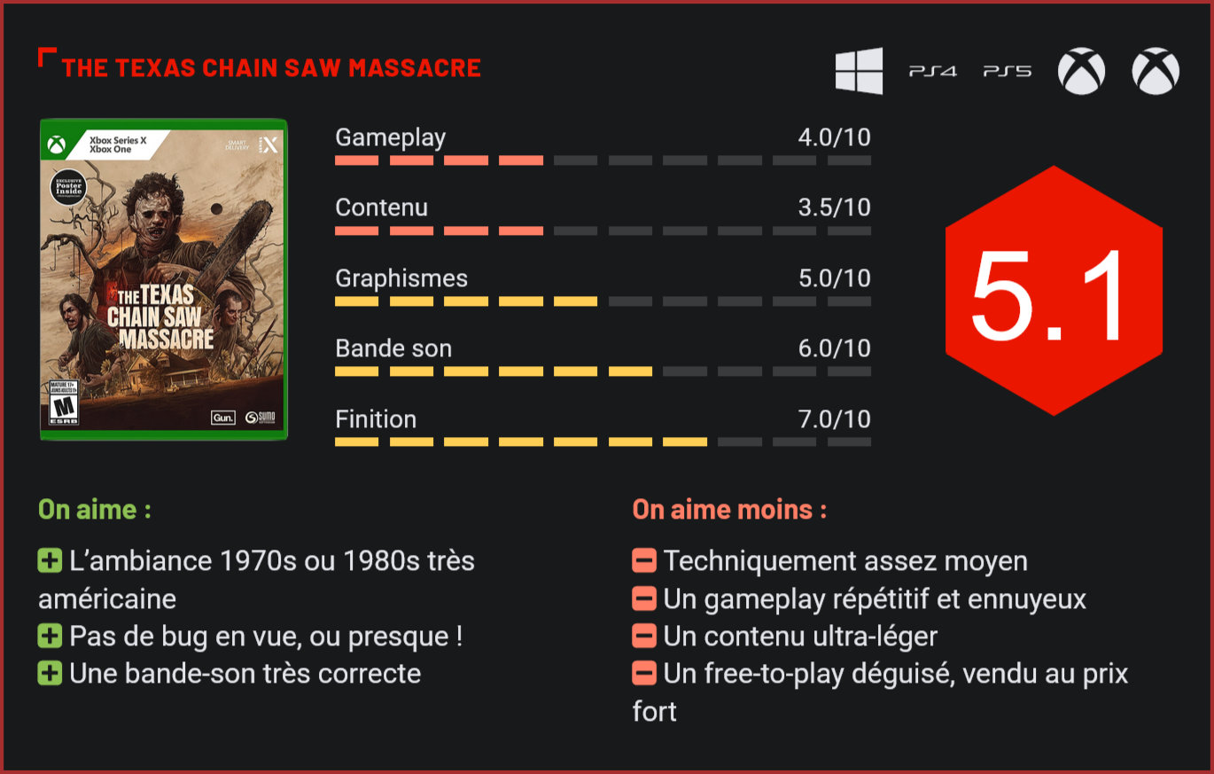 À l’ère du multijoueur, même le genre de l’horreur n’est pas épargné. Et quand on ressort un film des années 1970 pour en faire un jeu multijoueur en équipe, ça donne The Texas ChainSaw Massacre. Massacre à la Tronçonneuse est un classique de l’horreur de 1974 mettant en scène Leatherface, un tueur en série toujours accompagné de l’arme qui donne son nom au film, et portant un masque en peau humaine. L’idée d’adapter la franchise en jeu vidéo n’est pas nouvelle, et il faut dire que le terrain est propice au genre du survival horror. Mais The Texas ChainSaw Massacre n’est pas à proprement parler un jeu d’horreur mais bien un jeu multijoueur asymétrique. Deux équipes s’affrontent donc : la « famille », et les « victimes ». Une sorte de Dead by Daylight, mais avec plusieurs tueurs, en somme. Dans la plupart des jeux, vous devez appuyer sur un bouton pour vous accroupir. Pour les victimes, c’est le mode de déplacement principal… La « famille », c’est la famille Sawyer des films, à savoir toute la bande de frangins et de parents psychopathes de Leatherface. Une équipe déjà assez asymétrique en elle-même, puisque le joueur qui a l’honneur d’incarner le célèbre tueur sera la star de la soirée. Les « victimes » sont plus équilibrées et, comme il se doit, plus faibles. Une partie se passe donc comme suit : les victimes se réveillent, souvent pendues par les pieds, au fin fond d’une des trois cartes. Leur objectif ? Fuir. Nulle coopération n’est vraiment nécessaire pour elles, ni même encouragée, pour être honnête. Au contraire, pour les membres de la « famille », une bonne communication entre ceux-ci sera indispensable afin de se débarrasser de chacune des victimes. Ceux-ci disposeront également de « Grand-Père », vieil homme issu des films de la franchise originale, et qui sera capable de détecter les victimes pour peu que celles-ci bougent un peu trop. Au niveau du gameplay, toutefois, inutile de dire que The Texas ChainSaw Massacre ne casse pas des briques. Pour les victimes, par exemple, le jeu se limitera plus ou moins à explorer la carte à la recherche d’une sortie, et à interagir avec des objets en appuyant sur la même touche, tout en faisant attention à ne pas faire trop de bruit. On peut vite s’ennuyer… Les membres de la famille ont un peu plus de gameplay, car ils disposent chacun d’une capacité spéciale, mais ce n’est pas non plus folichon. Fouillez dans des boîtes à outil pour ouvrir des portes tout en faisant du bruit… voilà plus ou moins 100% du gameplay ! Qui plus est, le jeu vous encourage à jouer en permanence le même personnage afin de pouvoir le faire évoluer et lui débloquer des compétences, ce qui risque bien d’amplifier la répétitivité du gameplay, du moins si vous voulez pousser vos personnages à fond. C’est dommage, car avec un mode solo, l’univers de Massacre à la tronçonneuse avait de quoi promettre, et les idées, pas toujours très abouties, seraient probablement nettement mieux passées si le jeu donnait plus dans le mystère et dans le « show don’t tell ». Alors qu’ici, à la fin de la partie, on a droit à une petite dance un peu ridicule de la part de Leatherface qui célèbre sa victoire. Visuellement, le jeu n’est pas très beau. Certes, c’est un jeu en multijoueur, mais les objets individuels, ainsi que les personnages, ne sont pas très détaillés. Parfois, dans une scène avec beaucoup d’objets, ils peuvent faire illusion, mais dans la mesure où le jeu se passe le plus souvent dans des couloirs ou des caves, la mauvaise qualité des graphismes finit par se remarquer. Quand le jeu se passe en extérieur, les graphismes paraissent presques beaux ! Cela dit, le jeu a joué à fond la carte du vieux film d’horreur. En allumant le jeu pour la première fois, vous serez accueilli par un texte jaunâtre défilant vers le haut, dans une esthétique digne des vieilles VHS, tandis qu’une voix off vous résumera l’histoire (laconique) du jeu. Si on ignore la qualité graphique très inégale, l’esthétique de la maison reste très proche de celles que l’on peut voir dans les vieux films de cette époque, et l’ambiance musicale horrifique est parfaite pour vous hérisser le poil ! Un autre aspect problématique : la composition des équipes devant être systématiquement de quatre victimes et trois tueurs, le matchmaking peut avoir quelques (très gros) soucis. Il est probable qu’avec la sortie du jeu et son entrée dans le Game Pass, ceux-ci soient résolus, mais pour peu que le soufflet retombe, les fans devront sans doute beaucoup attendre. À noter qu’il sera aussi possible d’organiser une partie entre amis, à partir de quatre joueurs. Mais celle-ci ne vous rapportera aucun point d’expérience. Toutefois, en dehors de cette question de matchmaking, nous n’avons (en ce qui nous concerne) pas constaté de bug dans ce jeu, plutôt bien fignolé il faut l’avouer. En ce qui concerne le prix (38,99€) de The Texas ChainSaw Massacre, il faut bien l’avouer, c’est assez cher pour un titre 100% multijoueur qui ne propose que 3 malheureuses petites cartes et aucun mode solo. A vrai dire, beaucoup nous rappelle le cas Vendredi 13, précédent jeu du studio, au concept plus ou moins identique, et aux qualités et défauts plus ou moins identiques eux aussi… Clairement, ce titre a beaucoup du free-to-play. Devoir débourser 39€ pour ça, ça fait donc assez mal… A moins d’être un fan pur et dur du genre, difficile donc de le conseiller au prix plein. Conclusion The Texas ChainSaw Massacre, ou Massacre à la Tronçonneuse, est un jeu multijoueur asymétrique qui reprend dans les grandes lignes le concept d’un Vendredi 13 ou d’un Dead by Daylight. Ce jeu de niche ravira sans doute les fans du genre, ou ceux des films, mais pour le grand public, il risque fort de le laisser sur sa faim. La faute à un c