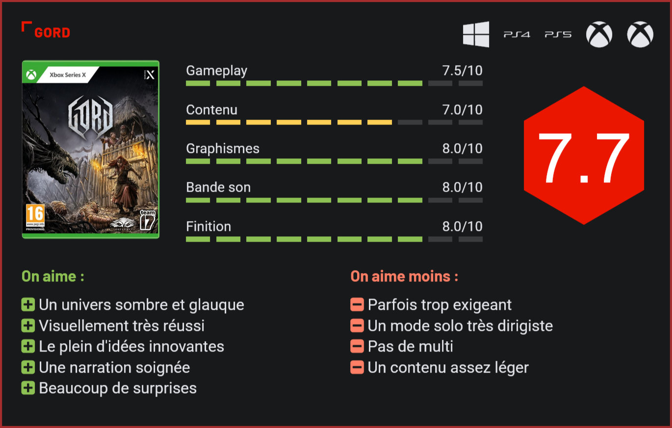 On ne l’attendait pas vraiment au tournant. A vrai dire, la plupart d’entre vous n’en ont même sans doute jamais entendu parler. Gord est pourtant l’une des meilleures surprises de cet été. Et bonne nouvelle, le jeu est disponible presque sur toutes les plates-formes. Si l’été n’est traditionnellement pas une période chargée dans l’agenda des sorties, 2023 fera sans doute figure d’exception à la règle. A côté de quelques plus gros jeux sortent également de plus petites productions savoureuses, à l’image de ce Gord, probablement l’un des jeux de gestion les plus atypiques que vous croiserez cette année… Gord prend place dans un univers médiéval-fantastique inspiré des contes slaves. Il s’agit d’un jeu de micro-gestion dans lequel vous allez prendre la destinée d’une poignée de paysans entre vos mains. Le concept est simple : construire votre Gord, un petit village fortifié, le faire prospérer tout en survivant aux menaces du monde qui vous entoure. Il faudra dresser les limites de votre “gord”. Car Gord n’est pas un jeu de stratégie ou de gestion comme les autres. Le titre est clairement orienté survie, et il ne vous fait pas la vie facile. Même dans le mode de difficulté le plus simple, il y aura du challenge. Après avoir dressé les palissades de votre gord, vous serez amené à collecter divers matériaux comme du bois, des roseaux, de la pierre ou des ressources alimentaires pour bâtir différents bâtiments, comme une scierie par exemple ou une tour de guet. Les bâtiments que vous construirez ont tous une réelle utilité. Par exemple, il vous sera impossible d’exploiter le bois sans scierie. Les besoins de votre communauté – qui compte à peine cinq membres au premier chapitre du jeu, d’où le concept de micromanagement – seront beaucoup plus variés que vous ne le pensez. Il ne s’agit pas ici uniquement de récupérer des ressources à proximité de votre campement. Chaque villageois a plusieurs besoins primaires. L’alimentation est la priorité absolue, mais vos personnages ont aussi une jauge de bien être mental. Pour éviter qu’ils ne sombrent dans la démence, il faudra prendre soin d’eux. Veiller à ce qu’ils soient protégés quand ils s’aventurent en dehors du gord, éclairer leur chemin, leur donner des divertissements aussi, en fabricant par exemple de l’hydromel. Le concept d’un esprit sain dans un corps sain prend ici tout son sens. Votre gord comprendra différentes structures, qui répondent toutes à des besoins bien spécifiques. La notion de danger est également omniprésente puisqu’au dehors de votre gord, les dangers sont nombreux, qu’il s’agisse des loups affamés qui attaqueront vos villageois, des maladies qui les infecteront, des tribus rivales ou d’immondes créatures qui se déplacent sur la carte… Outre la jauge de vie de vos villageois, il faudra constamment surveiller leur jauge de bien être mental, pour s’assurer qu’ils ne finissent pas fous et s’enfuient dans la nuit obscure. Les monstruosités auxquels ils seront confrontés n’ont pas de mot. Car les développeurs se sont laissés aller aux pires sévices. Vous serez ainsi amené à sacrifier – littéralement – certains villageois, voire des nouveaux nés aux créatures qui hantent les forêts, pour satisfaire leurs demandes et éviter une confrontation. L’univers de Gord suinte de noirceur, et c’est ce qui nous plait chez lui. Si les parties gestion et survie sont fort mises en avant, il faudra aussi explorer les environs avec des éclaireurs. Et il s’agira d’être prudent. A l’aide de deux cercles tactiques, le joueur est capable de savoir à quelle distance son éclaireur peut voir, mais aussi déceler des bruits dans un rayon plus large, et ainsi anticiper les menaces. La fuite sera souvent une option totalement envisageable. Les monstruosités qui vous attendent dehors sont nombreuses. Malgré les apparences, Gord est un jeu très complexe à prendre en main. Accessible, niveau gameplay, mais qui ne cesse de nous surprendre avec des situations inédites et de nouvelles mécaniques à maîtriser. On ne sait jamais à quel type de menace on s’expose dans ce monde brutal. Rapidement, vous vous rendrez ainsi compte qu’il existe également des divinités qu’il vaut mieux ne pas froisser. Les cultes font partie intégrante du programme, et il faudra leur montrer du respect. Des sorcières vous permettront également de lancer des sorts qui auront le potentiel d’inverser le cours d’une bataille. S’il est par essence très scripté compte tenu de son côté narratif soigné – vous aurez droit à votre lot de cinématiques, dialogues et objectifs principaux à remplir -, Gord vous propose toutefois aussi quelques quêtes annexes à remplir. Il s’agit toutefois d’un jeu très balisé, par rapport aux autres titres de gestion. Vous saurez toujours ce qu’il faut faire pour progresser et si les façons d’arriver à votre objectif sont multiples, le chemin emprunté ne diffèrera en général pas beaucoup. Le jeu n’est pas bien long – comptez une grosse douzaine d’heures pour venir au bout de sa campagne -, et ne propose pas forcément une grosse rejouabilité non plus. Pas de multijoueur non plus à l’horizon. En revanche, il faut bien l’avouer, le prix (34,99€) joue en sa faveur et le titre propose tout de même de lancer des parties personnalisées. Côté technique, on frôle en revanche la perfection avec une finition irréprochable, de superbes cinématiques, des visuels soignés et une bande son terriblement efficace (doublages en anglais et sous-titres en français). S’il n’est pas exempt de tout reproche, Gord s’impose en définitive comme une très bonne surprise. Conclusion On ne l’attendait pas vraiment au tournant mais en définitive, Gord s’impose comme une excellente surprise et potentiellement même l’un des jeux de gestion les pl