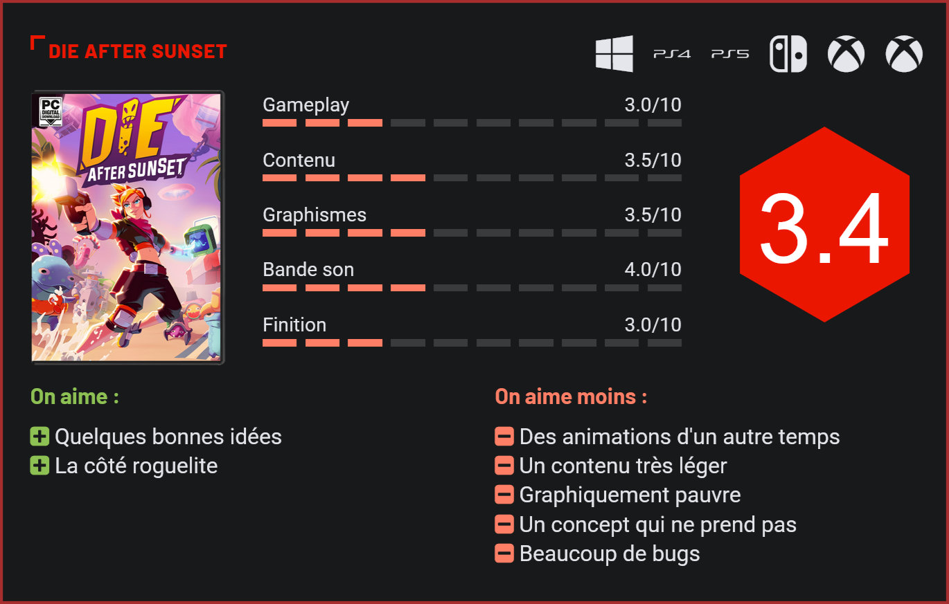 Passé inaperçu jusqu’à sa sortie, Die After Sunset est un roguelite dans la plus pure tradition du genre, qui se démarque par son style graphique et son gameplay, qui rappellent instantanément Fortnite. Développé par un petit studio indépendant et édité par Pqube, Die After Sunset n’a pas beaucoup fait parler de lui. Il faut dire que le titre n’a pas une esthétique très marquante. Le jeu ressemble à s’y méprendre à un clone de Fortnite. A ceci près qu’il ne s’agit pas d’un battle royale gratuit mais d’un roguelite payant… Vendu 19,99€ sur les différents stores numériques, le titre nous propose de nous plonger dans un univers futuriste coloré. Nous sommes en 2120, une race extraterrestre toute mimi, les Murkors, a envahi la planète. On ne sait pas trop comment, mais vous vous retrouvez du jour au lendemain avec la mission de faire le grand ménage. Oubliez toute forme de réalisme toutefois, Die After Sunset se présente comme un shooter arcade à la troisième personne au style assez délirant. La ressemblance avec Fortnite est marquante. Et il faut bien l’avouer, le jeu ne nous explique pas trop bien son but. Concrètement, il faudra errer pendant 6 à 7 minutes sur une carte de taille modeste en éliminant tous les Murkors que vous croiserez, en ouvrant un max de coffres pour obtenir des power-ups et en priant pour obtenir une arme plus puissante à l’issue de micro-missions qui iront de la défense de zone à l’élimination de cibles. Une fois le compteur arrivé à zéro, une “porte” s’ouvrira et vous donnera accès au boss du niveau, qu’il vous faudra éliminer le plus vite possible pour passer au monde suivant. Votre réussite dépend essentiellement des power-ups et armes que vous obtiendrez. Ceci étant dit, le jeu n’est pas bien dur, une fois les bons réglages enregistrés. D’autant plus qu’à chaque partie, vous serez un peu plus fort, c’est tout le principe du roguelite. Cinq boss vous attendent en tout. Du côté des bonnes idées, on citera le côté roguelite justemment, qui nous force à tirer au mieux parti des 6 à 7 minutes de jeu pour faire le max de power-ups avant l’affrontement. Les combats de boss sont aussi sympathiques, même si un peu trop faciles. Et puis bien sûr il y a cet aspect unique au jeu : le fait que les Murkons se transforment en de vilains monstres une fois à l’ombre. Prioritiser les tirs en plein soleil, voilà un concept original. Ceci étant dit, Die After Sunset montre également vite ses limites. Le jeu n’est pas bien long. Un joueur aguerri viendra à bout du titre en 1H30, la faute à une difficulté très basse, pensée pour les plus jeunes. Basse… quand vous avez les bonnes armes et les bons power-ups. Et c’est là tout le problème parce que justement, vu l’intensité des combats, il est fort probable qu’un enfant ne dépassera jamais le premier niveau. Et se faire tuer par des gros bisounours, quelle honte tout de même. Il faudra faire le plein de power-ups pour progresser. One ne va pas vous mentir, Die After Sunset serait un piètre TPS s’il était dépourvu de son côté roguelite. Il y a quelques idées qui sauve le navire du naufrage complet. Toutefois, les fondamentaux sont mauvais. Le gameplay manque de précision, l’équilibrage des armes est mauvais, les sensations de tir médiocres, les micromissions pas du tout intéressantes et l’univers parait en réalité totalement artificiel. Bref, on a vraiment du mal à se prendre au jeu. Comme on l’a dit plus haut, le titre semble aussi se destiner de par son style à un public très jeune, qui pourrait bien ne pas être raccord avec son concept… On marche donc quelque part dans l’entre deux, en se demandant au final à qui peut bien être destiné ce drôle de jeu… Et à vrai dire, Die After Sunset ne semblait tout simplement pas prêt à voir le jour. Le jeu est bugué jusqu’à l’os. Il ne sera ainsi pas rare de voir l’une de vos armes prendre une position rocambolesque dans vos mains, de “tomber” soudainement d’un pont alors que vous étiez bien dessus ou de ne pas toucher un ennemi alors que vous le visiez précisément – la joie des hitboxs foireuses. En l’état, difficile donc de le conseiller aux joueurs. Conclusion S’il rappelle immédiatement Fortnite avec son style graphique coloré, Die After Sunset n’est toutefois pas un autre battle royale mais un rogue lite au concept très différent. Il faudra ici se dépêcher de réaliser des petites missions dans des décors colorés en massacrant de drôles de créatures pour obtenir un max de power ups et d’armes pour ensuite faire sa fête au boss de fin de niveau et progresser vers le niveau suivant. Un concept séduisant sur le papier, mais la sauce peine à prendre, la faute à des gunfights qui manquent de punch, une IA à la rue, des hitboxs foireuses et des idées qui se mélangent mal. Plus exigeant qu’il n’y parait, le jeu avait toutefois un vrai potentiel. On se demande toutefois ce qu’il est passé par la tête pour concevoir des ennemis aussi inintéressants que les Murkons.