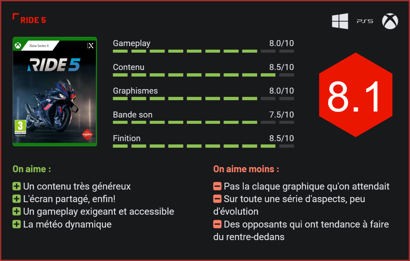 Parmi les studios les plus productifs de ces dernières années, le studio italien Milestone nous livre cette année deux nouvelles productions avec d’un côté le très attendu Hot Wheels Unleashed 2, et de l’autre, une valeur sûre, avec (déjà) le cinquième épisode de sa série de jeux de motos Ride. Et cette année, il y a du changement. Tout d’abord, parce que Ride 5 est le premier épisode de la franchise à ne pas être cross-gen. Le titre sort exclusivement sur PC, PS5 et Xbox Series. Un choix qui s’explique par la volonté des développeurs de proposer un jeu techniquement à jour et tirant parti des capacités des consoles de dernière génération. Ride 5 est de ce fait plus joli que ses prédécesseurs, mais ne vous attendez toutefois pas à une claque graphique. Les principales innovations ici concernent davantage des effets visuels qu’un travail purement graphique, avec le support notamment du ray-tracing, qui améliore grandement le rendu ingame. Le passage à la nouvelle génération a aussi permis aux développeurs d’intégrer des petites nouveautés comme une physique des véhicules retravaillées ou la météo dynamique, grande nouveauté de cet épisode, qui apporte surtout beaucoup plus de réalisme sur la piste. Les courses se déroulent à toutes les heures du jour et de la nuit. De ce fait, Ride 5 n’est pas qu’une simple mise à jour graphique de Ride 4. D’ailleurs, le contenu du jeu tout entier a été revu. Nouveau menu, support de l’écran partagé en multijoueurs, Race Creator qui permet de customiser ses courses en choisissant le tracé, la météo, l’heure de la course ou encore les pénalités, ou encore le nouveau mode Endurance qui permet de participer à des courses qui durent plusieurs heures, idéal pour les vrais mordus de circuit. Si le coeur du jeu reste son mode solo scénarisé, Ride 5 bénéficie d’une quantité impressionnante de nouveautés et fait mouche presqu’à tous les niveaux. Le mode solo de Ride 5 propose d’intégrer une écurie et de se lancer à travers des compétitions tout en progressant à chaque saison. Avec les crédits remportés, vous pourrez garnir votre garage de nouveaux bolides… Le mode solo est costaud, avec plus de 200 événements au programme tout de même. Les conditions météorologiques dynamiques apportent un vrai plus. Ride 5 réalise également un joli travail d’accessibilité en rendant beaucoup plus accessible le gameplay. Le joueur est pris par la main dès la première partie avec quelques tours de piste d’essai avant la première compétition et des explications sur les bases du gameplay. Il a également le choix entre plusieurs modes de conduite, de la simulation ultime au jeu arcade. Alors bien sûr, on n’est pas du Moto Racer en mode facile, mais tout de même. Il est possible de paramétrer la trajectoire idéale et même un ralentissement automatique du véhicule. Les options sont poussées et permettent en définitive de tout paramétrer selon ses désirs. Ride 5 parvient à réaliser l’exploit de concilier simulation pure et jeu de course accessible avec ses nombreux modes de difficulté et paramètres, et ça ce n’est pas rien. Pour le reste, les habitués seront en territoire connu. Le solo est généreux en événements, on circule principalement sur des circuits officiels (35 en tout!), toutes les licences sont au programme (avec plus de 200 bolides) et côté gameplay, le jeu est à la fois technique et fun. Décrocher la première place, même en facile, n’est pas gagné d’avance. Comme on l’a dit plus haut, la principale nouveauté côté gameplay, concerne la météo, qui est désormais dynamique. En cours de course, la météo sera susceptible de changer, ce qui peut avoir un énorme impact sur le résultat de la course selon la configuration de vos pneus par exemple ou votre façon de conduire. Un sol glissant sera beaucoup plus difficile à maîtriser qu’une surface baignant sous le soleil. Et mine de rien, il s’agissait de ce qui manquait le plus à cette simu, qui passe enfin à l’étape supérieure. Visuellement, le jeu fait un pas en avant. S’il ne réinvente pas la roue et n’affiche pas un énorme écart technique avec son prédécesseur, Ride 5 s’impose comme une simulation extrêmement convaincante, qui brille par l’abondance de son contenu et qui corrige la plupart des défauts de ses prédécesseurs. A l’exception peut-être de l’IA qui stagne. Les opposants ont toujours cette fâcheuse tendance à vous rentrer dans l’arrière-train à chaque ralentissement, ce qui peut vite devenir pénible. Les nouveautés sont toutefois nombreuses et cela offre une véritable cure de jouvence à la franchise. Les fans ont, cette fois, une bonne raison de se procurer cette cuvée 2023, qui est sans l’ombre d’un doute la plus savoureuse de la série. Conclusion Si la série n’avait que peu évolué avec les deux précédents volets, Ride 5 marque un changement radical pour la franchise de Milestone. Les développeurs italiens ont corrigé la plupart des défauts des précédents volets. Ce cinquième épisode intègre un nombre impressionnant de nouveautés avec un nouveau mode solo très efficace, un mode Créateur bienvenu, l’introduction de la météo dynamique et un mode écran partagé. C’est aussi le premier épisode véritablement “new gen”. Le jeu n’est pas forcément une claque graphique, mais on sent qu’il évolue dans la bonne direction. Riche en contenu, plutôt joli, Ride 5 réussit surtout l’exploit de concilier un gameplay très exigeant pour les véritables passionnés, et accessible pour le grand public. La customisation des paramètres permet vraiment d’adapter la conduite à votre style, et ça c’est un vrai plus. Si vous aviez raté les précédents épisodes, voici celui qu’il ne faudra absolument pas manquer.