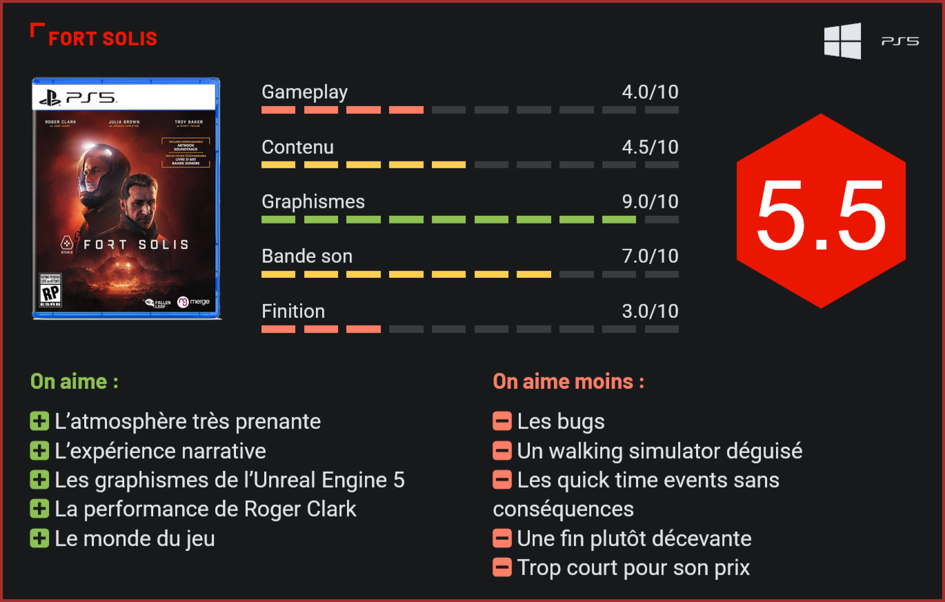 Passé complètement inaperçu par presque tout le monde, Fort Solis est un très bon walking simulator. Quel dommage qu’il ne soit pas présenté comme tel. Nous sommes en 2080, la Terre est en train de devenir inhabitable suite aux effets du réchauffement climatique, et l’humanité se tourne vers de nouveaux horizons. Mars et la possibilité d’une terraformation sont envisagés comme potentiel futur pour l’espèce humaine. C’est dans ce monde que vous incarnez Jack Leary. Accompagné de votre comparse Jessica Appleton, vous travaillez sur Mars quand vous recevez un étrange signal d’alarme provenant d’une base plutôt vétuste : Fort Solis. C’est ainsi que débute Fort Solis. Et ici, nous devons vous prévenir : pour éviter de vous spoiler, nous allons devoir omettre volontairement certains aspects du jeu. Fort Solis est peu ou prou le tout premier jeu à sortir conçu sur l’Unreal Engine 5, et, c’est probablement ce qui fera le plus de son succès à sa sortie tant les médias ont peu parlé du jeu. Et il faut reconnaître que ça se voit : Fort Solis est magnifique. Vous aurez ainsi la joie de découvrir deux technologies graphiques qui avaient beaucoup fait fantasmer : les nanites et lumen. On voit très peu la surface martienne, mais quand on la voit, c’est très réussi… La première est un système qui permet de voir des « meshes » (des objets 3D) de plus en plus détaillés en vous approchant de ceux-ci. Cela permet d’économiser les capacités de votre ordinateur ou console (au dépend de la mémoire) en ayant des graphismes d’une qualité jamais vue. La deuxième est toute simple : un calcul des lumières et des ombres en temps réel. Cela permet d’avoir les effets de lumières les plus réalistes que vous aurez vu. Eh bien figurez-vous que nous avons eu des problèmes avec les deux technologies ! Rien de bien grave en ce qui concerne Lumen. Simplement, en entrant dans de nouvelles pièces et dans la pénombre, vous aurez affaire à des effets visuels un peu étranges. Mais il suffit de se dire que ça fait partie de la patte graphique de l’UE5, et ça passe assez bien. En revanche, les nanites ont bien failli nous poser un gros souci : comme il existe plusieurs versions des mêmes objets, le jeu oublie parfois de charger la version la plus proche, ou le fait un peu tard. Et quand vous devez deviner un mot de passe caché sur un tableau et que vous n’avez pas accès à une texture nette de celui-ci… Heureusement, elle a fini par se matérialiser devant nous après quelques bonnes minutes d’attente. Mais assez parlé de l’UE5. Qu’en est-il du jeu ? Eh bien c’est un très bon walking simulator… Le problème, c’est que Fort Solis n’est pas présenté comme un walking simulator du tout, mais comme un « jeu d’aventure » appartenant au genre du thriller psychologique avec une composante horrifique. Pour ne pas être un walking simulator, Fort Solis a donc eu recours à un subterfuge : des quick time events. Des quick times events qui surgissent de nulle part, à plusieurs dizaines de minutes d’intervalle, au moment où vous y attendez le moins. Mais ce n’est qu’une illusion de gameplay. Comme vous allez par définition rater la moitié de ceux-ci simplement parce que vous aurez oublié que les quick time events existent dans ce jeu, Fort Solis s’est arrangé pour que ceux-ci n’aient aucune incidence sur le scénario. Il s’agit donc bien, véritablement, d’un walking simulator ou d’un film (vaguement) interactif. Un échec durant un QTE n’aura aucune conséquence ! Fort Solis est un jeu très court, 6 heures seulement. Ce qui n’est pas forcément un défaut. Quand on considère que seuls 10% des joueurs terminent les jeux qu’ils commencent, l’idée de faire des jeux plus courts est on ne peut plus logique. Qui plus est, on est là dans la tradition des jeux d’horreurs, lesquels se veulent plutôt court. Mais n’est-ce pas tout de même un peu trop court ? Peut-être pas, le jeu se voulant être une expérience narrative complète et parfaitement renfermée sur elle-même. Toutefois, le scénario connaît un changement de ton et de style très marqué une fois que l’on a passé le tiers du jeu. C’est assez dommage, car on perd une bonne partie de l’ambiance qui avait fait de celui-ci ce qu’il était au tout début. Il aurait donc peut-être bien été nécessaire pour Fort Solis de prendre un peu plus son temps sur cette première partie ? L’ambiance est une réussite pour ce jeu qui parvient parfaitement à installer une atmosphère, même si celle-ci est un peu en contradiction avec ce qui apparaît à la fin du jeu, et peut faire un peu l’effet d’un soufflet qui retombe. Cette atmosphère est en bonne partie portée par une bande sonore extrêmement minimaliste, et qui ne manquera pas de mettre mal à l’aise plus d’un joueur. À noter la magnifique performance de Roger Clark (Arthur Morgan dans Red Dead Redemption 2) et Julia Brown. Même si dans le cas de cette deuxième, elle se bat avec un texte qui fait la part belle à l’humour assez tard dans l’histoire, à un moment où Jessica Appleton devrait déjà avoir pris conscience de la situation et s’avérer moins nonchalante. Même si on est loin d’un Forspoken, le jeu souffre un peu du besoin de dédramatiser la situation même quand ça ne fait aucun sens. Tout ces problèmes disparaissent toutefois à la moitié du jeu. Il nous faut encore parler d’un aspect qui fâche : les bugs. Et là-dessus, pour un jeu de six heures, Fort Solis est… plutôt mauvais. En effet, le jeu fonctionne de telle manière que vous devriez toujours le suivre sur des rails, mais comme il laisse au joueur le soin d’explorer, il vous arrivera fort probablement d’en sortir. C’est là que vous rencontrerez probablement un bug. Si certains sont extrêmement minimes, d’autres sont plus graves. Et là… c’est le bug ! D’autant plus q