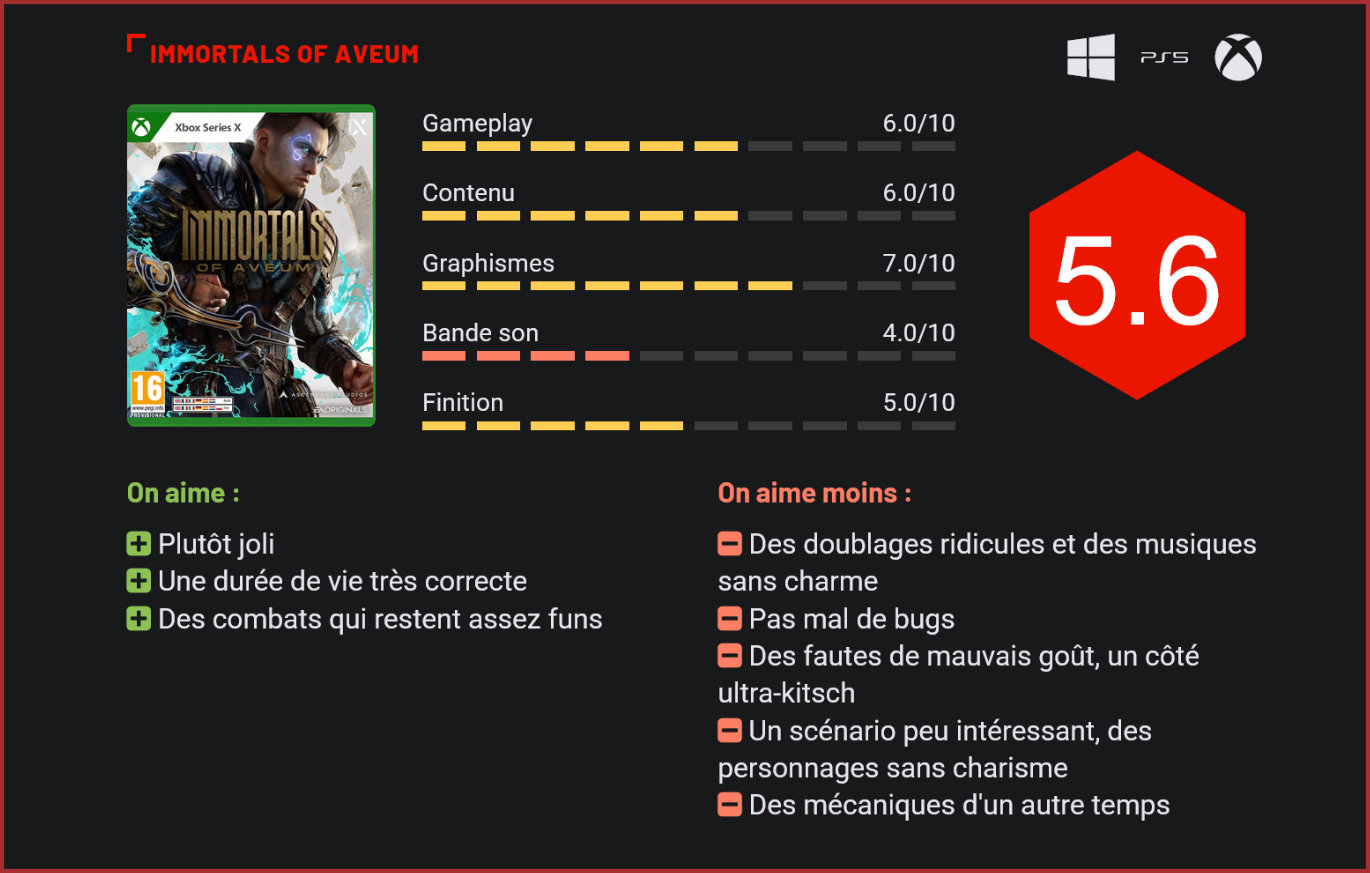 Parmi les jeux les plus attendus de la rentrée, Immortals of Aveum était parvenu à attirer d’un large nombre de gamers avec ses graphismes à couper le souffle et son style de jeu unique. Pad en main, il a toutefois beaucoup de mal à convaincre… Première production du studio Ascendant, qui a été fondé par des vétérans de l’industrie et est censé devenir l’un des studios phares d’Electronic Arts, Immortals of Aveum avait suscité un certain engouement des gamers lors de son annonce. Le jeu avait été présenté par Electronic Arts comme “un Call of Duty prenant place dans un monde médiéval-fantastique”. Pas d’épées ni de haches toutefois ici, mais des sorts. Car dans Immortals of Aveum, vous incarnez un Immortel, un mage d’élite chargé de protéger le Royaume de Lucium contre les agressions de Rasham, le royaume rival. Les cinématiques sont soignées, mais l’histoire est peu intéressante à suivre. Et si Ascendant a beaucoup travaillé sur le world building avec quantité de cinématiques, dialogues et un lore assez vaste, on a malheureusement beaucoup de mal à s’intéresser à un scénario qui reste très fade du début à la fin, ou aux personnalités des protagonistes, peu intéressantes. Pire, il est souvent difficile de garder son sérieux face à des choix artistiques douteux et des dialogues atrocement creux. On ne va pas vous mentir, l’univers d’Immortals of Aveum est à des années lumières de celui d’un Seigneur des Anneaux ou d’un Donjons & Dragons. C’est kitsch au possible avec des effets visuels ultracolorés à l’écran, des personnages ultra-stéréotypés qu’on croirait tous sortis d’une série teenager de The CW et des dialogues dignes des plus mauvais films du MCU. Rien que ça. Il faudra parfois utiliser vos pouvoirs pour manipuler votre environnement. Visuellement, le jeu est plutôt joli, mais on est loin de la claque qu’on attendait sur un jeu “new gen”. Les visages des personnages sont superbes, certains environnements charmants, mais les choix artistiques douteux, les nombreux bugs graphiques et surtout le manque de détails dans les environnements nous ramènent vitre à une triste réalité. Pad en main, on se rend aussi très vite compte qu’Immortals of Aveum ne sera certainement pas le jeu de l’année. Le titre se joue comme un FPS, c’est vrai. Le joueur incarne ici un mage aux capacités uniques puisqu’il est capable d’utiliser les trois formes de la magie, et donc de passer d’un gantelet à l’autre de la pression d’un seul bouton. Il pourra ainsi maîtriser les forces du jeu, de la nature ou de la glace. Son arsenal est entièrement upgradable avec les ressources accumulées et totalement personnalisable aussi. Et si les combats sont plutôt intenses, le jeu se montre également très vite atrocement répétitif. Il n’y a que très peu de diversité dans le bestiaire puisqu’on affronte toujours les mêmes types d’ennemis, chaque type d’ennemi est plus fragile par rapport à une magie bien spécifique, ce qui réduit systématiquement votre choix dans l’approche du combat, et surtout, le jeu est très mal équilibré. Le début de l’aventure nous a ainsi paru beaucoup plus difficile que le milieu ou la fin du jeu… Pire, certains niveaux tirent en longueur avec des allers-retours incessants dans un open world creux. Le bestiaire n’est pas très varié. Très ambitieux sur le papier, le jeu peine à convaincre par sa progression très linéaire, dans un univers open-world très mal exploité, et ne fait souvent qu’égratigner des idées qui auraient pourtant mérité d’être davantage explorées. L’open world aurait ainsi permis de créer un véritable jeu de rôle, avec des quêtes annexes, un système d’évolution du personnage plus libre (on se contente ici d’acquérir de nouveaux pouvoirs de mission en mission, sur un parcours bien défini), plus de diversité aussi dans les missions qui se réduisent la plupart du temps à avancer et tirer sur tout ce qui bouge jusqu’à un combat de boss la plupart du temps très décevant. Il y a, dans Immortals of Aveum, plein de choses qui ne vont absolument pas. A vrai dire, on a souvent eu l’impression de jouer à un jeu d’il y a 20 ans. Dans ce jeu, vous serez par exemple amené à détruire continuellement des coffres en bois pour récupérer du cash. Chaque micro-zone de jeu renferme un nombre incalculable de coffres à briser et parfois de manuscrits à récupérer – lesquels vous en apprendront plus sur le lore du jeu. Immortals of Aveum est également un jeu excessivement linéaire, qui se joue en ligne droite sans jamais pousser à la découverte. Les chapitres sont bien définis et encadrés par des cinématiques et dialogues. On n’est jamais poussé à interagir avec les autres PNJ ou à se lancer dans la découverte des lieux. Et c’est bien dommage, car il y avait un réel potentiel dans ce jeu. Au niveau des défauts notables on citera également l’IA très pataude des ennemis, un certain manque de lisibilité dans les combats et un rythme haché. Tout n’est bien sûr pas à jeter : le jeu est graphiquement très correct, la durée de vie est relativement solide (comptez 12 à 15h), et les combats restent funs, pour peu que vous n’enchainiez pas les heures de jeu. L’ennui, c’est que pour un jeu triple-A, l’expérience est loin d’être marquante. Immortals of Aveum a nécessité cinq ans de développement et le résultat est loin d’être à la hauteur, tant en terme de storytelling que de world building ou de gameplay. Alors oui, ce n’est pas un mauvais jeu, mais ce n’est clairement pas non plus un jeu qui restera dans les mémoires. C’est typiquement le jeu pop-corn qu’on finit en 2 ou 3 jours et sur lequel on ne reviendra jamais. Et c’est bien dommage. Conclusion Annoncé comme le “Call of Duty médiéval-fantastique”, Immortals of Aveum était un projet parti