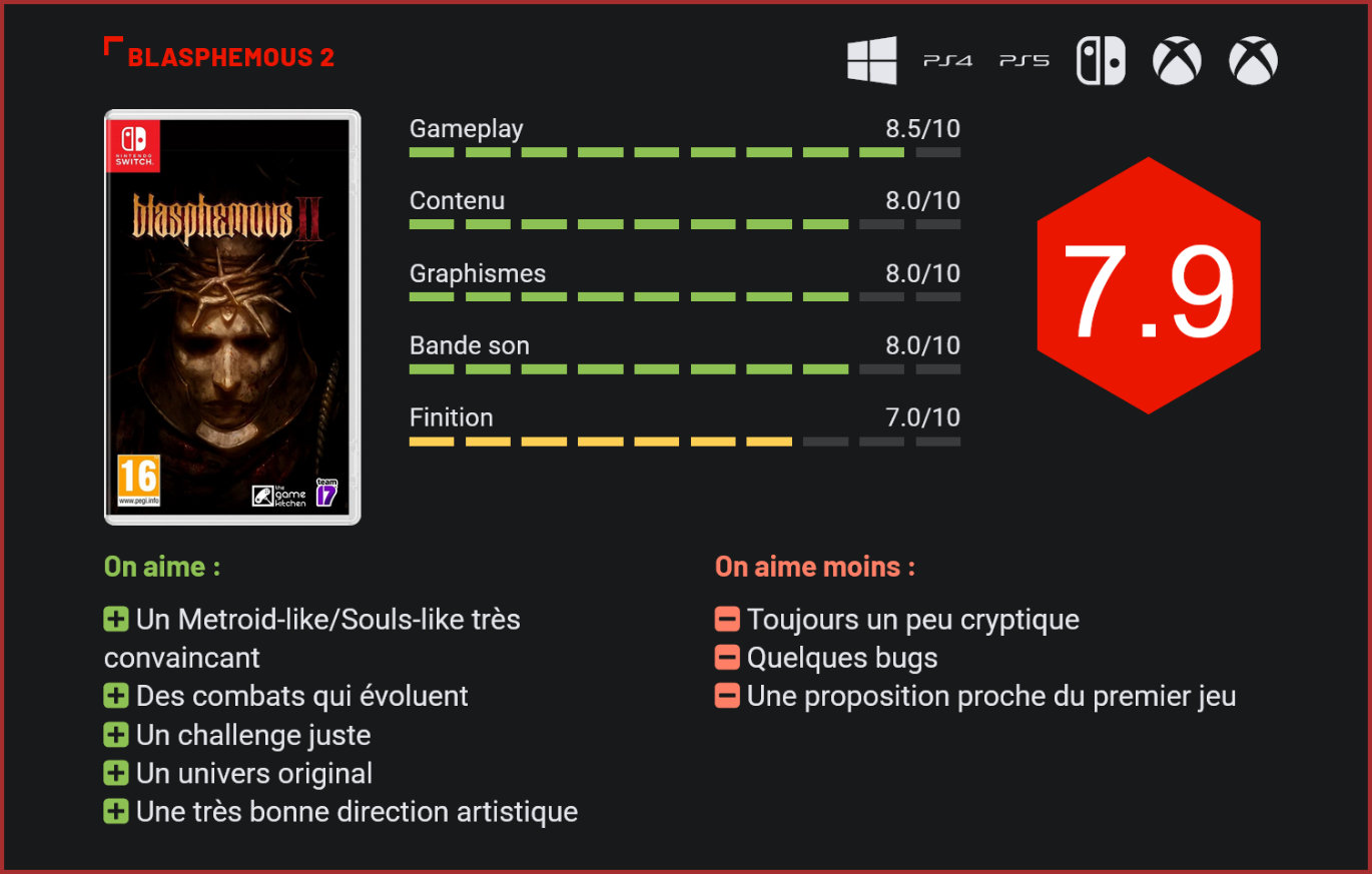 Quatre ans après la sortie du jeu original, le studio The Game Kitchen nous propose la suite du premier Blasphemous. Le pénitent est de retour pour une nouvelle aventure dans cet univers si particulier. Les amateurs de jeux indépendants connaissent aujourd’hui The Game Kitchen pour le fameux Blasphemous. Le titre du studio espagnol est sorti en 2019 et a rencontré un très beau succès, à la fois critique et commercial, s’écoulant à plus d’un million d’exemplaires. Quatre ans après, les mêmes développeurs proposent une véritable suite à cette aventure. Le premier Blasphemous était une proposition intéressante, mélangeant plusieurs genres qui ont fait les beaux jours de la scène indépendante dans un univers inspiré du folklore espagnol. Nous incarnons le pénitent, un personnage mystérieux qui s’éveille suite aux évènements du premier jeu et de ses extensions. Ce dernier doit explorer une nouvelle région surplombée par une immense citée portée par des statues géantes. Au-dessus flotte un cœur, lui aussi géant, qui annonce l’arrivée de l’enfant du Miracle. Un jeu au scénario particulièrement cryptique, peut-être un peu trop, mais qui propose un univers véritablement intriguant. Tout comme le premier épisode, cette suite propose des visuels impressionnants. Ce Blasphemous 2 ne s’éloigne pas tant de son prédécesseur, il s’agit toujours d’un jeu d’action et d’aventure en 2D, un titre qui rentre à la fois dans la case du Metroid-like ainsi que du Souls-like. Comprenez par ces appellations un peu barbares que Blasphemous 2 nous demande d’explorer différentes zones labyrinthiques aux ramifications souvent bloquées par des obstacles infranchissables, de trouver de nouveaux pouvoirs pour nous donner plus de possibilités et franchir ces fameux obstacles, et enfin que le titre propose du challenge en nous confrontant à de très nombreux ennemis dont il ne sera pas toujours facile de venir à bout. Le titre propose tout de même quelques nouveautés, notamment du côté de ses combats en nous donnant accès à trois armes différentes qui changent notre vitesse et nos capacités, en plus de nous permettre d’activer différents mécanismes. Si le titre nous demande de choisir l’une des trois armes blanches au tout début, il ne faudra pas attendre longtemps avant de trouver les deux autres et de pouvoir alterner entre ces dernières à tout moment. L’épée est la solution équilibrée, tandis que les deux rapières permettent de frapper vite et moins fort avec le pouvoir de la foudre, et finalement le fléau permet de frapper très fort et lentement avec le pouvoir du feu. Des armes qui peuvent s’améliorer grâce à trois arbres de compétences qui proposent de débloquer de nouveaux coups très utiles. Nous pouvons également équiper notre personnage de différents objets permettant de lui attribuer des effets passifs ou encore de lui donner des pouvoirs supplémentaires à activer en dépensant la jauge de ferveur, qui se remplit en frappant les ennemis. L’univers du jeu est toujours aussi captivant. Comme dans beaucoup de Souls-like, le gameplay de Blasphemous 2 demande de la persévérance et de la rigueur dans l’exécution de nos attaques. Le gameplay est très agréable à prendre en main et les combats très jouissifs grâce à des animations et feedbacks réussis. Le level design est aussi de bonne facture, permettant une exploration variée et fluide. Ce n’est pas le plus difficile des jeux du genre, mais le nouveau titre de The Game Kitchen se montre souvent corsé. Une difficulté qui peut être atténuée en prenant le temps d’explorer le monde du jeu. Comme dans tout bon Metroid-like, les zones renferment tout un tas d’objets à obtenir grâce à nos capacités et qui permettent d’améliorer notre personnage. Le précédent épisode est particulièrement connu pour sa magnifique direction artistique. Son univers original mélange de la dark fantasy avec l’esthétique du christianisme. Tout comme le premier jeu, Blasphemous 2 flatte la rétine grâce à ses visuels en pixel art très détaillés et ses personnages particulièrement bien animés, un artisanat visuel irréprochable. Non content d’être sublime à regarder, ce nouvel épisode propose aussi de nombreux décors tous plus somptueux les uns que les autres. La bande-son n’est pas en reste non plus puisqu’elle est réalisée par Carlos Viola, le compositeur du premier jeu, et le résultat est une franche réussite. Les différentes zones proposent généralement des mélodies tristes qui évoquent cet univers si particulier. Blasphemous 2 propose une ambiance mémorable et maîtrisée. Les boss sont coriaces et demandent de la patience. S’il faut lui trouver un défaut, ce serait le petit manque de finitions du titre. Les bugs ne sont majoritairement pas trop dérangeants, mais nous avons pu constater quelques soucis. Des textes s’affichent parfois dans la mauvaise langue, la caméra est parfois un peu brusque lorsqu’elle change de position… Des petites contrariétés fâcheuses dans une épopée qui est très réussie. Comptez une dizaine d’heures pour arriver à bout de l’aventure, et bien plus pour en trouver tous les collectables. Proposé pour une trentaine d’euros, Blasphemous 2 n’invente rien, mais reste une expérience très satisfaisante qui prouve à nouveau le savoir-faire de The Game Kitchen. Conclusion Vous connaissez peut-être le studio espagnol “The Game Kitchen” grâce au succès de leur titre de 2019 : Blasphemous. Le jeu d’action et d’aventure à la fois Metroid-like et Souls-like avait fait parler de lui grâce à ses nombreuses qualités et s’est écoulé à plus d’un million d’exemplaires. Disponible depuis quelques jours, Blasphemous 2 est une véritable suite qui ne réinvente pas grand-chose, mais qui en donne un peu plus à celles et ceux qui étaient restés sur leur faim. Nous