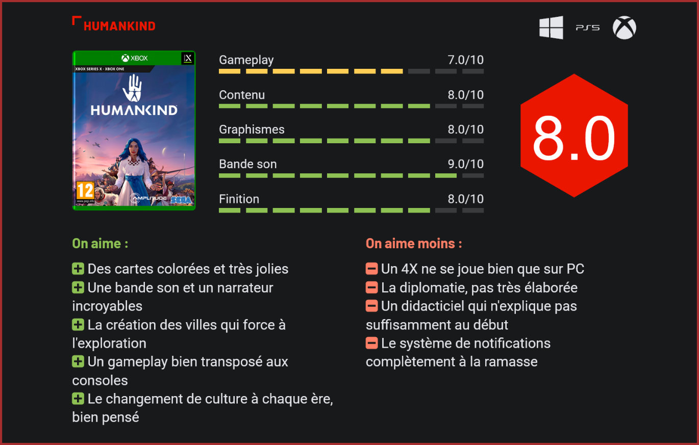 Deux ans tout pile après sa sortie sur PC, le 4X des Français d’Amplitude, Humankind, fait son arrivée sur consoles. L’occasion de découvrir celui qui est devenu une référence du genre. Dire que Humankind nous avait plu à sa sortie en 2021 est un euphémisme. Avec des ambitions hors-normes, le titre parvient sans peine à faire de l’ombre à la cultissime franchise créée par Sid Meier, Civilization. Quoi de plus normal donc que les développeurs tentent de s’aventurer sur consoles, et faire découvrir leur jeu de stratégie à un nouveau public. Pour un test plus complet, nous ne pouvons donc que vous renvoyer vers le test de la version PC. Si vous n’êtes pas habitué aux 4X, l’interface de Humankind peut vite vous paraître confuse. Un didacticiel a d’ailleurs été savamment élaboré par les développeurs pour initier les néophytes au genre. Malheureusement, on lui reprochera de n’aborder les choses qu’à moitié et de ne pas suffisamment accompagner le novice dans ses premières heures de jeu. En revanche, pour les habitués du 4X et notamment de Civilization, les similitudes sont flagrantes et les joueurs se retrouveront très vite en terrain conquis. En parlant de conquête, abordons l’essence même du jeu : la création d’un empire. Lors du lancement de notre partie, une chose nous saute aux yeux. Il nous est en effet impossible d’incarner un dirigeant historique. Si, de prime abord, l’on est un peu déçu de ne pas pouvoir lâcher des bombes atomiques en contrôlant Gandhi, on se rend vite compte que c’est loin d’être une tare. On possède notre propre avatar qui nous suit dans toutes nos parties, et que l’on peut intégralement personnaliser. Plusieurs modèles sont proposés, mais c’est bien plus exaltant de créer son propre dirigeant de A à Z. La création de l’avatar tranche radicalement avec le choix de dirigeant de Civilization. On entre ensuite dans le vif du sujet. La partie commence, et plusieurs choses nous sautent alors aux yeux. L’interface est très proche de celles des autres titres d’Amplitude, Endless Space en premier, ce qui n’est absolument pas pour nous déplaire. Très épurée, mais également très complète, on retrouve très vite et très facilement l’information recherchée en un ou deux clics. Vous vous retrouvez donc sur la carte du monde, à la tête d’un unique éclaireur. Contrairement à un Civilization où vous vous placez où vous le souhaitez et établissez les prémices de votre empire, le début de Humankind est plus réfléchi. Certes, vous débutez dans les deux avec un éclaireur (ou un colon, dans le cas de Civ). Mais ici, vous devrez attendre avant de construire votre empire, en récoltant votre première étoile d’ère. Une fois obtenue votre première étoile d’ère, vous pourrez choisir votre culture, une des grandes forces de Humankind. Si Civilization vous laisse choisir un empire qui vous accompagnera tout au long de votre partie, Humankind joue la carte inverse en débutant la partie sans culture et en pouvant en adopter une nouvelle entre chaque ère. Un concept plutôt séduisant, puisqu’il permet autant d’approfondir une culture durant toute une partie (avec la transcendance, qui booste vos expériences) que de changer de culture entre chaque ère et donc de goûter à tous les types de gameplay. Le principe reste évidemment le même que sur consoles : une culture différente à choisir à chaque nouvelle ère. Si la création d’avant-postes est un moyen pour étendre votre empire, la guerre reste la principale façon de parvenir à vos fins. Le système est ici une franche réussite, puisque Humankind ne propose des petits affrontements expéditifs entre deux unités ennemies. A la place, vous aurez la possibilité de mener des combats au tour par tour avec une quantité d’unités bien plus importante. Si vous désirez notamment attaquer des ennemis en bien plus grand nombre que vous et que vous disposez de renforts non loin de là, ceux-ci prendront automatiquement part au combat. Lors de la prise des cités, Humankind s’inspire d’un certain Total War, avec la possibilité de passer en état de siège pour permettre à vos unités de construire un bélier ou des échelles. C’est donc là une très agréable surprise, puisque les combats prennent une place plus importante que ce qu’ils n’ont dans Civilization. Evidemment, vous ne pourrez pas mener vos guerres tout seul. C’est pourquoi la diplomatie reste le meilleur moyen de vous faire des alliés qui viendront à votre secours sur le champ de bataille. Comme de tradition, les habituelles alliances sont de la partie, tous comme les traités de commerce ou de laissez-passez. Si, dans le fond, Humankind regorge de bonnes idées, on regrettera qu’elles ne soient pas suffisamment bien exploitées, la faute notamment à une IA qui réagit bizarrement. Si la politique extérieure est importante, celle de l’intérieur du pays l’est encore plus. Outre les traditionnelles technologies à rechercher et la religion que vous pouvez créer, un système politique fait son apparition. Très rafraîchissant, celui-ci impacte de près ou de loin la vie de vos citoyens. Chaque loi peut être adoptée d’une manière ou d’une autre avec un impact sur le type de politique que vous menez : interventionniste, conservatisme, libérale… Le tout est plutôt bien fichu et s’inspire très librement de ce qu’Amplitude proposait déjà dans ses Endless Space, où la politique prenait une place très importante. Le gameplay n’est absolument pas idéal pour un contrôle au pad. Tout est perturbant, jusqu’au déplacement des unités. Avec ce portage consoles, c’est tout un gameplay qu’Amplitude s’est vu forcé de revoir. Humankind, c’est une multitude de menus et d’unités à gérer, d’où l’importance d’habilement configurer les commandes. Malheureusement, n’est pas Firaxis avec Civilizati