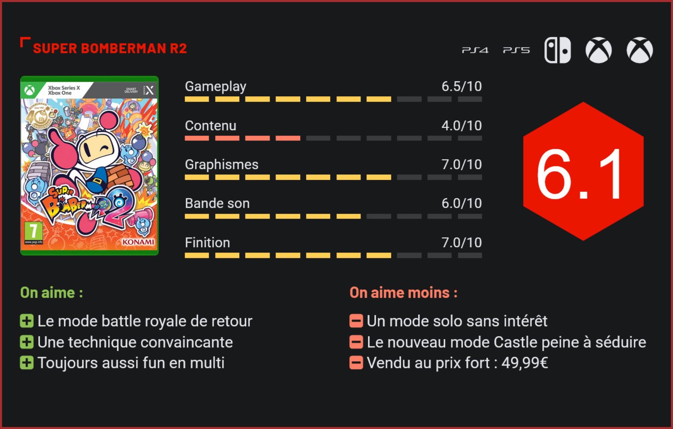 Après un Super Bomberman R décevant et un spin-off multijoueur free-to-play mort-né, Konami tente une nouvelle fois de remettre au goût du jour sa série des Bomberman sur consoles. Le résultat n’est toutefois pas vraiment à la hauteur… Vous vous souvenez peut-être de Super Bomberman R, le dernier reboot en date de la série des Bomberman. Si son mode solo avait eu beaucoup de mal à convaincre les joueurs, la faute à un manque flagrant d’ambition et une formule il est vrai avant tout pensée pour le multijoueur, cet épisode avait au moins eu le mérite de remettre la série au goût du jour avec des visuels modernisés et quelques petites nouveautés aussi côté gameplay. L’édituer Konami s’était d’ailleurs basé sur ce volet pour proposer quelques mois plus tard un spin-off free-to-play entièrement multijoueur. Et il faut bien l’avouer, la formule battle-royale nous avait agréablement séduit. Moins d’un an après sa sortie, le titre avait toutefois tiré sa révérence. Konami nous propose aujourd’hui un nouvel épisode qui réunit le meilleur des deux mondes avec une suite à Bomberman R qui intègre un mode battle royale et introduit de nouveaux mécanismes de jeu en solo. Les nouveaux mécanismes de construction de base ont beaucoup de mal à convaincre. Il ne faudra en soi pas s’attendre à de gros changements en-dehors du mode solo puisqu’on retrouve l’inévitable mode multi sur un seul écran et le mode battle royale en ligne qui confronte 64 joueurs. Le jeu se révèle extrêmement séduisant à plusieurs avec ses tableaux qui confrontent plusieurs joueurs dans une même aire de jeux et leur demande de s’entretuer pour que le nombre total de participants baisse de partie en partie jusqu’à ce qu’un seul survivant reste debout. Les combats sont explosifs, captivants même, et il faut bien avouer qu’on enchaine vite les parties, d’autant plus que cet épisode propose du cross-play et dispose d’une solide base de joueurs. L’ennui, c’est qu’aussi réussi soit ce mode multijoueur, il n’en reste pas moins une copie complète du mode battle royale de Super Bomberman R Online, un épisode entièrement free-to-play… Et que du côté du solo, on n’avance pas forcément dans la bonne direction… La partie multijoueur du jeu est toujours aussi réussie. Ceux qui s’attendaient à un retour aux sources pour le mode solo du jeu seront déçus. Certes, le mode solo du précédent volet n’était pas forcément une grande réussite, mais il avait au moins le mérite de tenter de réimaginer la formule des premiers épisodes. Le mode solo de ce Bomberman R 2 repart pratiquement d’une feuille blanche en proposant d’explorer des planètes pour récupérer des Ellons (des petites créatures bleues) en explosant des blocs… Plus vous débloquerez d’Ellons, plus vous pourrez progresser dans la planète… Qui s’apparente à une sorte de mini open-world qui comprend aussi bien des plaines que des zones de jeu un peu plus labyrinthiques dans lesquelles semblent évoluer sans aucun but des ennemis qui semblent dépourvus de toute forme d’intelligence. Pour tout vous dire, il ne vous sera même pas nécessaire d’affronter les créatures rencontrées dans ce mode solo si vous le souhaitez puisqu’il est tout à fait possible de les éviter soigneusement… Les séquences d’exploration sont entrecoupées de quelques “énigmes” ou “challenges” sans grand intérêt et de combats qui prennent une forme très différente de ce qu’on avait pu voir dans le multijoueur puisqu’ici il s’agira de construire une base comme dans un tower-defense, d’intégrer divers éléments comme des blocs, des murs, des canons, des téléporteurs, pour ralentir la progression des ennemis qui tenteront de venir vous dérober vos clés. Si toutes les clés vous sont enlevées avant la fin du temps imparti, et les coffres ouverts, la partie se termine sur un fiasco. Inversément, si vous tenez face aux droïdes qui vous assaillent, vous remportez la partie… Le concept aurait pu être séduisant. Dans la pratique toutefois, on se rend très vite compte que Bomberman et “tower defense “ne font pas forcément bon ménage. A l’écran, c’est le foutoir, l’IA des adversaires est médiocre, et surtout, il est très difficile de construire des défenses sur une surface de jeu qui est déjà saturée d’éléments… A quatre joueurs, le jeu est toujours aussi fun. Difficile donc d’accrocher à un mode solo qui s’éloigne beaucoup trop du concept original du jeu et qui se révèle surtout atrocement répétitif dans sa structure. On le sent, Konami est à court d’idées. Si, dans le fond, l’éditeur a raison de tenter de nouvelles formules avec sa franchise, on aurait en définitive clairement préféré une succession de défis à ce curieux mélange de genres qui ne fonctionne absolument pas en solo. En multijoueur, Bomberman R2 est nettement plus efficace mais la plupart des éléments du jeu sont hérités du free-to-play. Il est en ce sens assez pénible de devoir redébourser 49,99€ tout de même pour pouvoir rejouer à cet excellent mode de jeu qui était “offert” dans un jeu gratuit précédemment. D’autant plus que les quelques ajouts de modes alternatifs comme le mode Château, qui repose sur les mêmes mécanismes que celui des séquences d’attaque et de tower-defense du mode solo, ou le mode collecte de cristaux, n’apportent pas grand chose… Konami n’a d’ailleurs pas hésité à dénaturer jusqu’au bout sa licence en dotant son Bomberman d’une floppée de nouvelles formes d’attaques. Outre le coup au corps à corps et l’utilisation de bombes (upgradables avec les power-ups), notre cher Bomberman peut désormais déployer une onde de choc autour de lui ou tirer au laser dans une direction… Pas sûr que les fans soient ravis car cela dénature complètement le gameplay du jeu. Et justement