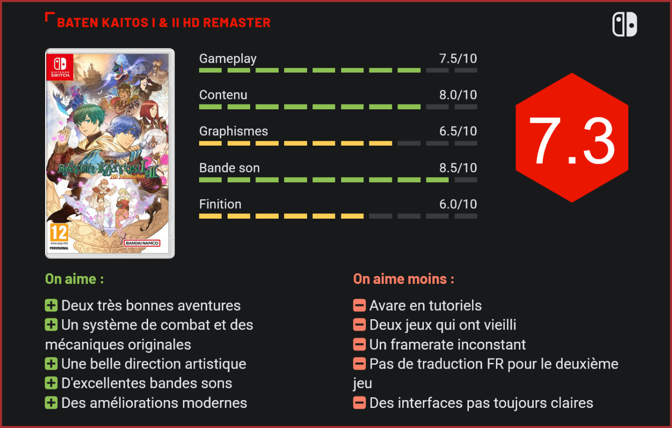 Bandai Namco nous propose des versions remasterisées de l’un des premiers jeux de Monolith Soft, accompagné de sa préquelle. Alors restée sur Gamecube, l’intégralité de la licence Baten Kaitos est désormais disponible sur Switch dans cette compilation “Baten Kaitos I & II HD Remaster”. Souvent cité parmi les très bonnes exclusivités de la Gamecube, Baten Kaitos est une licence peu connue qui refait surface en ce mois de septembre. Les deux jeux qui composent cette série ont été développés par tri-Crescendo en collaboration avec Monolith Soft, les développeurs japonais à qui on doit aujourd’hui les jeux Xenoblade. Le premier Baten Kaitos fêtera bientôt les 20 ans de sa sortie originale au Japon. L’occasion pour Bandai Namco de proposer une collection de remaster en exclusivité sur Switch qui regroupe les deux épisodes de la licence. “Baten Kaitos : Les Ailes éternelles et l’Océan perdu” est ainsi proposé avec sa préquelle “Baten Kaitos Origins”, cette dernière est disponible pour la première fois en Europe. Les décors que l’on traverse sont très charmants. La série se déroule dans un univers où les humains possèdent des ailes et habitent sur des îles flottantes. Dans le premier jeu, nous suivons les aventures d’un jeune homme nommé Kalas qui est à la poursuite de l’Empire dans une quête de vengeance. Ce dernier va rencontrer tout un tas de personnages et l’aventure va impliquer un dieu maléfique scellé 1000 ans avant les évènements de cet épisode. Baten Kaitos Origins, lui, se déroule 20 ans avant et démarre par notre protagoniste, Sagi, prenant part à une mission pour assassiner l’empereur. Chose originale, dans les deux titres, nous incarnons en réalité un esprit qui suit les protagonistes, l’occasion de briser le quatrième mur et de nous impliquer un peu plus directement puisque nos choix ont un impact sur le gameplay. Si la structure des jeux est très classique et fait penser à la majorité des JRPG de l’époque, plusieurs mécaniques sont exploitées de manière plus originale. Leurs systèmes de combat se démarquent aussi drastiquement de leurs concurrents. Les deux titres proposent des combats au tour par tour où nos actions sont effectuées grâce à des cartes : les “Magnus”. Ces dernières doivent être organisées dans un deck avant de combattre et couvrent de nombreux cas de figure. Certaines cartes permettent d’attaquer, d’autres de se défendre, de lancer des sorts magiques, mais certaines sont aussi des objets aux effets divers. Il faut alors les utiliser au mieux durant les combats en priant pour que la chance nous donne ce dont on a besoin. Le système de combat est complexe et original. Cet aspect Deckbuilder est de retour dans le second jeu qui propose une approche un peu plus dynamique puisque les combats sont plus proches du temps réel. Les deux systèmes de combat sont riches et originaux, mais malheureusement très difficiles à cerner sans aide extérieure. Le titre propose des tutoriels écrits à aller chercher dans les dialogues des personnages non-joueurs ou dans les menus des jeux, mais dans les deux cas, il est difficile de comprendre toutes les subtilités. Les deux titres restent des jeux qui datent d’une vingtaine d’années et qui n’avaient probablement pas le budget de ce qui se faisait de mieux à l’époque. La mise en scène est particulièrement vieillotte, les environnements se traversent avec une caméra fixe et les dialogues entre les personnages sont rarement mis en scène. Évidemment pas à la hauteur des standards actuels, ces remasters parviennent cependant à faire briller la direction artistique très particulière du jeu. Il est cependant dommage de voir que les deux titres ne parviennent pas à garder une fluidité parfaite. Certaines petites zones affichent un 60fps parfait, mais elles se font trop rares. Les combats du deuxième jeu se déroulent un peu plus en temps réel. En plus d’un travail visuel et d’un passage en 16:9, cette remasterisation embarque de toutes nouvelles options pour rendre l’expérience plus agréable et qui sont les bienvenues. Il est alors possible d’accélérer la vitesse du jeu, de ne pas déclencher de combat au contact des ennemis, de laisser l’ordinateur gérer entièrement les combats ou encore de tuer nos adversaires en un coup. Des ajouts qui peuvent fluidifier une expérience qui est parfois un peu lente et un peu corsée. Certes, il y a eu du travail, mais il n’est pas difficile de remarquer que d’autres ajouts essentiels manquent à ces versions HD. À commencer par l’absence de traduction française des textes de Baten Kaitos Origins. Le premier jeu, lui, est bel et bien traduit dans la langue de Molière, mais pas le second qui se contente sans doute de nous resservir la version américaine de l’époque. Nous pensons également aux interfaces qui ont pourtant été retravaillées, mais qui ne sont pas toujours très pratiques. Les deux jeux sont doublés en japonais uniquement, et proposent des musiques très mémorables. On doit ces bandes sons à Motoi Sakuraba, le compositeur derrière les musiques de nombreux jeux Tales of, Dark Souls et bien d’autres JRPG. Malgré plusieurs soucis, Baten Kaitos I & II HD Remaster propose tout de même de retrouver deux titres de qualité qui n’avaient jamais été réédités. Deux aventures prenantes et particulièrement longues qui demandent une bonne cinquantaine d’heures chacune pour en faire correctement le tour. Le résultat manque de finition, mais cette version permettra à de nombreuses personnes de découvrir ces pépites méconnues. Conclusion Presque 20 ans après la sortie originale du premier jeu, la licence Baten Kaitos refait surface dans une compilation contenant les deux jeux. Baten Kaitos I & II HD Remaster propose de revivre les deux aventures de tri-Crescendo et Monolith Soft. Seule la Switch a le droit à cette com