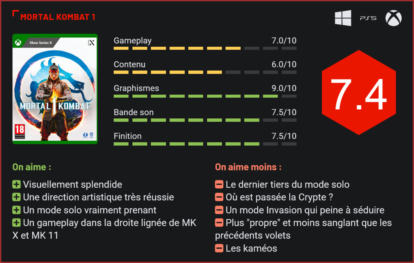 Après quatre longues années de développement, le nouveau Mortal Kombat est enfin là. Et s’il s’agit de la suite directe de Mortal Kombat 11, le jeu est en réalité un reboot complet pour l’univers d’Ed Boon. Explications. Acclamés par les critiques, Mortal Kombat 9, X et Mortal Kombat 11 étaient parvenus à redresser une série qui avait depuis des années perdu son aura. Beaucoup s’interrogeaient donc sur les raisons qui avaient bien pu pousser NetherRealm à prendre des risques avec sa franchise en nous livrant un reboot de la saga. Que les fans se rassurent toutefois, Mortal Kombat 1 n’est pas un reboot complet de Mortal Kombat mais davantage un “soft reboot”. La narration est soignée avec de nombreuses cinématiques dignes d’un film à gros budget. Sur le plan narratif, le jeu prend place juste après les événements de Mortal Kombat 11. Liu Kang, le gardien du temps, a refaçonné un univers dans lequel il espère voir prospérer les différentes factions en parfaite harmonie. Les habitudes ont toutefois la dent dure. Et si dans ce nouveau monde, la paix règne entre la Terre et l’Outre Monde, cela n’empêche pas les deux mondes de se livrer régulièrement des combats à travers un tournoi régulièrement organisé entre les deux factions. Liu Kang recrute donc quatre combattants pour aller affronter les armées de l’Outre Monde. Un seul d’entre eux aura la possibilité d’affronter les quatre champions de la faction adverse. S’il remporte le défi, la victoire devrait dissuader les commandes de l’Outre Monde à lancer une offensive contre la Terre. Très vite, il apparait toutefois qu’un bug s’est infiltré dans la matrice… Visuellement, le jeu est une totale réussite. On le sent dès les premières minutes du jeu, NetherRealm a mis le paquet pour ce “reboot” sur le plan narratif avec un mode solo costaud (comptez 6 à 7h pour en venir à bout), très joliment mis en scène avec de nombreuses cinématiques de grande qualité et un scénario vraiment accrocheur (pour les 2 premiers tiers de l’aventure tout du moins). On sent que des moyens considérables ont été déployés, au point qu’on a souvent l’impression d’être littéralement face à un film interactif. On aurait frôlé la perfection si le studio ne s’était pas raccroché à une intrigue du multivers qui part totalement en cacahuète dans son dernier tiers… Et c’est bien dommage car le potentiel d’un excellent jeu était là. NetherRealm ne s’est d’ailleurs pas contenté de repartir d’une feuille blanche pour ce scénario, qui prend soin de réintroduire chacun des personnages principaux de la saga. Ceux-ci ont eu droit à un lifting intégrale, globalement très réussi. On le sent, le studio n’a pas hésité à prendre des risques, quitte à s’embrouiller avec ses fans. Et cela fait plutôt plaisir à voir car la série s’offre une véritable cure de jouvence. Au niveau du casting, il y aura forcément des déceptions. Ce nouvel épisode n’intègre qu’une vingtaine de personnages jouables à la sortie, ce qui est assez léger tout de même. On pourra par exemple lui reprocher de ne pas permettre de jouer Sonya Blade ou Jaxx, deux personnages pourtant cultes de la saga. Les invités arriveront eux plus tard avec le Season Pass… Les décors surprennent avec des environnements très colorés. Autre énorme prise de risque du studio : MK1 n’est pas un jeu cross-gen contrairement à la plupart des grosses productions encore commercialisées aujourd’hui. Ce qui signifie que sur consoles, vous ne pourrez y jouer que sur Xbox Series et PS5. Pas sur Xbox One et PS4. Et autant vous dire que ça se ressent car techniquement, le jeu nous met une claque intégrale. Il tourne non seulement en 60 FPS sans sourciller mais en plus offre un niveau de détails jamais vu dans un jeu de combat. Les panoramas sont à couper le souffle, les effets visuels splendides et les modélisations des personnages fourmillent de détails (jusqu’aux grains de la barbe!). MK 1 est tout simplement le plus beau jeu de baston créé à ce jour. Le jeu est toujours sanglant, mais peut-être un peu moins que ses prédécesseurs… Enfin, les fans de Mortal Kombat seront également surpris de découvrir un univers beaucoup plus coloré que dans les précédents volets. Les décors sombres des précédents volets ont été remplacés par des décors féériques de l’outre-Monde. Et même si on ne s’y attendait pas vraiment, il faut bien reconnaitre que le résultat est très convaincant. D’autant plus qu’on dénombre en tout près d’une vingtaine d’arènes tout de même. Tout cela, c’est bien beau, mais quid des défauts? C’est cette fois plutôt au niveau du contenu, du gameplay et des modes de jeu que le bas blesse. Si on n’a pas grand chose à reprocher au mode solo, si ce n’est sa fin – qui ne laisse pas beaucoup de possibilités pour une suite… – on déplore la disparition de la Crypte. Le mode de jeu qui le remplace se nomme “Invasion”. Il se présente comme une sorte de jeu de plateau à la Mario Party. Le joueur évolue dans un univers graphique de case en case et enchaine défis et combats. Entre les combats, il a la possibilité de dépenser ses crédits pour des buffs ou des objets qui lui seront utiles dans les combats. Le concept est original, mais atrocement répétitif. Le mode Invasion est la grosse déception du jeu. Ajoutez à cela trois monnaies ingame, des tas de paywall et du grinding à outrance pour l’acquisition de skins, et vous comprendrez que la formule de ce nouveau Mortal Kombat ne plaira certainement pas à tous. Beaucoup de joueurs lui reprocheront d’ailleurs aussi son manque d’inspiration au niveau des modes alternatifs avec un mode Tour qui s’apparente à un mode Arcade, un matchmaking douteux, et des tas de fonctions manquantes. Impossible par exemple de changer le style vestimentaire de son personna