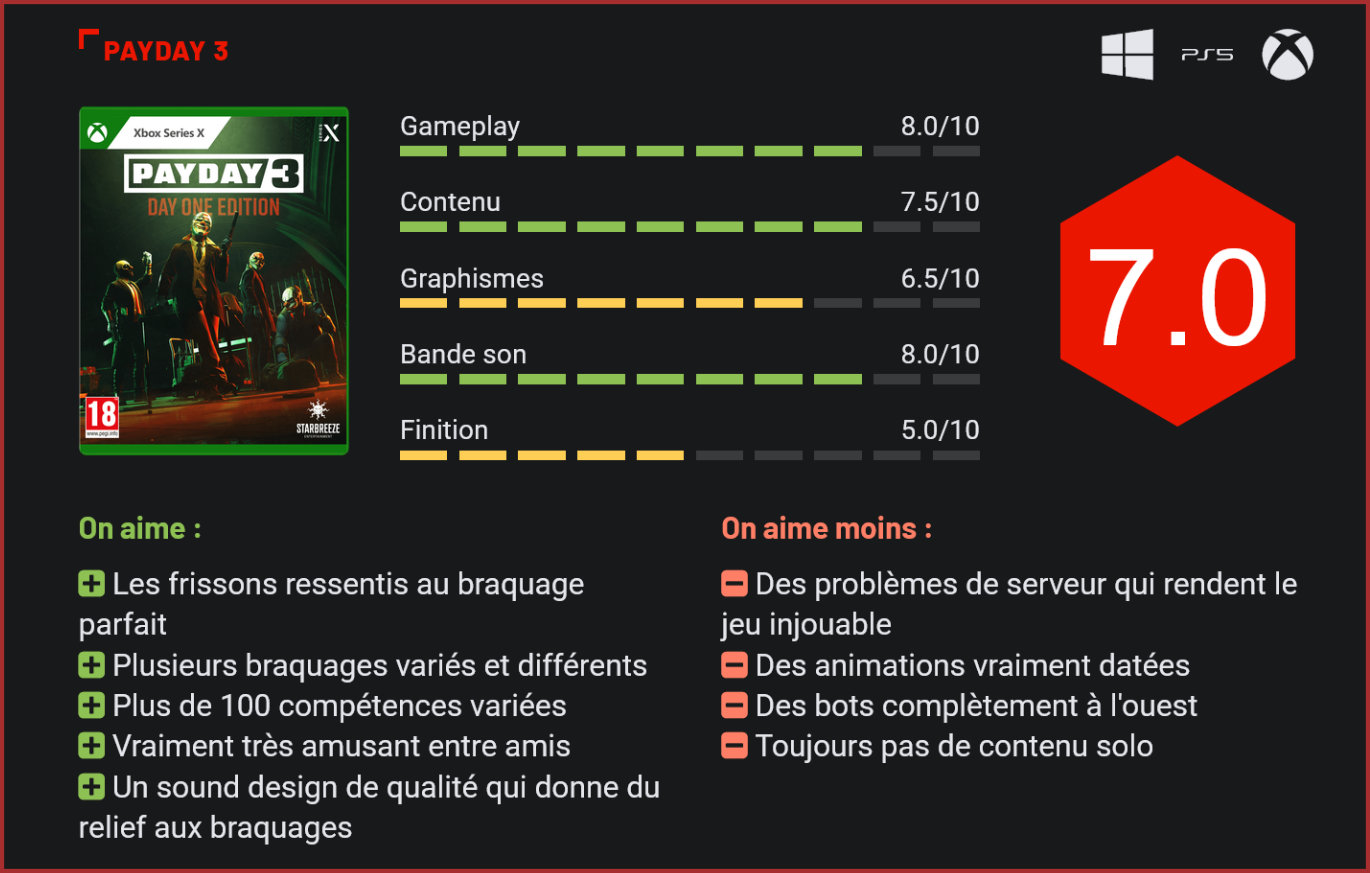 L’air de rien, Payday 3 est probablement l’un des titres les plus attendus de ces dernières années, 10 ans après un second épisode qui avait enchanté les fans. Mais Payday 3 sera-t-il en mesure de combler les attentes des joueurs ? Il y a quelques années, peu de joueurs auraient parié sur le fait que Payday 3 soit commercialisé un jour ou l’autre. Quatre ans après la sortie de Payday 2, Starbreeze Studios confirmait le début du développement d’un troisième épisode de licence, tout en précisant que les développeurs allaient prendre leur temps pour fournir aux joueurs l’expérience de jeu tant espérée. De 2017 à 2021, le titre ne fera plus jamais parler de lui, jusqu’à ce que le studio confirme que le jeu sortirait deux ans plus tard, soit en 2023. Nous y sommes enfin, l’occasion donc de mettre la main sur ce titre énormément attendu par les amateurs de la franchise. Une attente énorme créée autour d’un titre est à double tranchant. Les développeurs peuvent ainsi s’attendre à d’excellentes ventes à la sortie du titre, à condition que les critiques soient positives. Si c’est le contraire, Payday 3 pourrait être un véritable fiasco sonnant probablement le glas de la franchise. Une semaine exactement après la sortie du titre, on semblait s’orienter vers le second scénario. Le gameplay est presque irréprochable, nous allons en parler, mais c’est plutôt les serveurs qui sont pointés du doigt, incapables de gérer l’afflux de joueurs que les développeurs auraient dû prévoir à la sortie. Les jours qui ont suivi la sortie du titre seront catastrophiques pour Starbreeze Studios. Des milliers de joueurs se retrouvent dans l’incapacité de lancer un matchmaking en public, problème auquel nous avons également dû faire face. Les développeurs ont promis de rétablir la situation, ce qu’ils ont fait, mais c’était trop tard. Sur Steam, le titre obtient même plus de 27.000 avis plutôt négatifs. Tous ou presque pointent du doigt le manque de stabilité des serveurs. Les braquages nous emmènent d’une bijouterie à un pont en passant par une discothèque. Qu’à cela ne tienne, les serveurs ont été mis à jour et sont désormais en mesure d’assumer le nombre de joueurs présents, même s’il ne serait pas étonnant qu’une bonne partie des acheteurs Day One aient décidé de boycotter le titre après le chaos des débuts. C’est d’ailleurs une des raisons qui plaide en défaveur de l’absence de contenu solo. Si les développeurs en avaient proposé un, on aurait probablement pu éviter les scandales liés aux serveurs. Une fois que l’on est parvenu à se connecter à une partie, c’est un tout autre monde qui s’offre à nous. Comme dans les deux précédents opus, Payday 3 nous propose d’intégrer le monde du braquage par équipes de quatre et d’infiltrer des banques, bijouteries ou tout autre lieu où un pactole peut être récupéré. C’est dans la diversité de ses missions que Payday 3 se démarque véritablement. Braquage d’un fourgon blindé sur un pont, récupération d’un portefeuille-crypto dans une discothèque ou encore braquage traditionnel d’une bijouterie, les (seulement) huit missions proposées au lancement sont très variées, bien que peu nombreuses. Les développeurs ont annoncé du contenu post-lancement, qui ne devrait être que cosmétique, même si l’on espère l’une ou l’autre mission en plus. Graphiquement, le titre nous transporte dans divers univers, permettant un level design assez inspiré et, là aussi, varié. Dans la discothèque, par exemple, on peut emprunter des bouches d’aération pour se déplacer à l’abri des regards et accéder à des lieux non autorisés, comme la loge du DJ qu’il faut capturer. Level design inspiré, mais également des graphismes de qualité. Clairement, Payday 3 est le titre le plus inspiré et joli de la série. Heureusement nous direz-vous, le second opus étant sorti il y a de ça dix ans. Et pourtant, s’il est agréable pour la rétine, Payday 3 reste largement en deçà de ce qui est proposé de nos jours sur PS5, Xbox Series et PC. Le constat est d’autant plus saisissant lorsque l’on s’attarde aux animations des PNJ, très datées. Visuellement, Payday 3 est indéniablement le plus bel épisode de la franchise. Il n’en reste pas moins en retard sur son temps. Si la patte visuelle du titre peut nous laisser sur notre faim, c’est surtout le sound design qui est impressionnant. Musicalement, les mélodies sélectionnées par Starbreeze sont toutes impeccables, jamais à côté de la plaque. D’inspiration électronique, elles apportent énormément aux phases de tir, les dynamisant et sublimant le gameplay. Le gameplay, attardons-nous-y justement. Très clairement, si vous aviez joué aux deux précédents opus, la forme reste exactement la même. Vous débutez comme un civil en repérage sur les lieux du braquage, puis mettez votre masque et procédez au crime. Une fois la police débarquée sur les lieux, vous vous défendez à coups de munitions puis vous échappez avec votre butin, représentant plusieurs centaines de milliers de dollars. Dans le fond, c’est tout autre chose, puisque les développeurs ont totalement modernisé le tout. Il faut savoir qu’il est désormais possible de conclure un braquage en restant entièrement furtif ou en se la jouant braqueur du dimanche et en tirant à tout-va. Les phases en mode civil sont d’ailleurs plutôt bien pensées, nous limitant dans nos actions pour éviter d’attirer l’attention, ce qui peut parfois être frustrant puisque le moindre faux pas douteux peut éveiller les soupçons et déclencher l’alarme. Mais ce qui est le plus satisfaisant, dans Payday 3, c’est certainement de réussir le braquage parfait. Aucune caméra ne vous détecte, les alarmes ne sont pas déclenchées et vous n’avez fait aucune victime. Oui, c’est tout à fait possibl