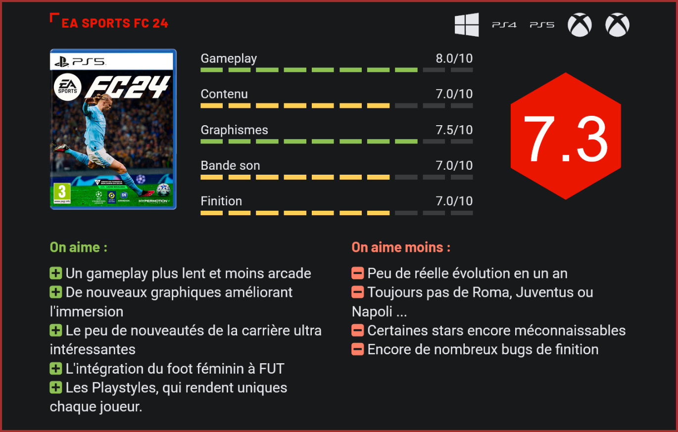 C’est une page importante de l’histoire du jeu vidéo de simulation qui se tourne. EA Sports FC vient remplacer 20 années de jeux vidéo FIFA. L’occasion pour EA Sports d’apporter un vent de fraîcheur à sa franchise … ou pas. FIFA est mort, vive EA Sports FC ! Un an après la fin du contrat entre EA Sports et la Fédération Internationale de Football Association (FIFA, NDLR.), le géant américain du jeu de sport a dû se réinventer. Obligation donc de tirer un trait sur une marque forte, vieille de plus de deux décennies, et de passer à autre chose, avec cette nouvelle franchise qu’est EA Sports FC. Une nouvelle image de marque est généralement l’occasion pour un développeur de repartir sur de toutes nouvelles bases, avec un nouveau gameplay, un moteur de jeu flabmant neuf et une identité propre. N’espérez absolument rien de tout ça avec FC 24, qui n’est tout juste qu’une simple suite à FIFA 23. Le gameplay a quelque peu évolué, comme il le faisait chaque année, et le moteur de jeu est le même. Toutefois, EA Sports a tenté de rafraîchir les châssis avec une nouvelle peinture. Entendez par là qu’on a droit à un tout nouveau menu, bien plus sobre, fonctionnant sur une simple et unique colonne. Il divisera à coup sûr, certains préférant la sobriété et l’efficacité là où d’autres regretteront un menu plus coloré et jovial. Une fois parcouru, on se rend compte que seule la forme a changé, le fond est identique par rapport au titre de l’année passée. Visuellement, FC 24 est très réussi. On apprécie d’ailleurs ces nouvelles cinématiques dans la peau de l’arbitre. Abordons le contenu d’une part. n’espérez absolument pas un nouveau mode exclusif à FC 24. On retrouve les grands habitués de la franchise, à savoir Ultimate Team, les modes carrières, le mode Coup d’Envoi et Clubs Pro. Ultimate Team, pour sa part, accueille une grande nouveauté et non des moindres : l’incorporation des joueuses dans votre équipe de rêve. Hommes et femmes peuvent ainsi composer une équipe mixte, dont il faudra combiner les cartes avec sagesse. Dans le jeu, un joueur possède de meilleurs attributs en force et en physique là où les joueuses sont plus agiles et rapides. Des éléments qui sont donc à prendre en compte dans la composition d’équipe, ce qui ajoute bien plus de profondeur dans la tactique que par le passé. On notera également l’arrivée de l’Evolution. A l’instar des cartes Pokemon, vos cartes dans FUT peuvent être améliorées si elles remplissent certaines conditions. Dans Clubs Pro, c’est l’arrivée du cross-platform sur consoles next-gen qui devrait ravir les amis ne possédant pas la même console. Ainsi, quelqu’un sur Playstation 5 pourra enfin se mesurer à un possesseur de Xbox Series dans ce mode. Du côté de la Carrière, il ne faut absolument pas s’attendre à de grands changements. En tant que manager, vous avez la possibilité de vous retrouver sur le banc pendant un match pour voir vos joueurs évoluer de plus près. L’idée est très bonne et apporte beaucoup d’immersion, même si elle reste fort restrictive. On ne peut par exemple pas bouger la tête ou déplacer l’entraîneur. Pour cette vue, EA Sports gagnerait à s’inspirer des Football Manager, avec la possibilité d’encourager ou de motiver notre équipe, ou encore d’appeler un joueur pour lui donner des consignes. Au lieu de ça, on est assis à regarder le match, rendant le temps parfois très long. L’autre nouveauté assez sympa est l’entraînement bien plus poussé de votre équipe en fonction des postes et des joueurs. Vous pouvez demander à un joueur d’axer son entraînement sur l’endurance ou les performances, recruter différents entraîneurs améliorant vos capacités de préparation ou encore affecter un entraînement à un poste pour que chaque joueur qui l’occupera sache comment évoluer sur le terrain. De nouveaux graphiques en temps réel apportent de nombreuses infos en match et ajoutent en réalisme. La carrière de joueur propose, quant à elle, davantage de nouveautés. Un agent vous accompagne dans votre carrière et cherchera, pour vous, de meilleures opportunités dans d’autres clubs en fonction des objectifs qu’il vous fixera durant la saison. Et plus vous demanderez un salaire élevé, plus vos objectifs seront compliqués à atteindre. Et plus vous remplirez d’objectifs, plus vous aurez de chances d’être nommé pour le Ballon d’Or, dont la licence officielle intègre FC 24 cette année. On regrettera toutefois qu’EA n’ait toujours pas résolu le problème d’absence de licence pour certains clubs ou stades. Le Camp Nou du FC Barcelone pointe ainsi aux abonnés absents, tandis que la Roma, la Juventus, le Napoli ou encore l’Atalanta apparaissent sous forme de club alternatif. Le gameplay est bien plus lent qu’il n’a pu l’être par le passé. En soi, c’est une très bonne chose, puisque EA Sports délaisse quelque peu cet aspect arcade pour revenir à une vraie simulation de foot. Les joueurs sont moins rapides et se déplacent ainsi de manière plus réaliste. Bien évidemment, certains joueurs comme M’bappé ou Haaland sont plus rapides que la moyenne ou les ailiers ont plus de facilité à déborder sur les côtés, mais on sent qu’EA Sports a opéré un sérieux rééquilibrage cette année. L’Hypermotion V améliore nettement la qualité des animations des joueurs, les rendant très réalistes. Avec les styles de jeu, ou Playstyles, vos meilleurs joueurs disposent désormais en match de capacités spéciales à débloquer en fonction des actions réalisées. Cela apporte un côté stratégique aux matchs, bien qu’il puisse totalement les déséquilibrer. Imaginons un match entre Manchester City et le Paris Saint-Germain. D’ordinaire, City possède un effectif, sur le papier, supérieur à celui du PSG. Erling Haaland pourra ainsi posséder l
