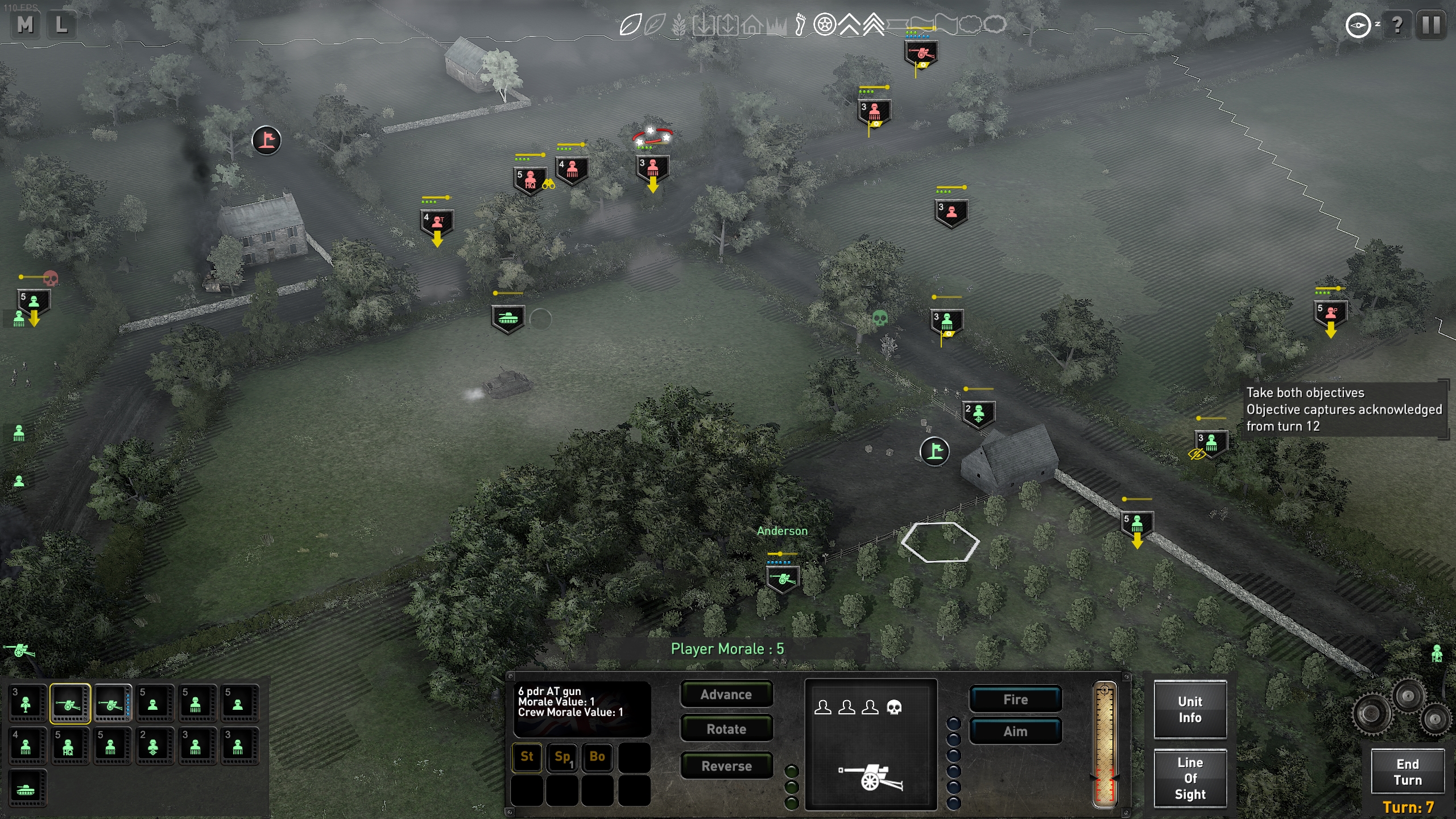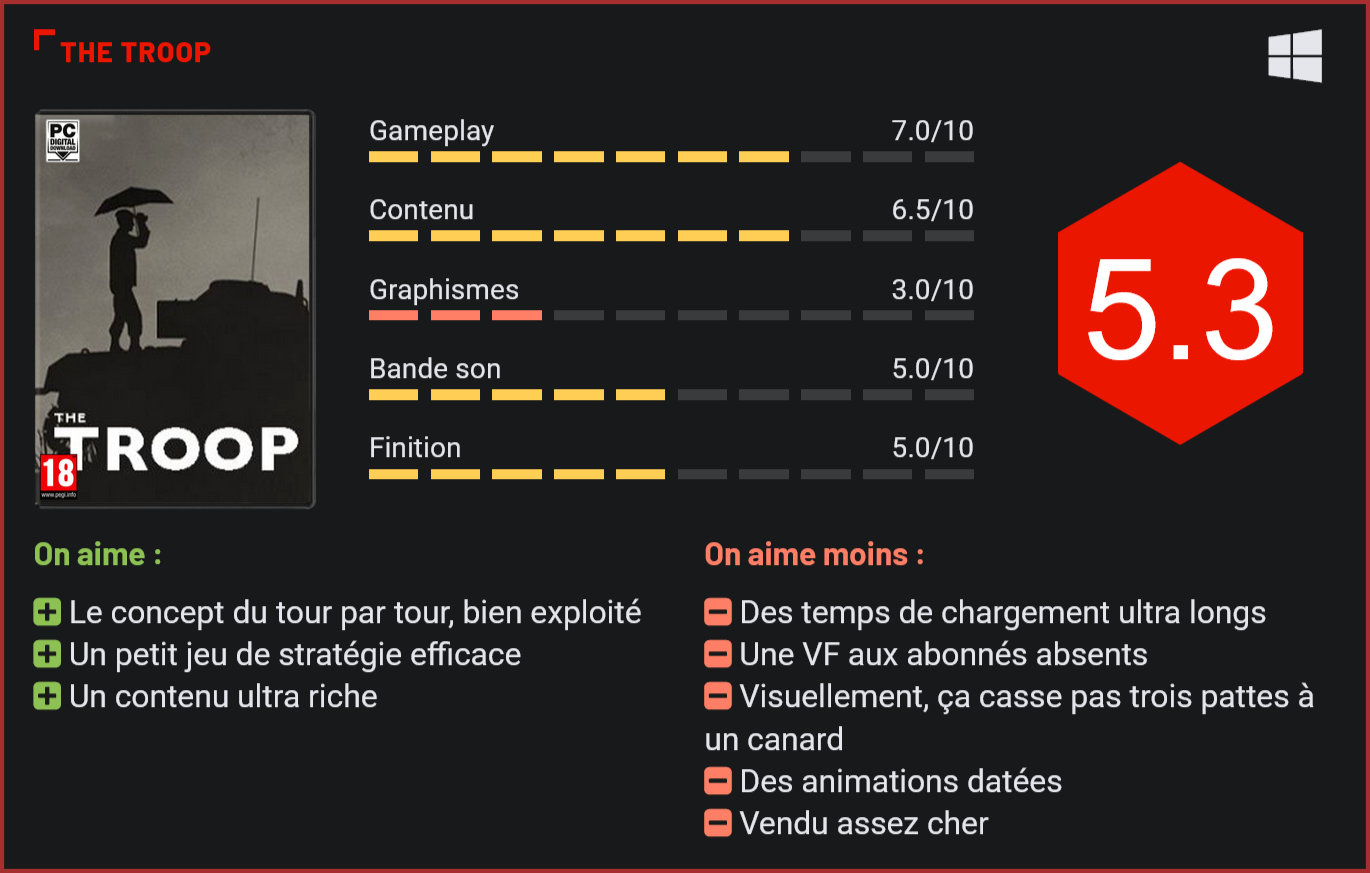 Après près de deux ans d’accès anticipé, The Troop est enfin disponible. Cet hymne au débarquement mené par les Britanniques et les Canadiens est agréable sans pour autant être exceptionnel, loin de là. The Troop a une histoire quelque peu particulière. C’est en décembre 2021 que les studios britanniques Giant Flames et PLA Studios ont levé le voile sur leur première production commune. Spécialisé dans les jeux didactiques et à vocation évaluative, les londoniens de PLA proposent ici une expérience totalement différente, quoique largement orientée sur la découverte d’un pan important de la Seconde Guerre mondiale. “The Troop est un travail d’amour motivé par un intérêt profond pour la Seconde Guerre mondiale. Nous savons qu’il y a beaucoup de gens qui partagent la même passion et dont les commentaires nous aideront à développer l’expérience”, expliquent les développeurs, justifiant l’utilisation d’un système économique basé sur l’early access. Depuis près de deux ans, ceux-ci se basent sur les retours des joueurs pour peaufiner le titre en vue de la grande sortie attendue pour ce 18 octobre. La campagne de The Troop, car oui il y en a une, suit la 8ème brigade blindée des forces du Commonwealth lors du Débarquement du 8 juin 1944 en Normandie. A la tête des Britanniques et des Canadiens, vous vous mesurez aux troupes allemandes sur des théâtres d’opération d’assez petite taille. Son fonctionnement est assez particulier. Vous disposez de 7 missions pour lesquelles vous est attribué un certain “budget”, vous permettant alors d’acheter X unités blindées, d’artillerie ou d’infanterie. Vous n’avez que très peu d’indications sur les troupes ennemies, et devez alors user de stratagème pour savoir quelle combinaison d’unités effectuer. Le champ de bataille est plutôt agréable, avec une chouette idée du tour par tour. Il est d’ailleurs important de noter, comme le rappellent les développeurs, que “les événements décrits s’inscrivent dans la vaste réalité des campagnes historiques, mais les missions elles-mêmes sont fictives et orientées vers un défi agréable plutôt que vers une représentation stricte de l’histoire. Nous espérons seulement rendre justice à l’esprit de ces innombrables mémoires.” Celui qui cherche donc une simulation pure et dure extrêmement fidèle aux événements historiques devra passer son chemin. Outre cette campagne, The Troop dispose d’un mode histoire. Les deux n’ont absolument rien à voir l’un avec l’autre, puisque ce sont ici 36 missions d’une dizaine de minutes chacune qui vous sont proposées, avec des unités déjà attribuées. Des missions qui sont très rapidement réalisées mais à l’intérêt très discutable, puisqu’il faut parfois tout simplement éliminer les unités ennemies. Autre mode important, c’est le mode Skirmish. Dans celui-ci, vous “réécrivez” les batailles présentes dans les autres modes. Vous choisissez quelle force contrôler, soit les Britanniques soit l’Axe, et pouvez imposer des restrictions à l’ennemi. L’avantage ici est que la rejouabilité est presque infinie puisque les troupes ennemies et leur emplacement change constamment. Pour son gameplay, The Troop fait le pari du tour par tour, à la manière d’un XCOM, avec des unités possédant un certain nombre de points d’action. Un déplacement, une rotation, un chargement, un réarmement ou la visée coûtent ainsi chacun plusieurs points d’action. Il faut donc les utiliser avec parcimonie. Visuellement, ce n’est pas trop ça… Les unités sont très vilaines, les effets datés et les textures pixelisées. Les missions sur le champ de bataille sont plutôt sympathiques, bien que peu palpitantes contrairement à un certain Company of Heroes, avec lequel les similitudes sont assez nombreuses. The Troop a assurément quelques bonnes idées, mais certaines petites lacunes dans le gameplay ou encore l’absence d’une traduction francophone viennent noircir le tableau. Les temps de chargement sont également un très gros défaut, puisqu’il faut parfois attendre de très longues minutes avant de commencer une mission. C’est toutefois dans ses graphismes que The Troop présente le plus de défauts. Même s’il est évident que les développeurs n’ont pas les mêmes moyens que les papas de Company of Heroes, soutenus par Sega, le retard visuel est ici flagrant. Les terrains paraissent vides, la modélisation des éléments du décor est peu élaborée ou variée, et les textures manquent de détails. L’animation des unités est, elle aussi, datée, manquant de fluidité… Pour un jeu vendu 34€, on est en droit d’attendre mieux. Conclusion Sans être une catastrophe industrielle, The Troop pâtit principalement d’un manque de moyens de la part de ses développeurs. Comparé, et à juste titre, à XCOM et Company of Heroes, ce jeu de guerre au tour par tour manque de profondeur dans son gameplay, et ce, malgré quelques excellentes idées. L’intérêt, pour les développeurs, n’est pas ici de proposer une pure simulation fidèle aux événements de la guerre. S’il reste proche du conflit mondial, le titre prend quelques libertés dans les petites missions qu’il nous propose. Le contenu est titanesque, avec une histoire riche de 36 missions, une campagne composé de 7 scénarios et un mode “bac-à-sable” rejouable à l’infini. Vendu 34€, The Troop aura du mal à justifier son prix avec son seul contenu. La VF pointe aux abonnés absents, les temps de chargement paraissent interminables et, à notre grand désespoir, les graphismes semblent tout droit venus d’un jeu PS2. Dommage, puisqu’après près de deux ans d’accès anticipé, le titre aurait pu être irréprochable avec davantage de moyens.